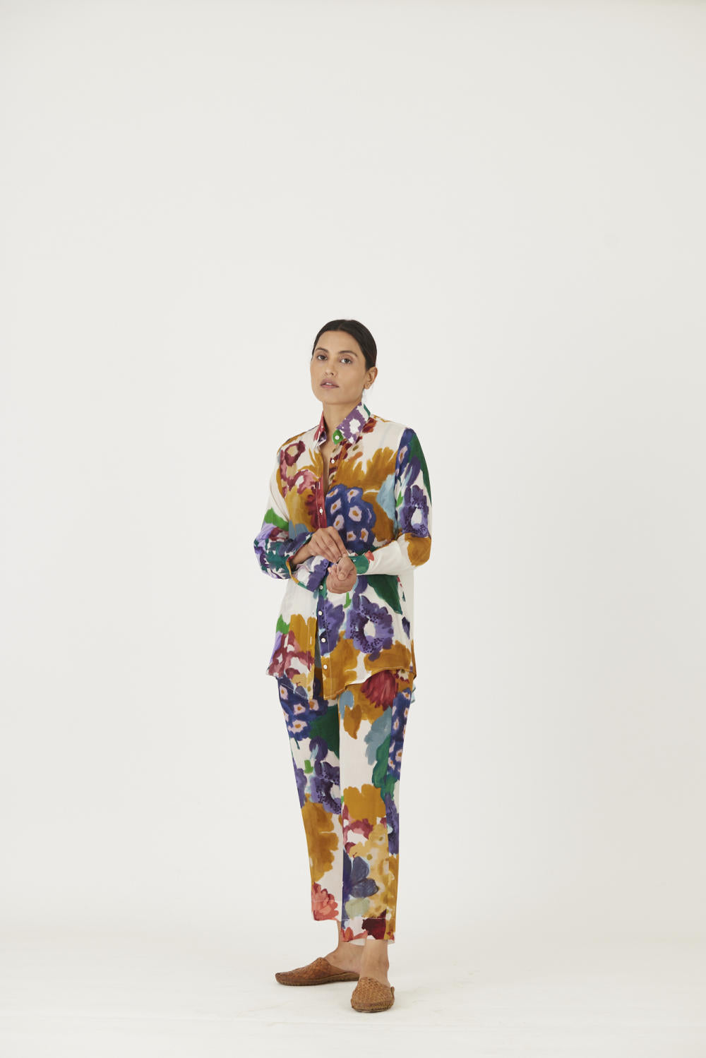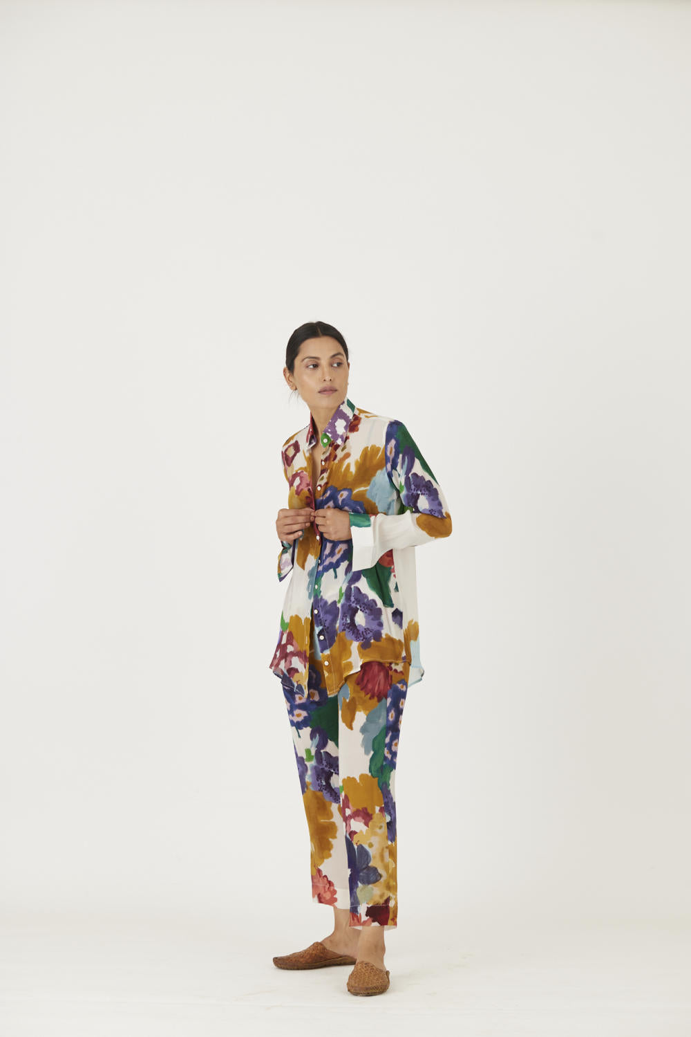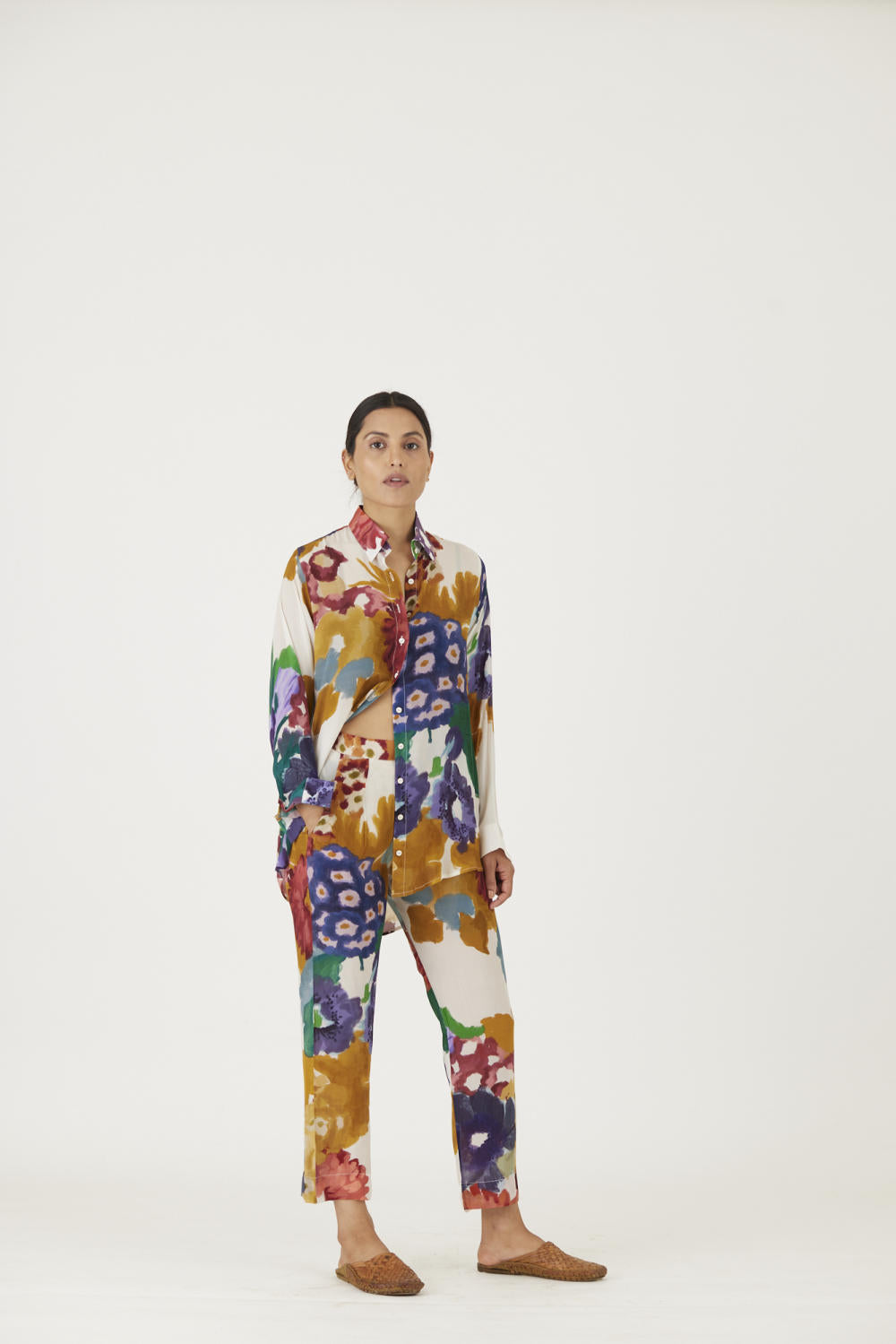 The print features an abundance of roses along with marigolds and jasmines arranged together in a bouquet on summer white base The set is crafted in the Farah print carefully printed on crepe. The set includes a button down shirt with back gathers and straight pants.