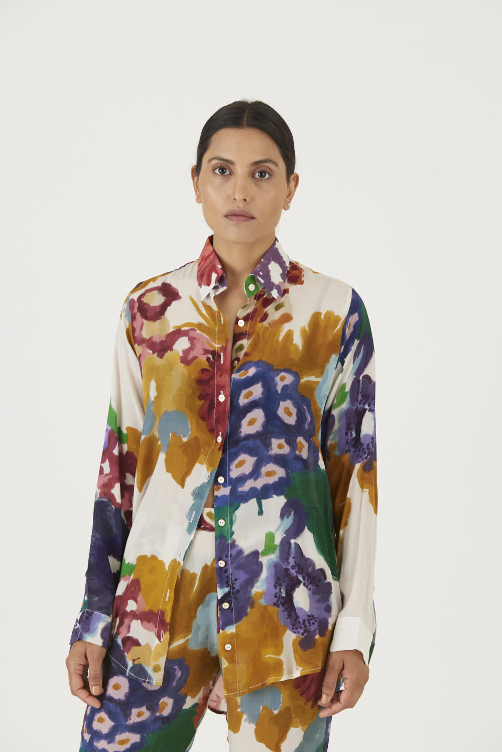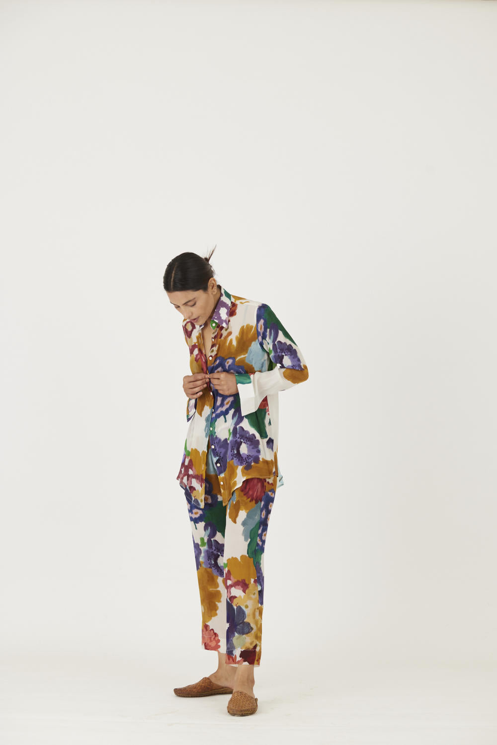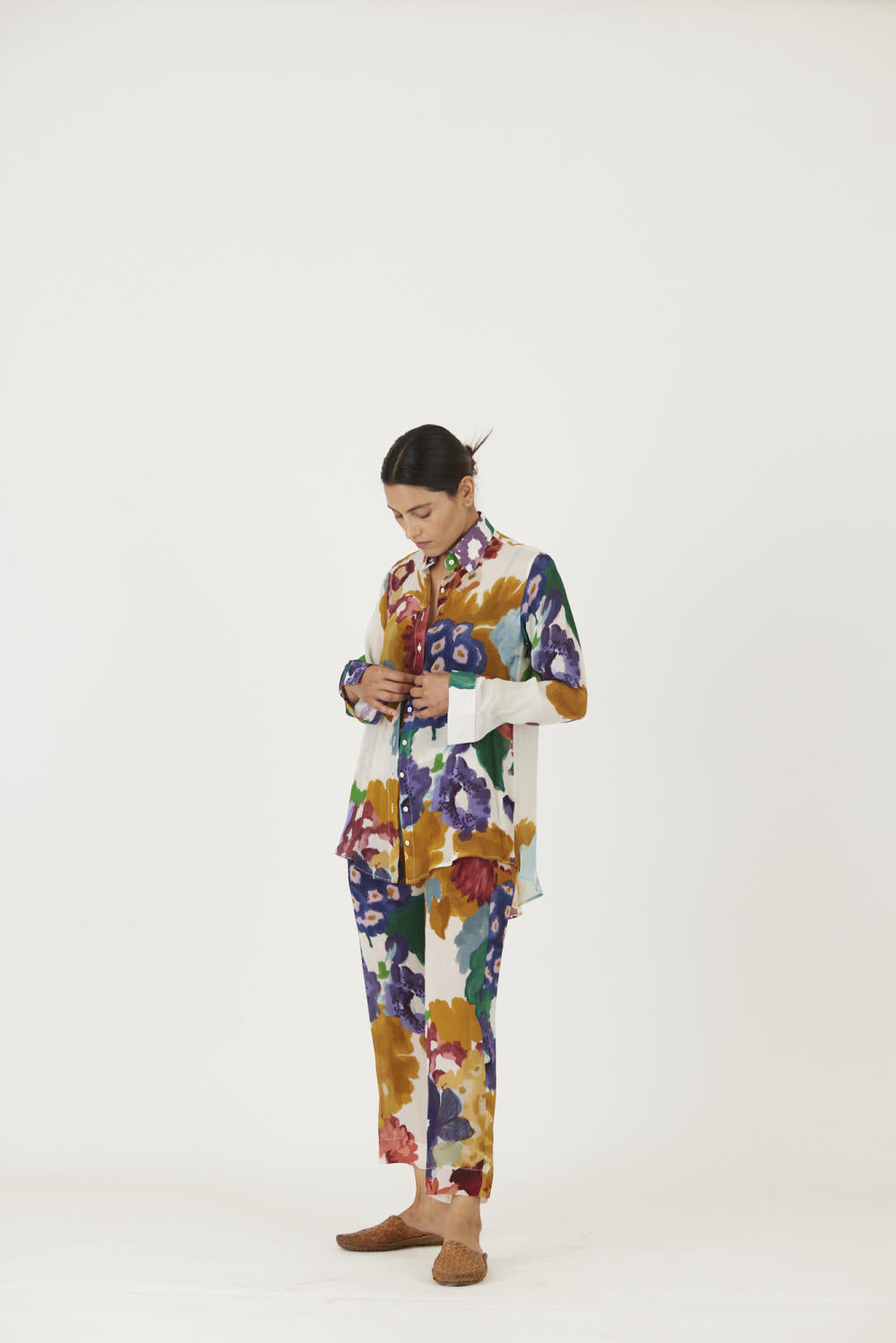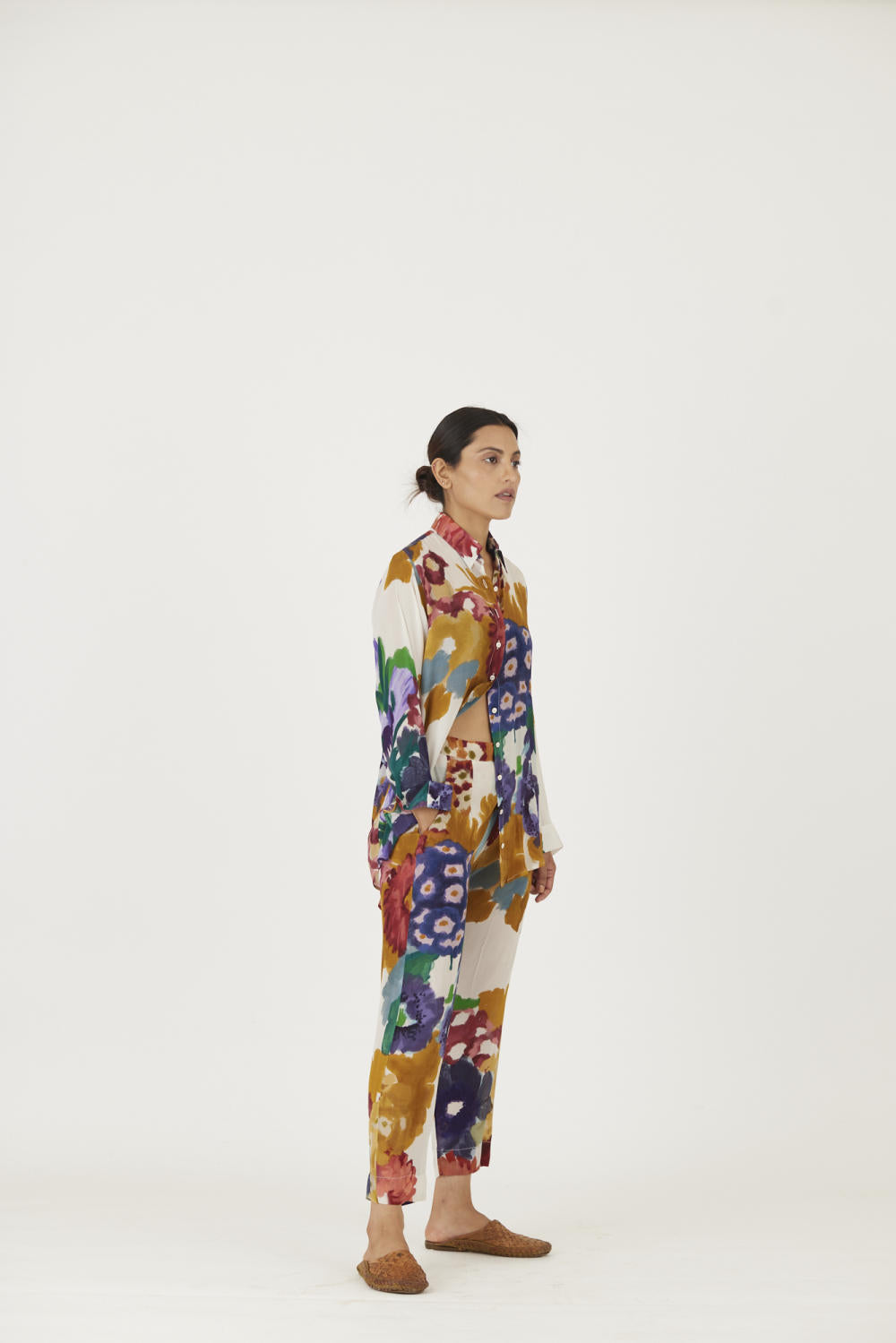 The print features an abundance of roses along with marigolds and jasmines arranged together in a bouquet on summer white base The set is crafted in the Farah print carefully printed on crepe. The set includes a button down shirt with back gathers and straight pants.