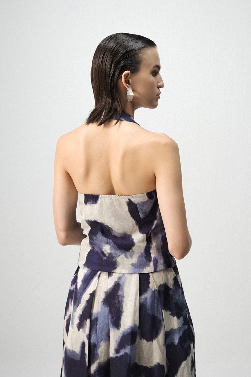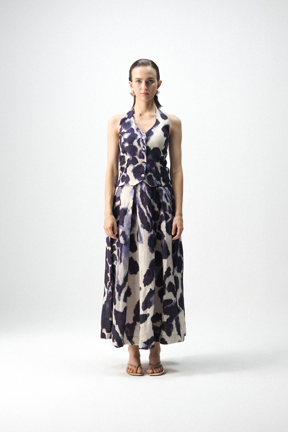 this Skirt set crafted in breathable linen embodies contemporary sophistication with a relaxed charm. The set features a halterneck waistcoat paired with a box-pleated midi skirt, both designed in a striking abstract print in shades of navy and ivory. The natural texture of linen adds a soft structure, making it perfect for both daywear and elegant evening occasions.