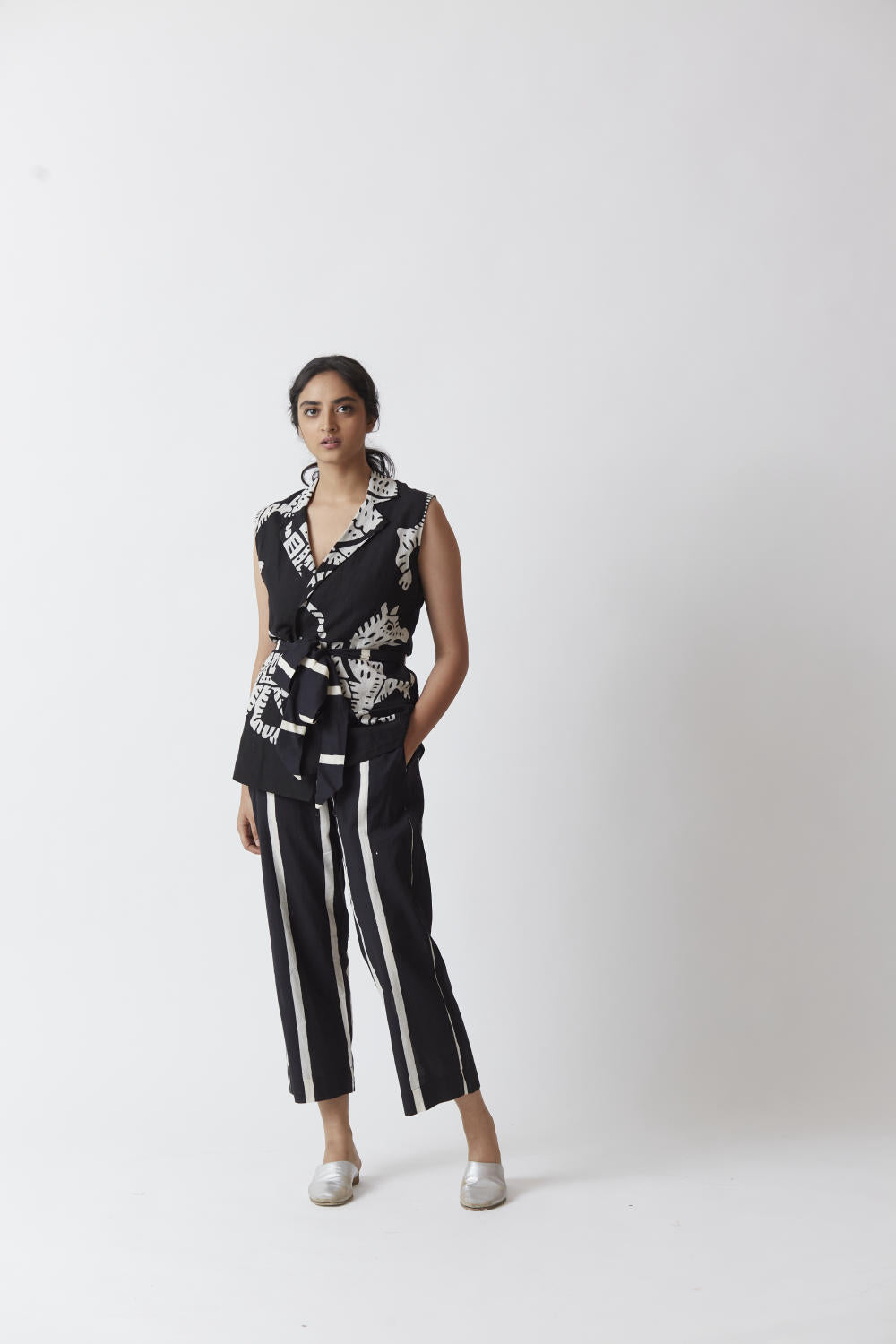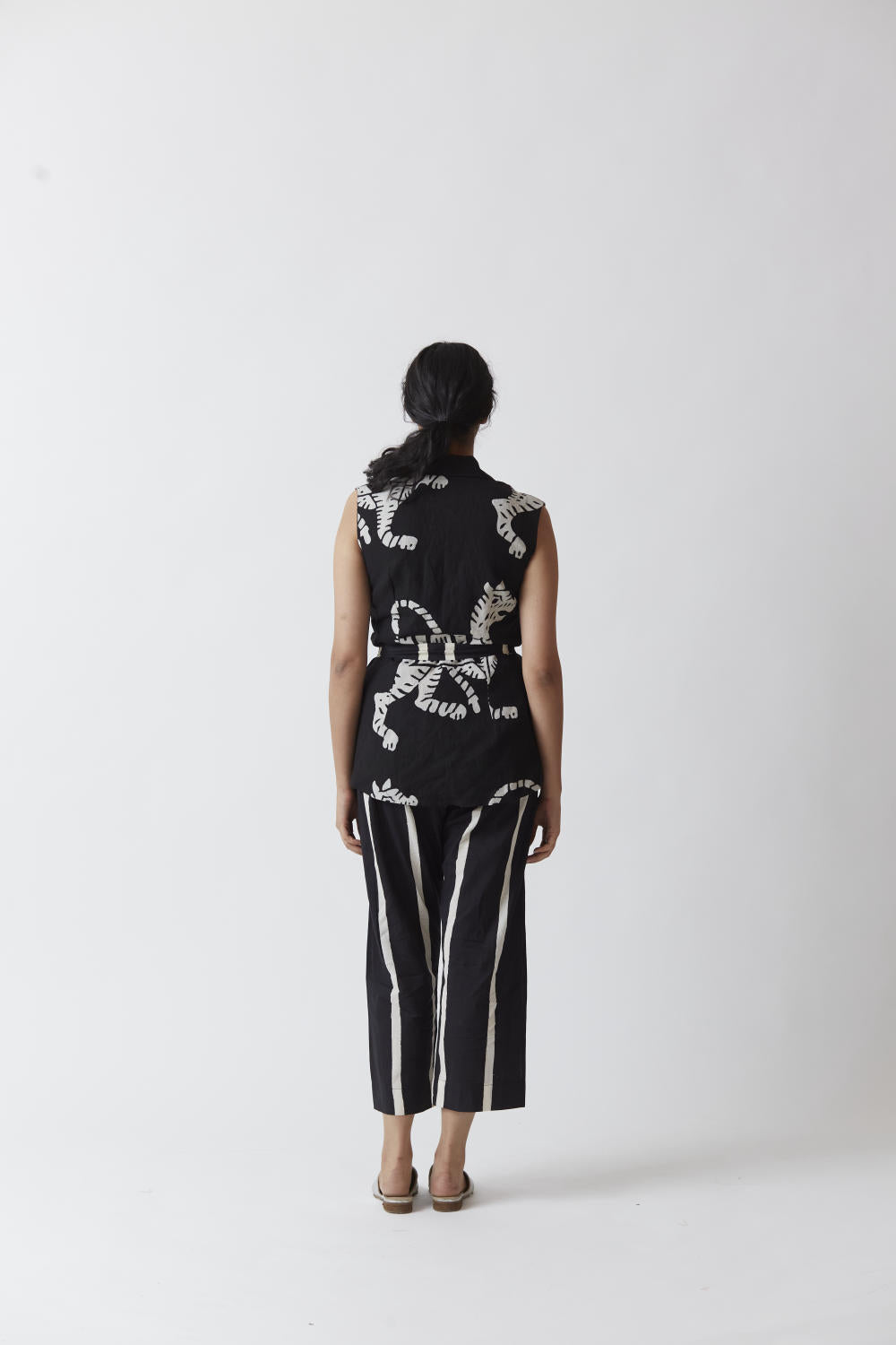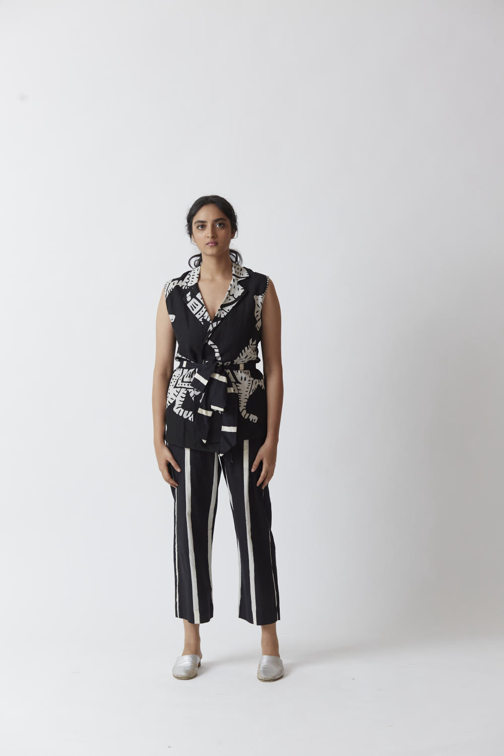 The pants are printed in black and white stripes.