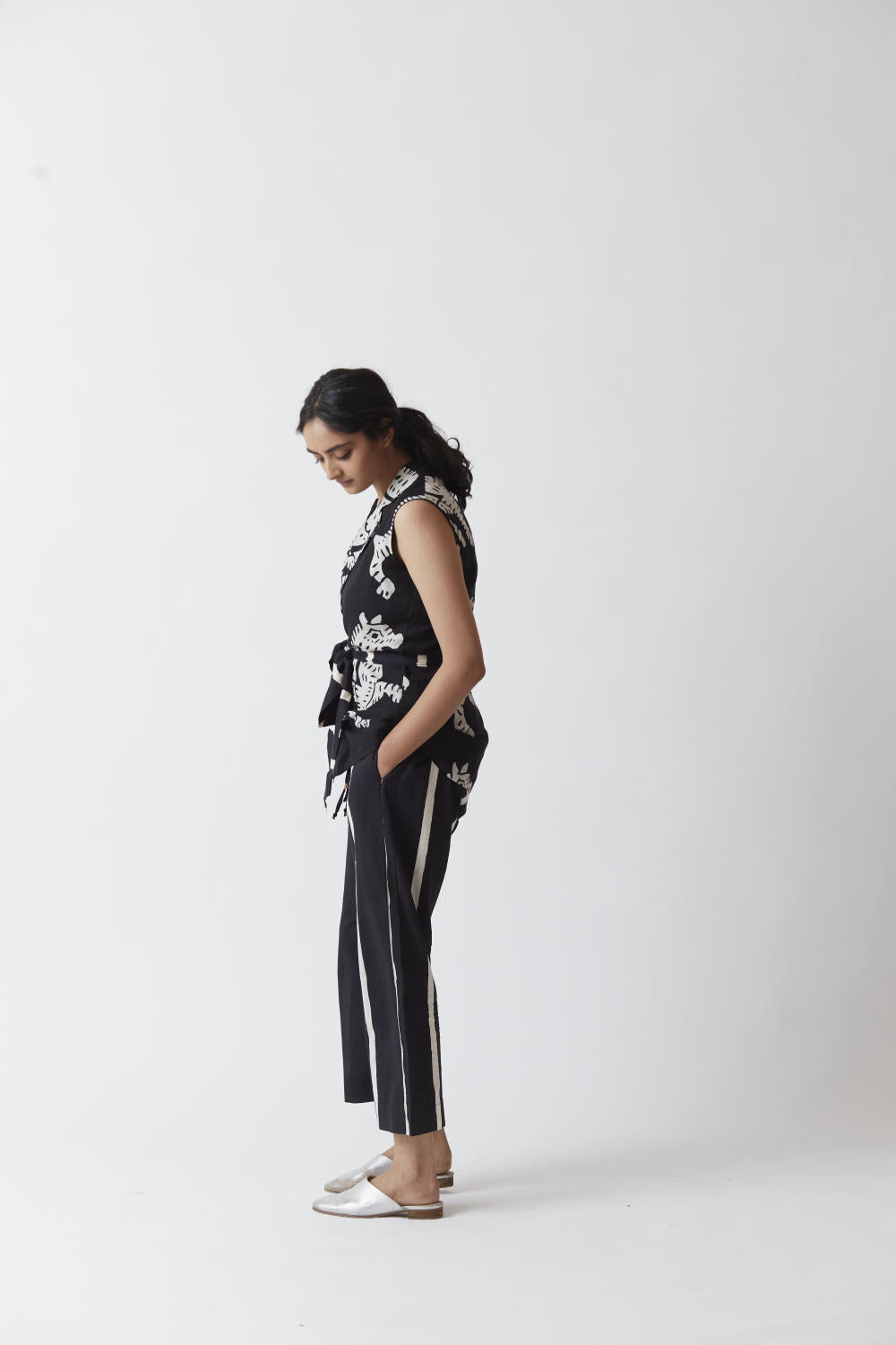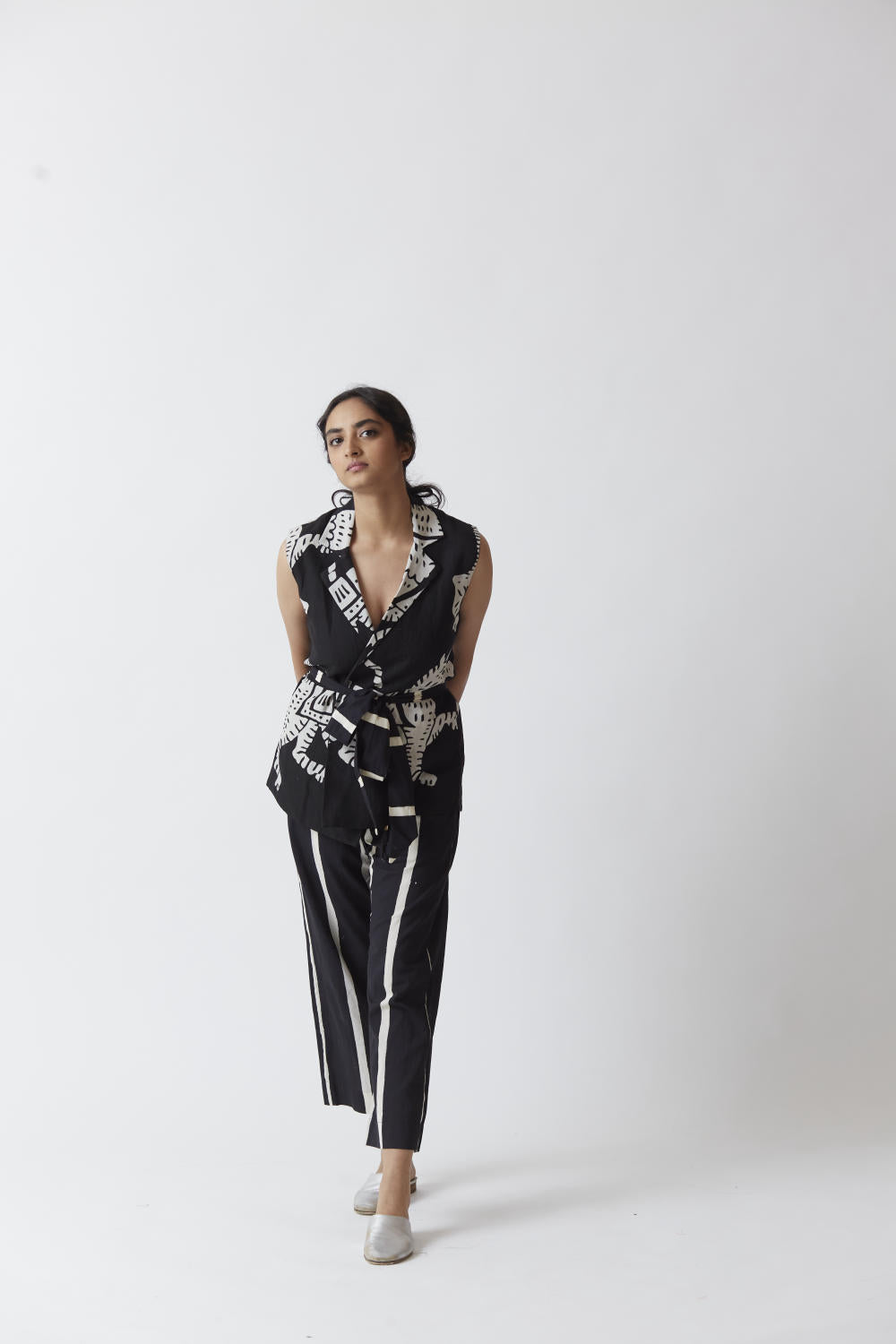 The set features a sleeveless jacket with belt.