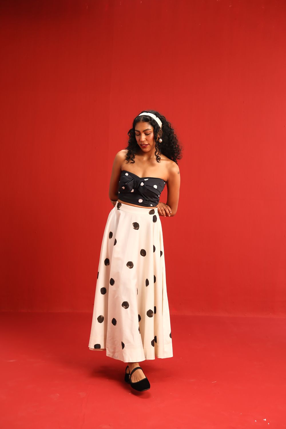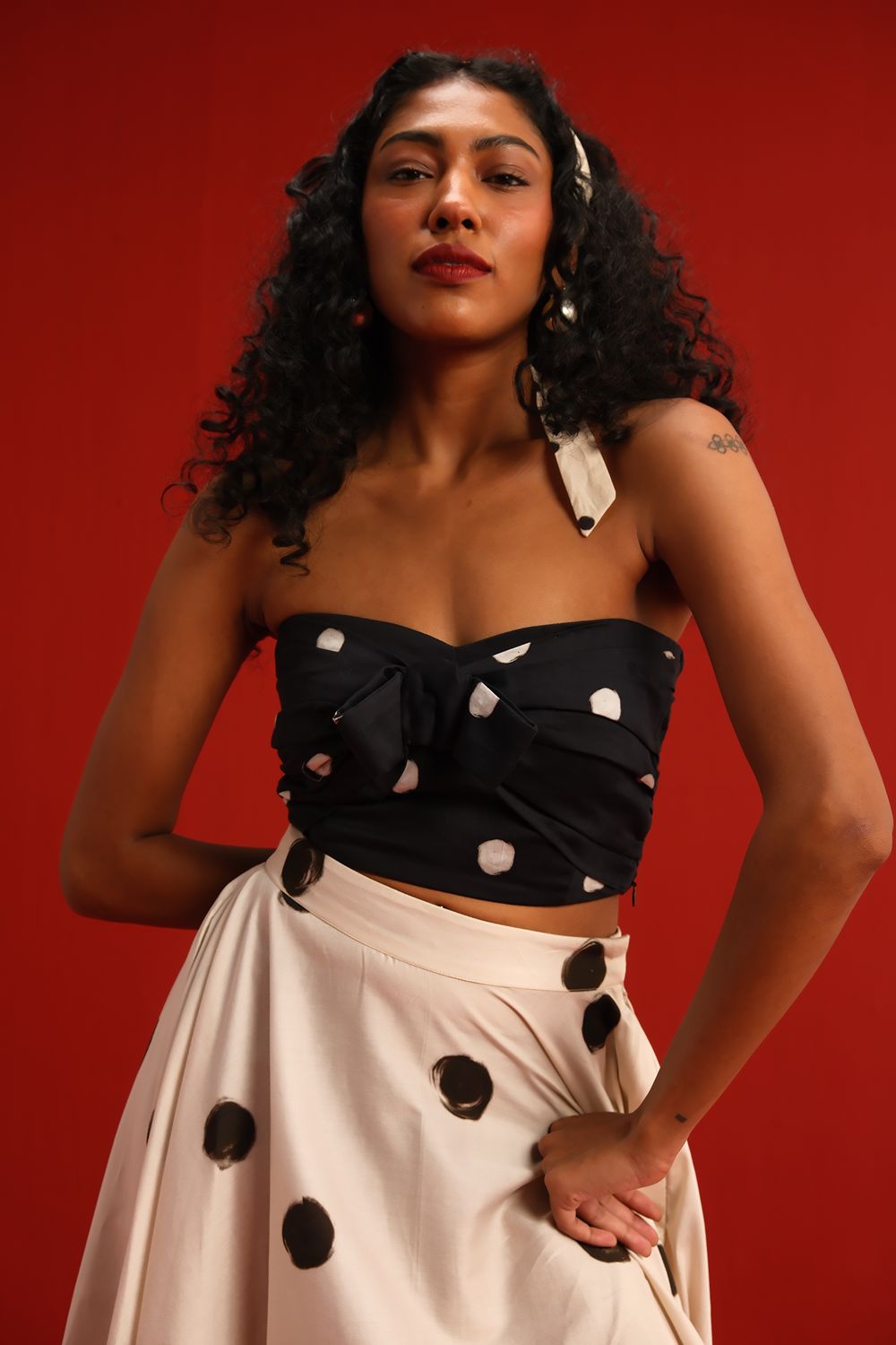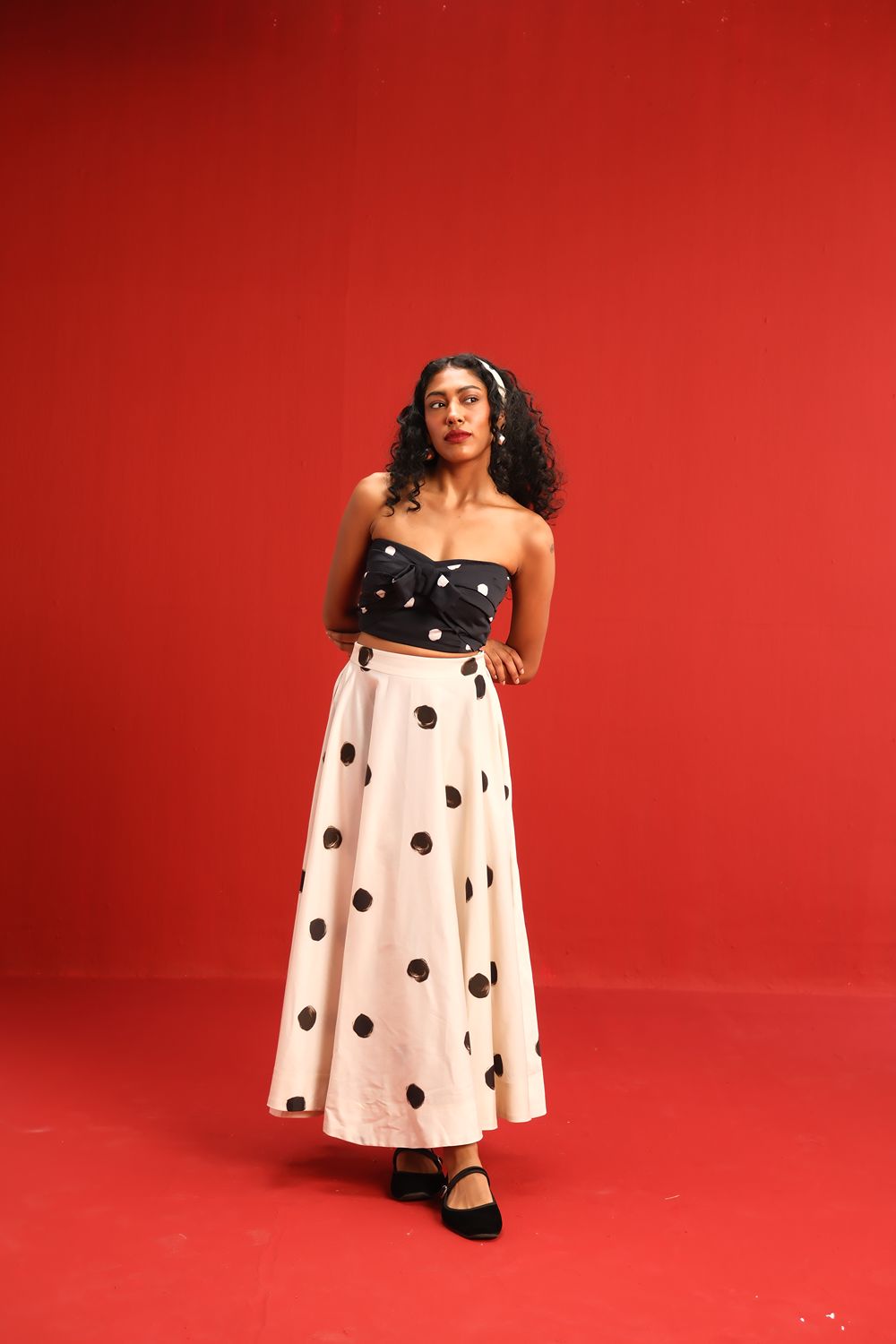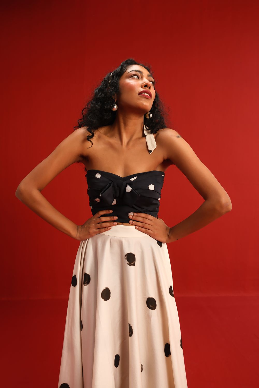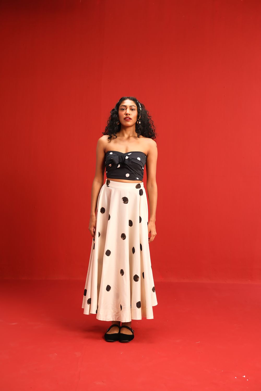 Featuring a strapless knotted bandeau top in black with scattered blush polka dots, paired effortlessly with a high-waisted ivory skirt adorned with oversized contrasting black polka dots, this set balances retro charm with modern silhouette. The soft, flowy fabric ensures a flattering drape and ease of movement, while the mix-and-match polka motif adds a youthful flair to your wardrobe.