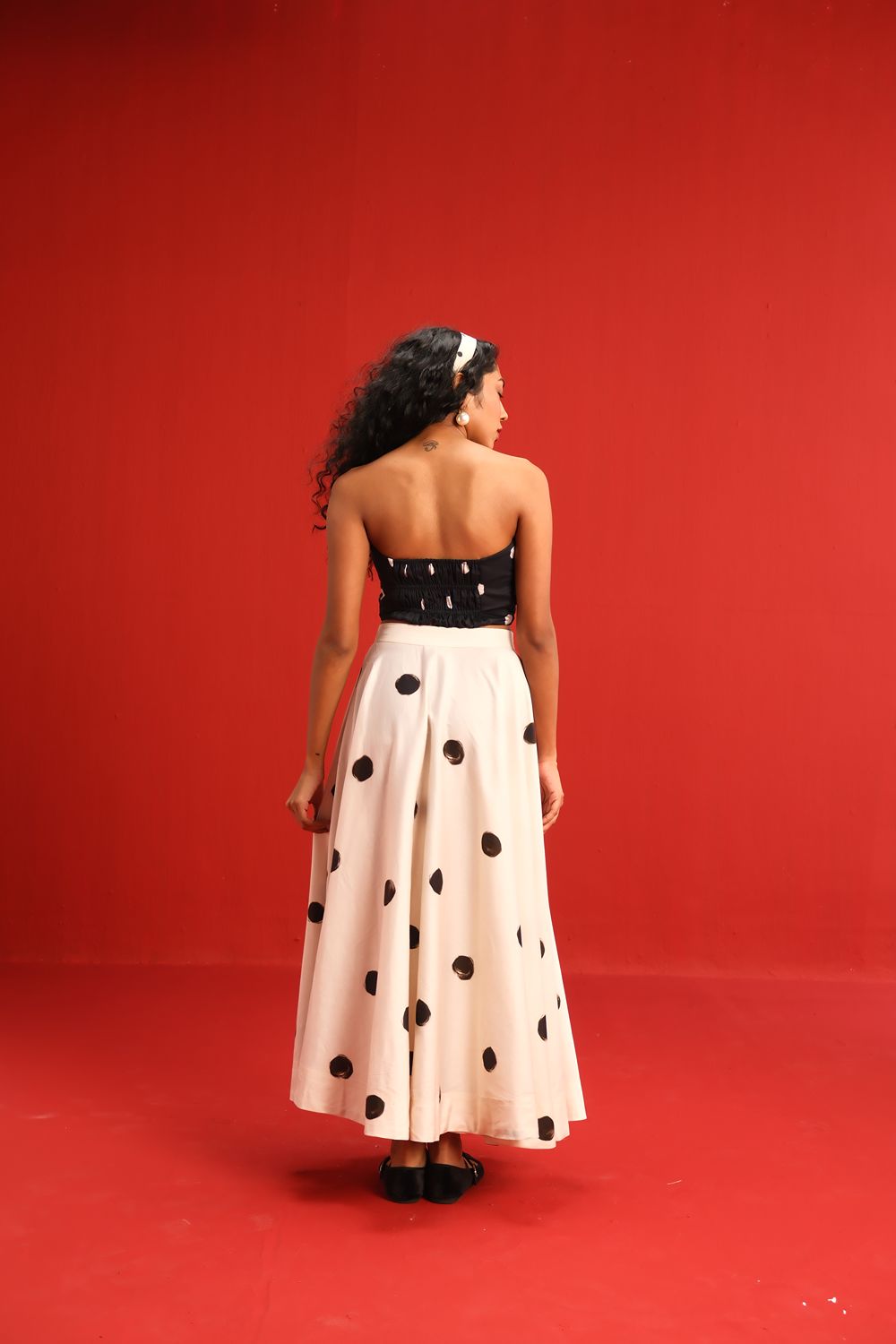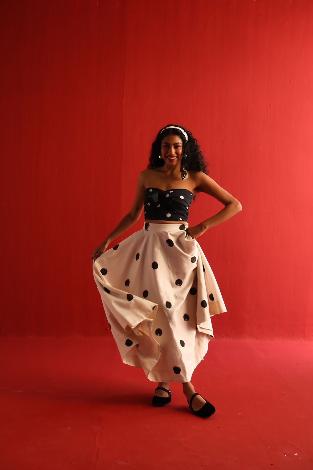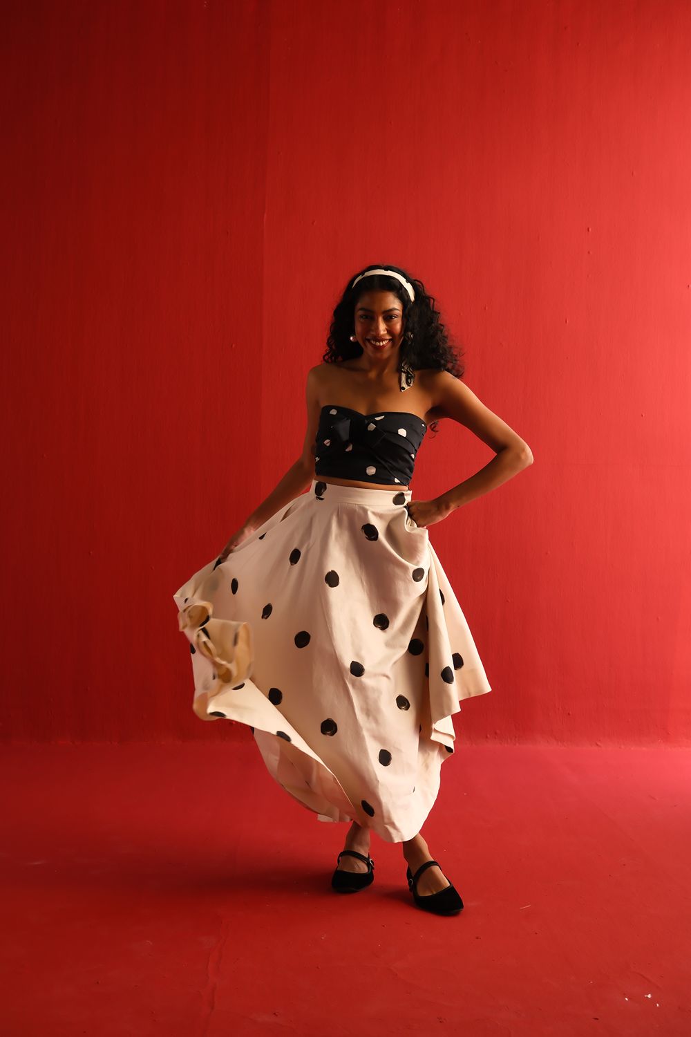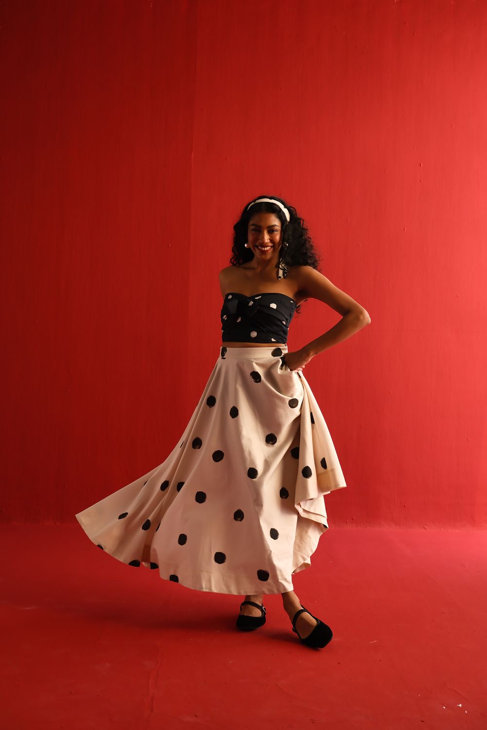 Featuring a strapless knotted bandeau top in black with scattered blush polka dots, paired effortlessly with a high-waisted ivory skirt adorned with oversized contrasting black polka dots, this set balances retro charm with modern silhouette. The soft, flowy fabric ensures a flattering drape and ease of movement, while the mix-and-match polka motif adds a youthful flair to your wardrobe.