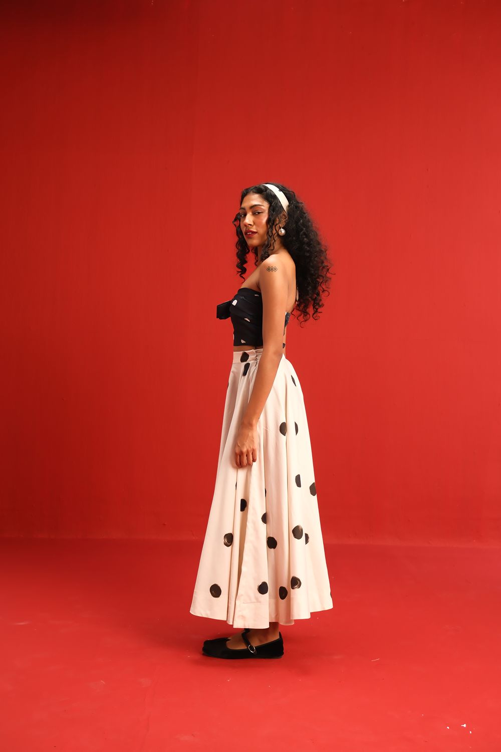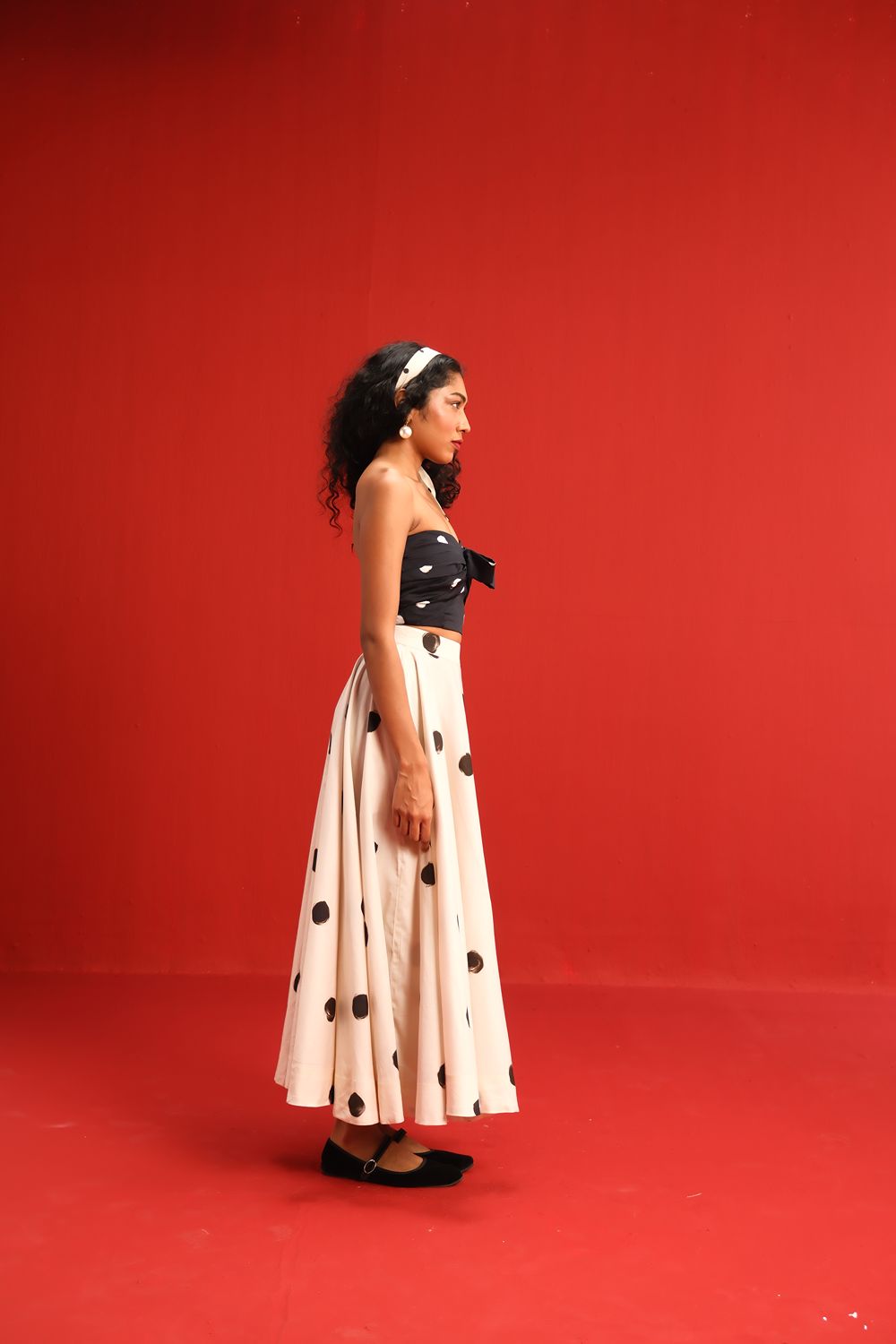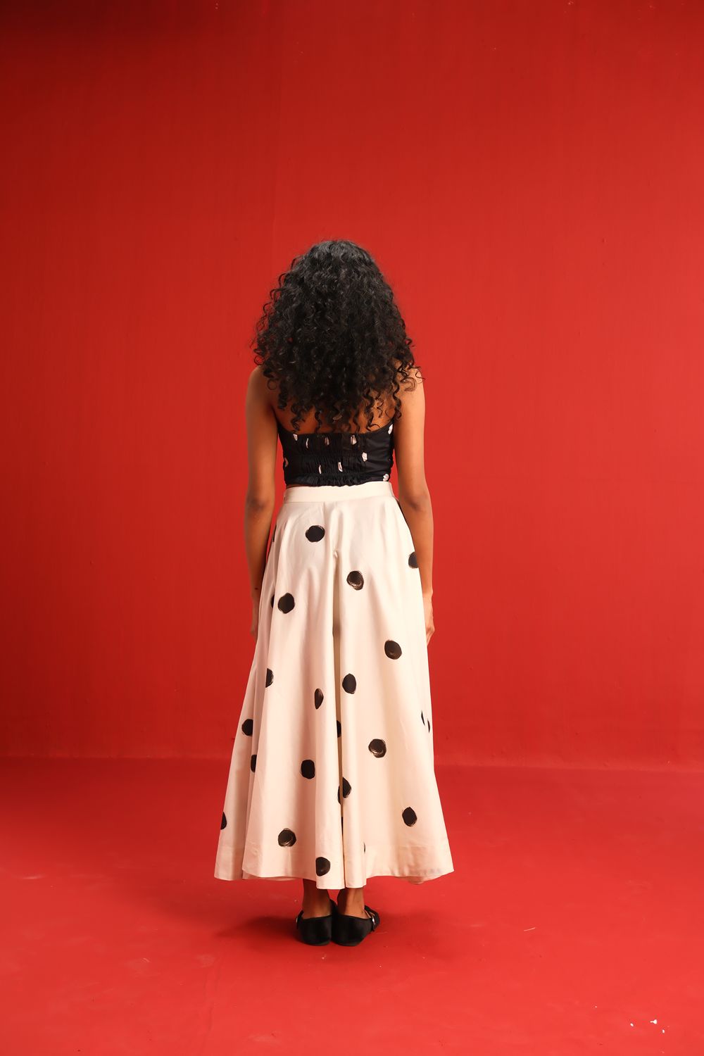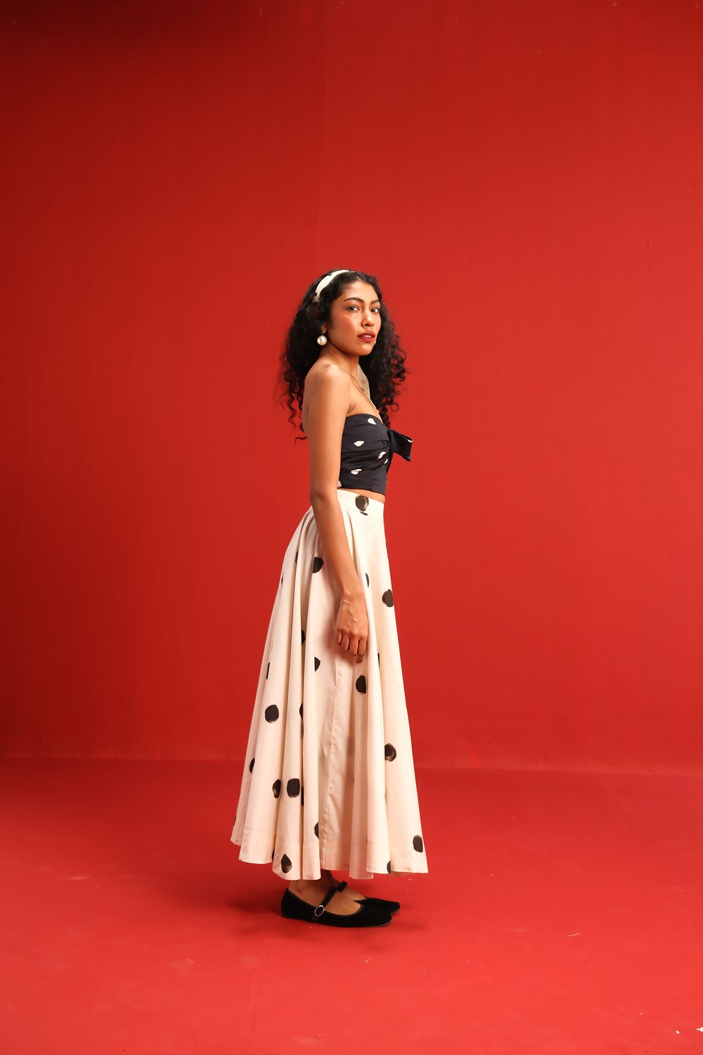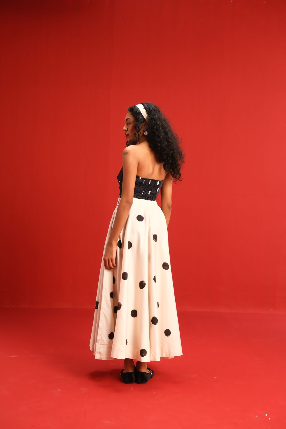 Featuring a strapless knotted bandeau top in black with scattered blush polka dots, paired effortlessly with a high-waisted ivory skirt adorned with oversized contrasting black polka dots, this set balances retro charm with modern silhouette. The soft, flowy fabric ensures a flattering drape and ease of movement, while the mix-and-match polka motif adds a youthful flair to your wardrobe.
