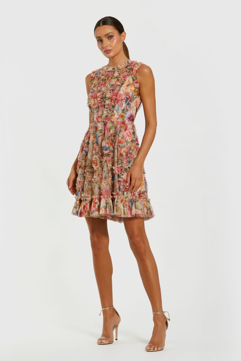 Mesh Micro Ruffle High Neck Mini Dress