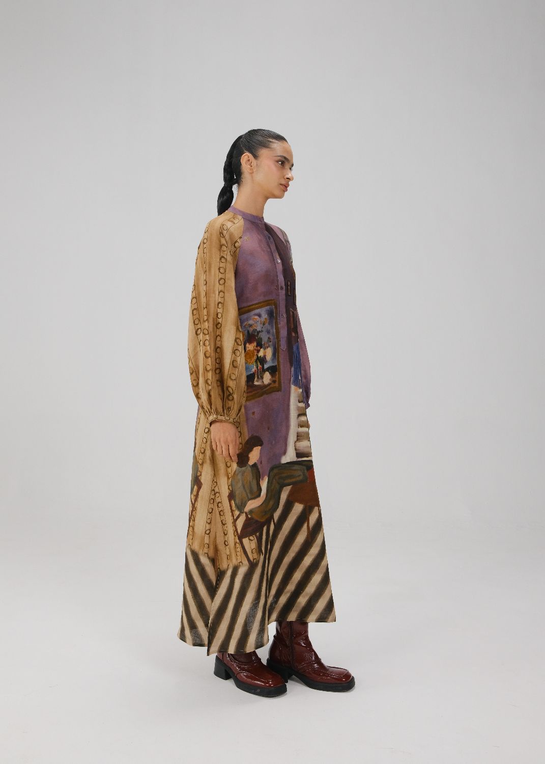 CORD blurs the line between art and attire in a way few labels dare to. Here, fabrics become canvases; illustrations—drawn by hand, steeped in imagination—flow across silhouettes that feel sculptural yet deeply wearable. Each piece has a texture of memory to it, as if it carries echoes of a past life, now reframed for a contemporary world.