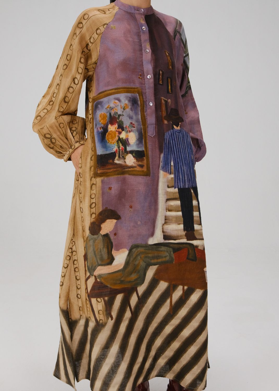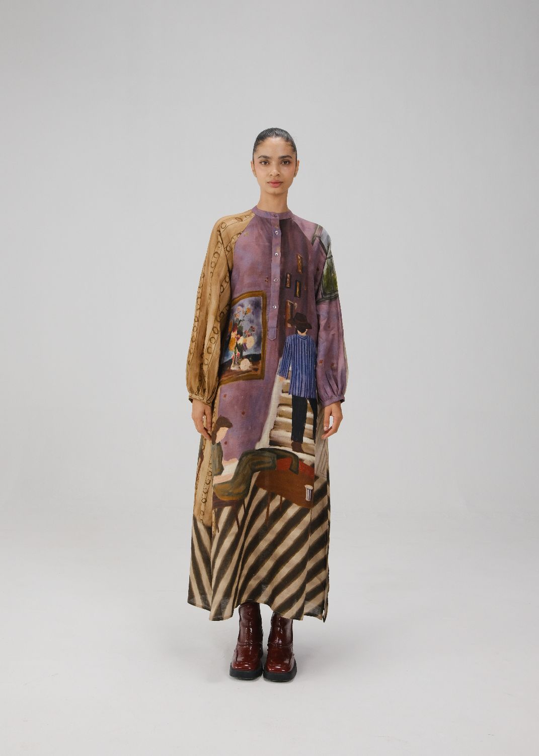 Crafted from pure linen, the Goa Dress features a band collar, long placket, and A-line silhouette with high side slits. Finished with full raglan sleeves and elasticated cuffs, it blends refined detailing with effortless versatility for both casual and elevated occasions.