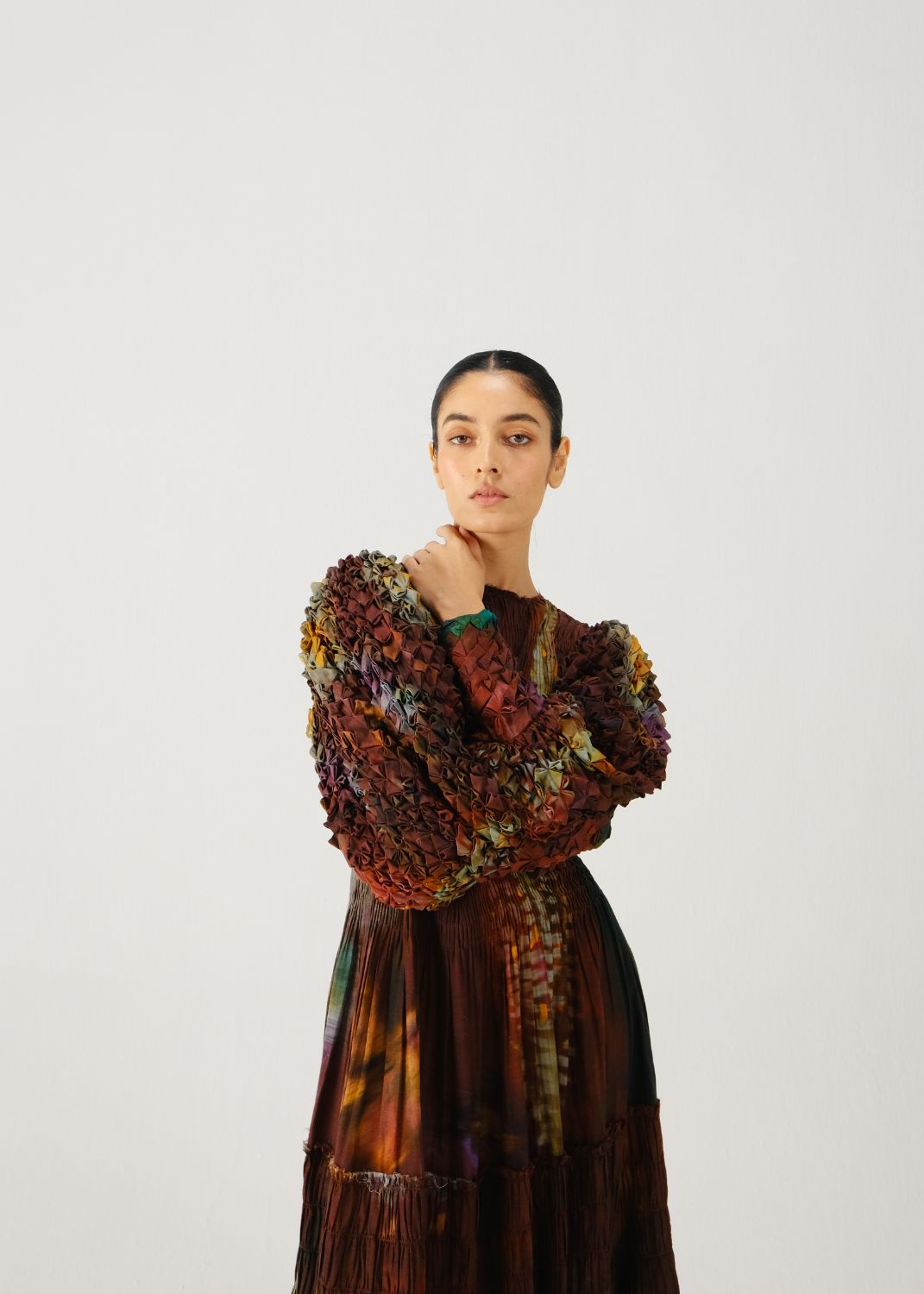 Made from cotton silk fabric in X-ray print, the July dress features a exaggerated smocked bishop sleeves with smocked yoke and a extensively gathered tier at the bottom.