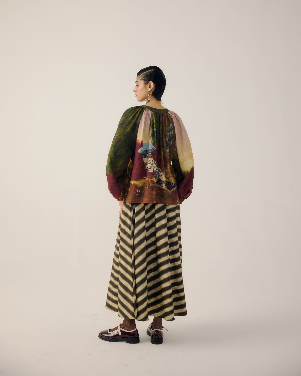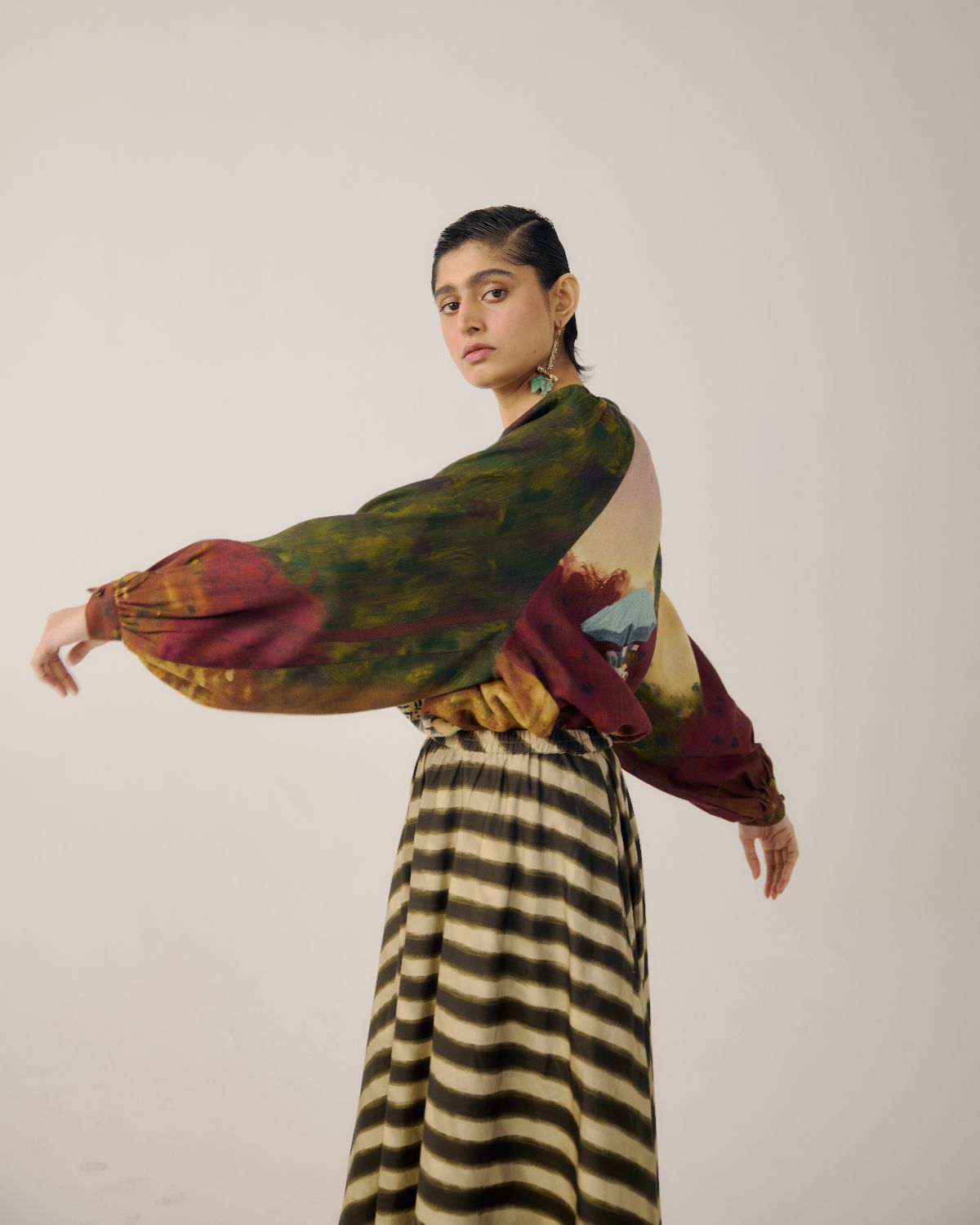 CORD blurs the line between art and attire in a way few labels dare to. Here, fabrics become canvases; illustrations—drawn by hand, steeped in imagination—flow across silhouettes that feel sculptural yet deeply wearable. Each piece has a texture of memory to it, as if it carries echoes of a past life, now reframed for a contemporary world.