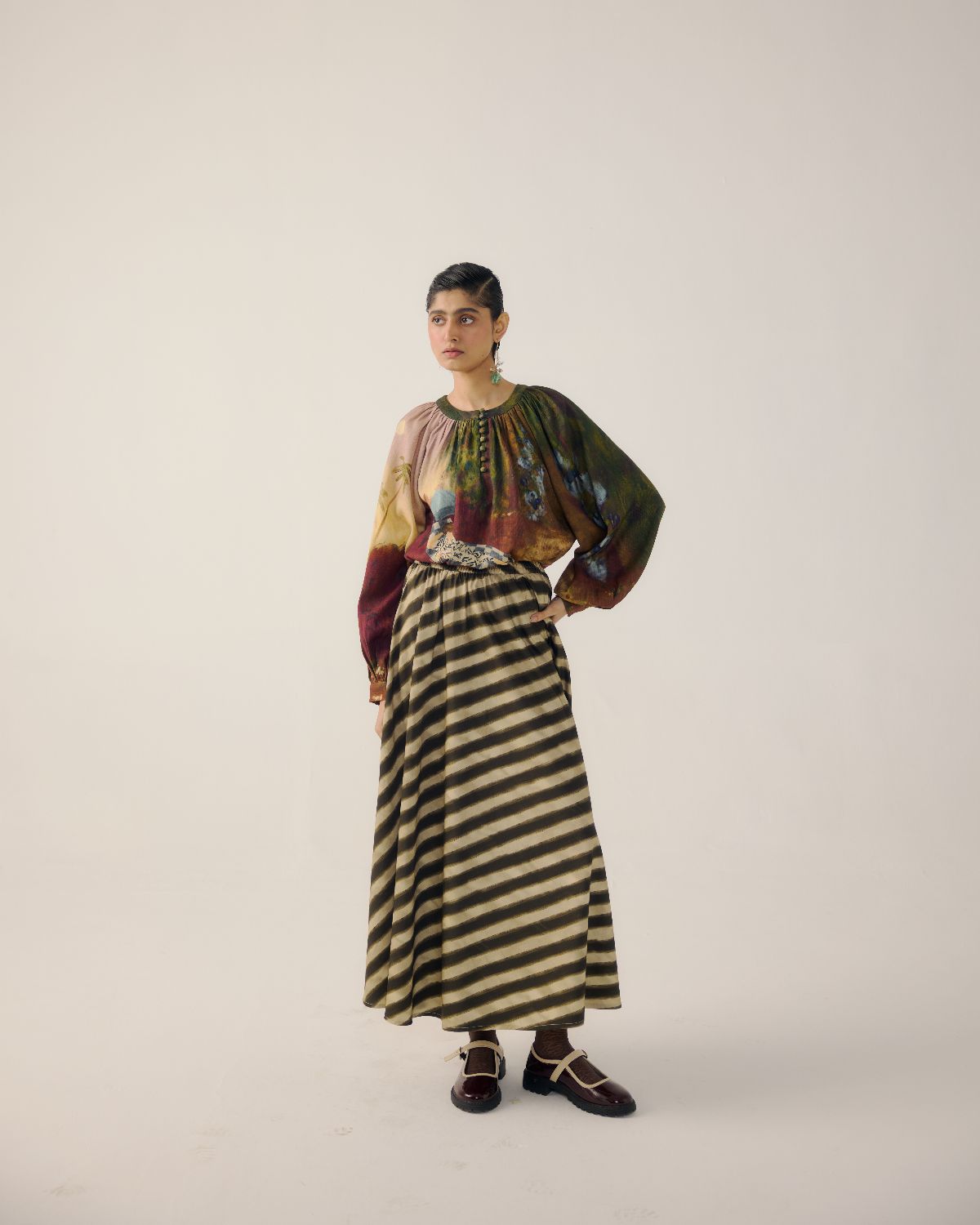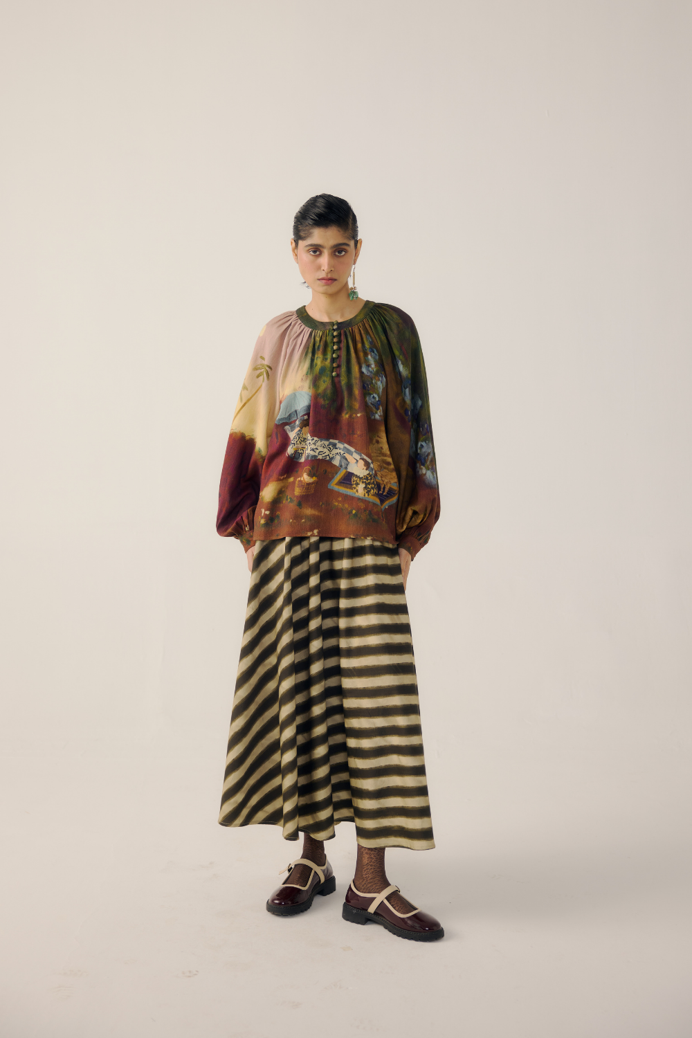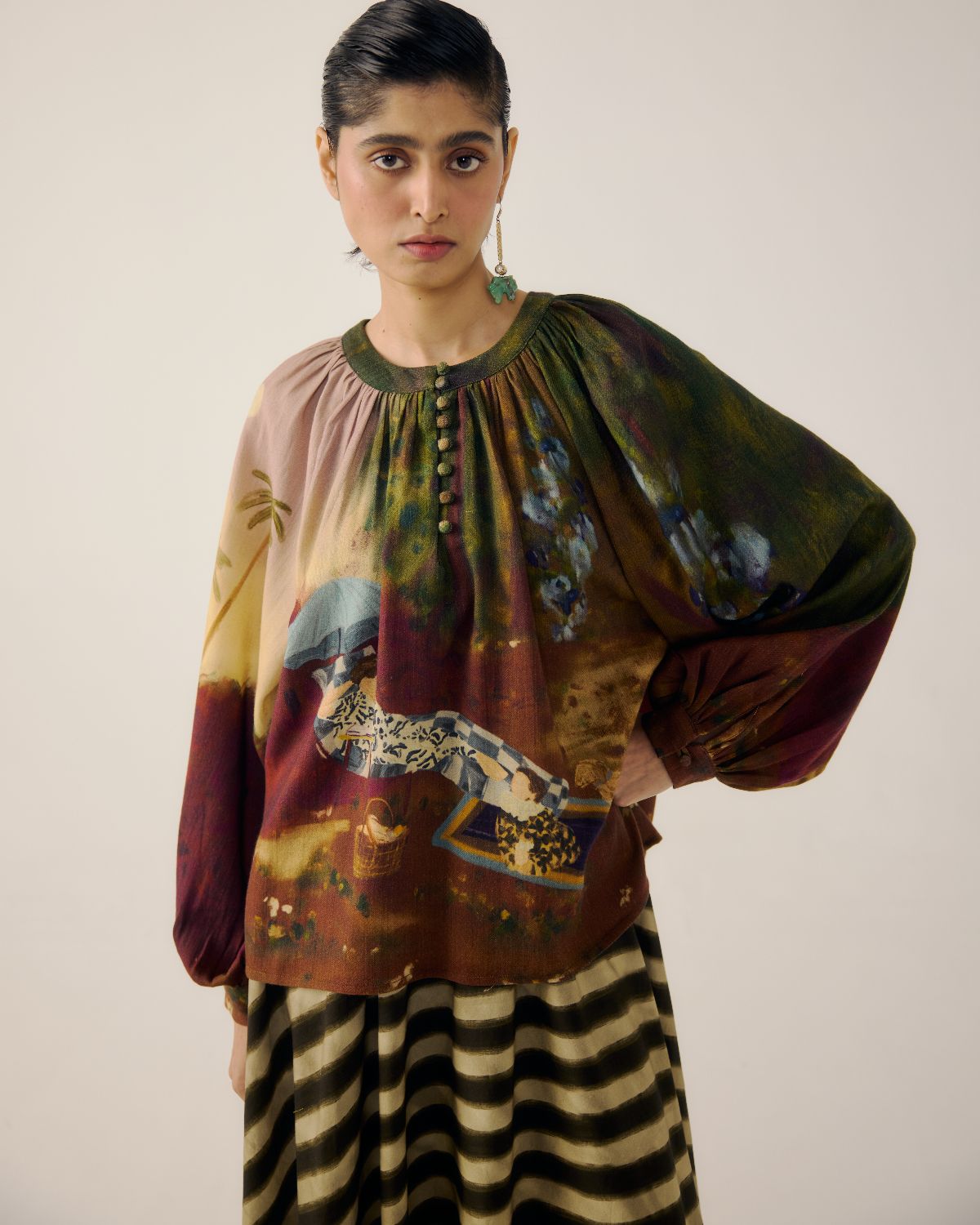The Lido Top in Lakeside Print, crafted from soft wool fabric, features a gathered neckline, bishop sleeves with cuffed ends, and a relaxed silhouette. With its vibrant colors and versatile design, it pairs effortlessly with skirts or pants for a chic, everyday look.