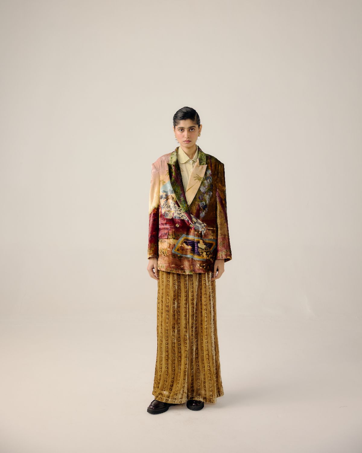 CORD blurs the line between art and attire in a way few labels dare to. Here, fabrics become canvases; illustrations—drawn by hand, steeped in imagination—flow across silhouettes that feel sculptural yet deeply wearable. Each piece has a texture of memory to it, as if it carries echoes of a past life, now reframed for a contemporary world.