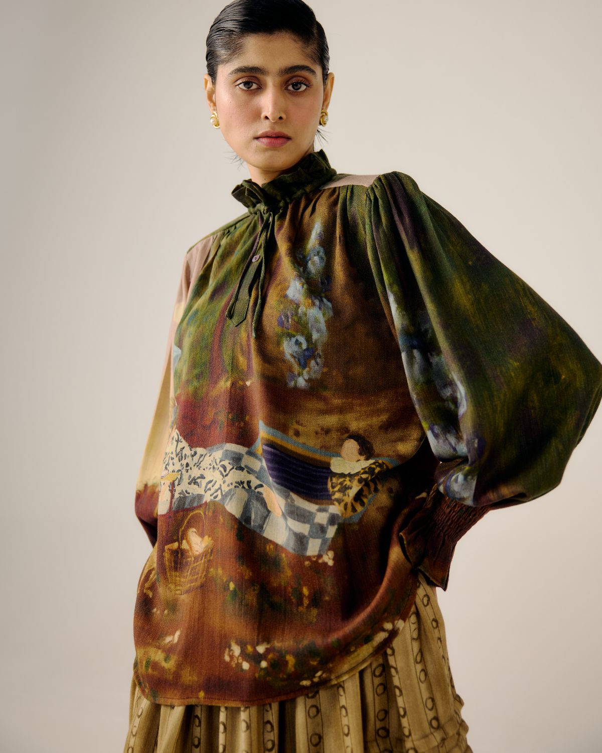 Details: Ruffled collar, gathered shoulders, full balloon sleeves, button-down front
