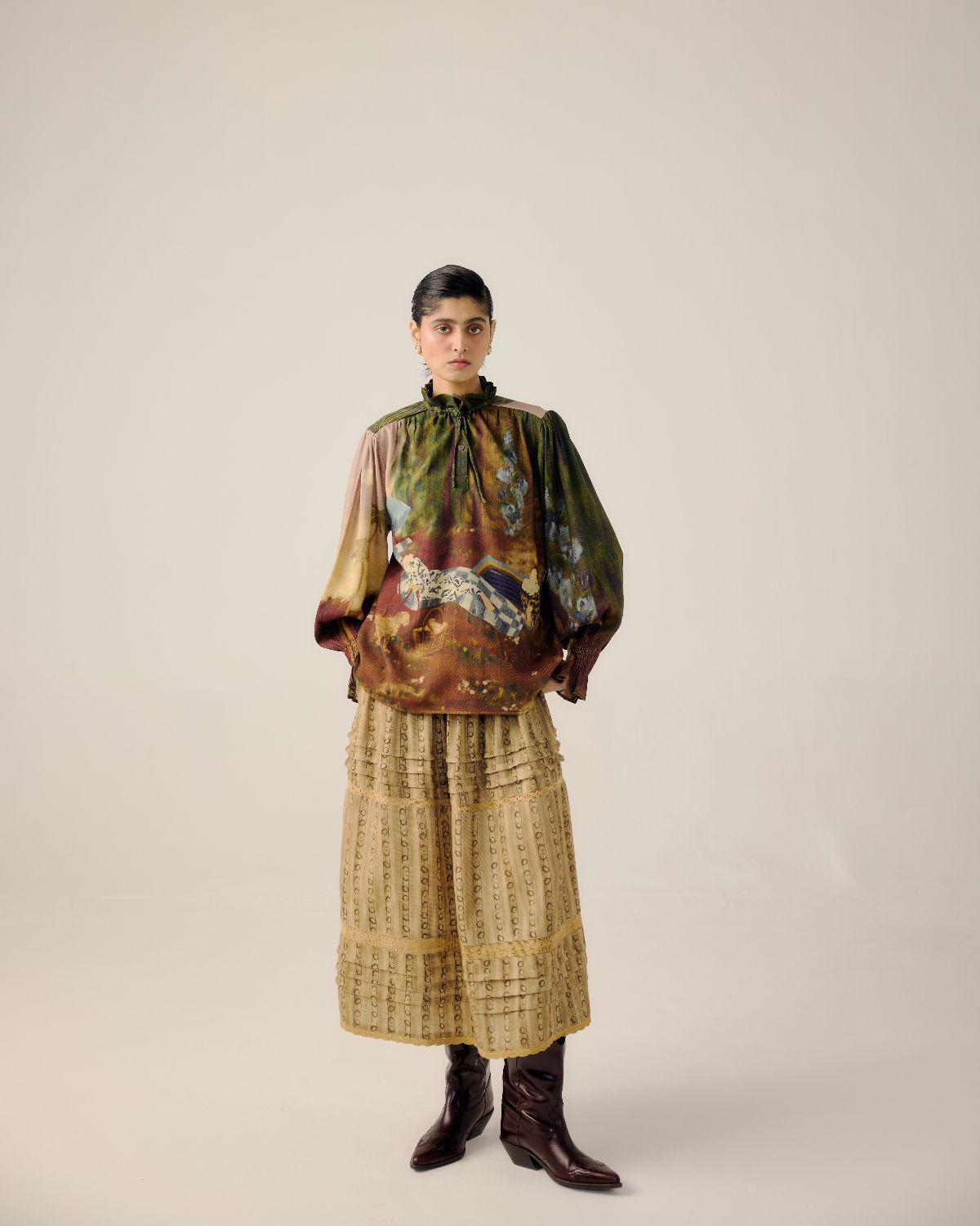 The ruffled top in Lakeside print features a ruffled collar, lightly gathered shoulders, full balloon sleeves, and a relaxed fit.