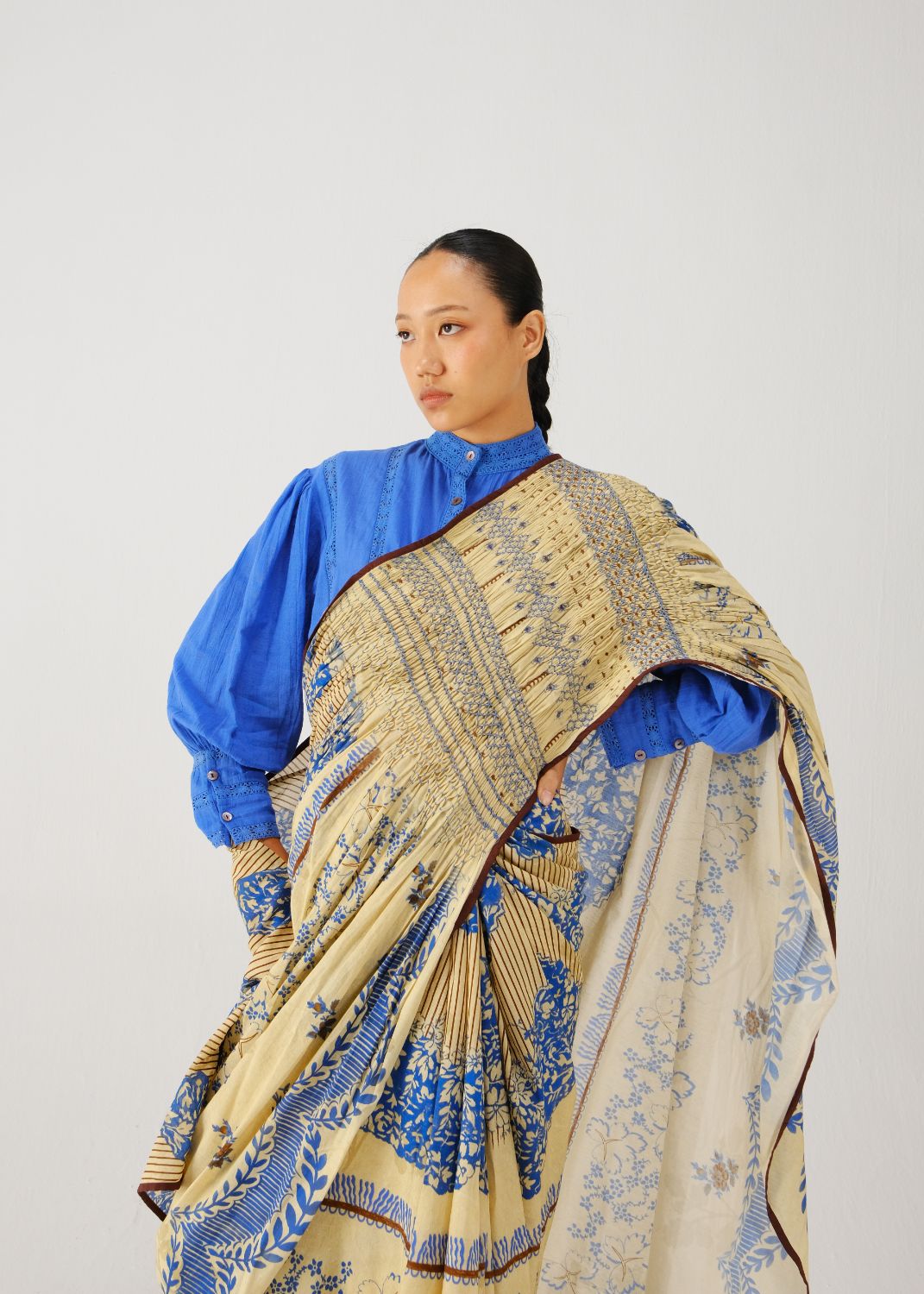 The saree is crafted from satin, featuring hand-smocked details on the shoulder panel and scalloped edges in our signature bluebell print.
