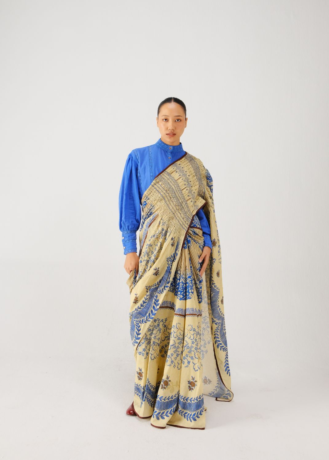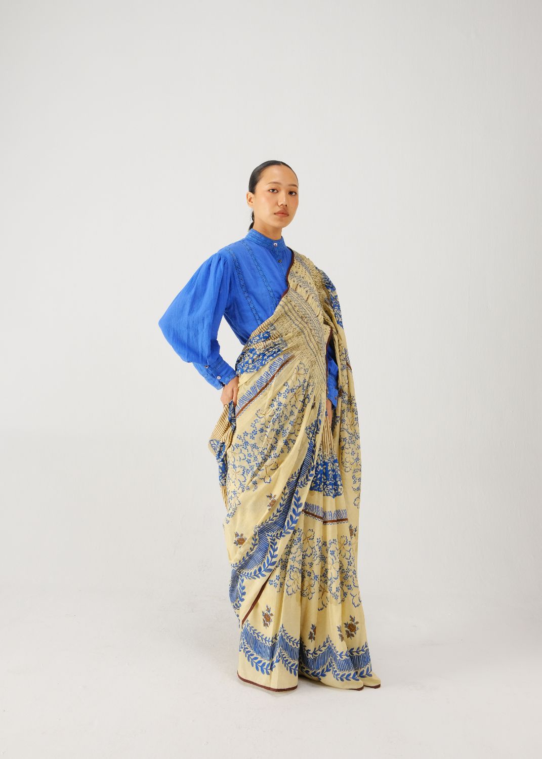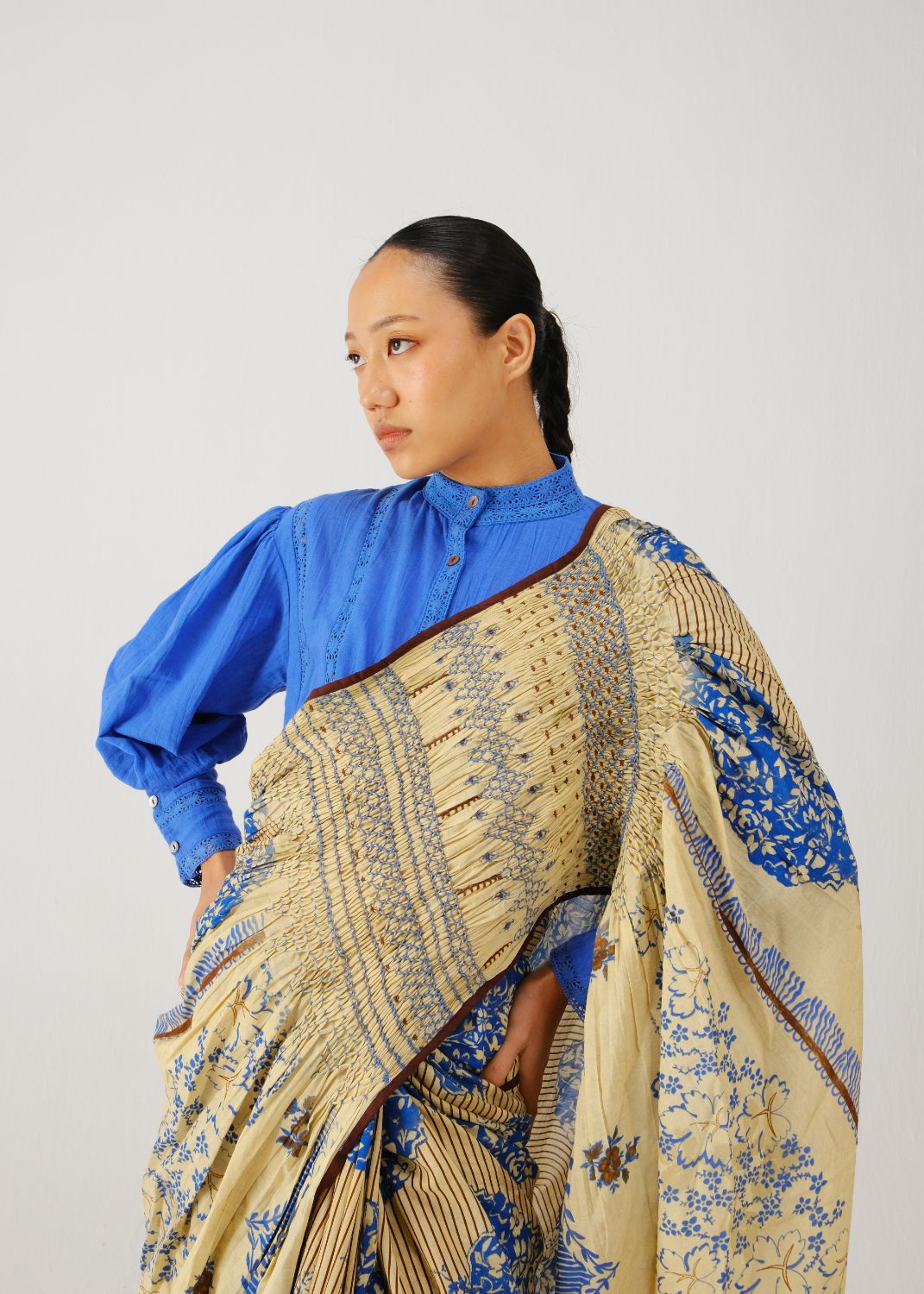 The Smocked Saree Set consists of a satin saree, featuring hand-smocked details on the shoulder panel and scalloped edges in our signature Bluebell print. It is paired with the Lily Top, a cotton, buttoned-up, mid-length, full-sleeve silhouette with lace inserts at the neck, hem, and cuffs, crafted in our electric blue.