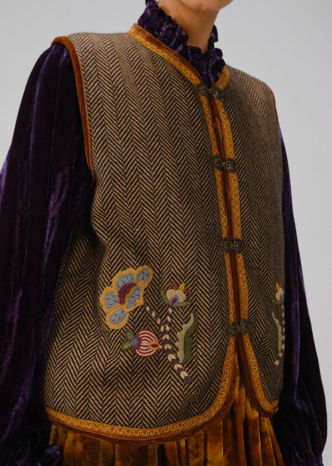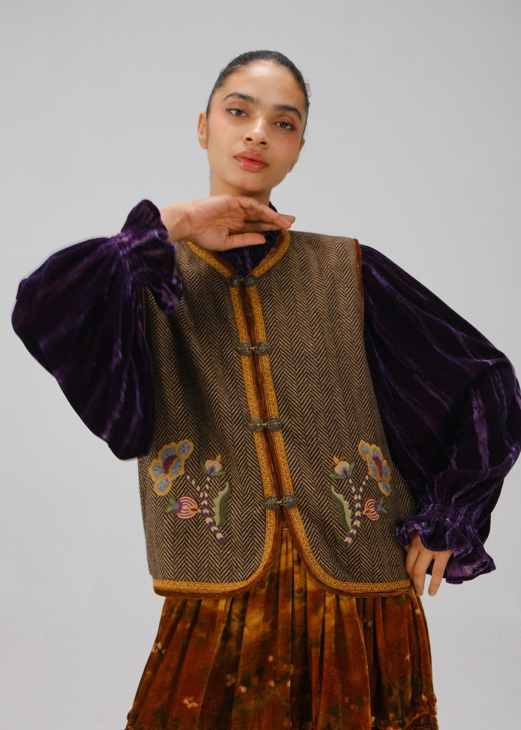 The Vest features a round neck, contrasting piping, lace borders, vintage metal buttons, and front button fastening. Intricate hand embroidery enhances the work across the bodice, adding a refined artisanal touch.