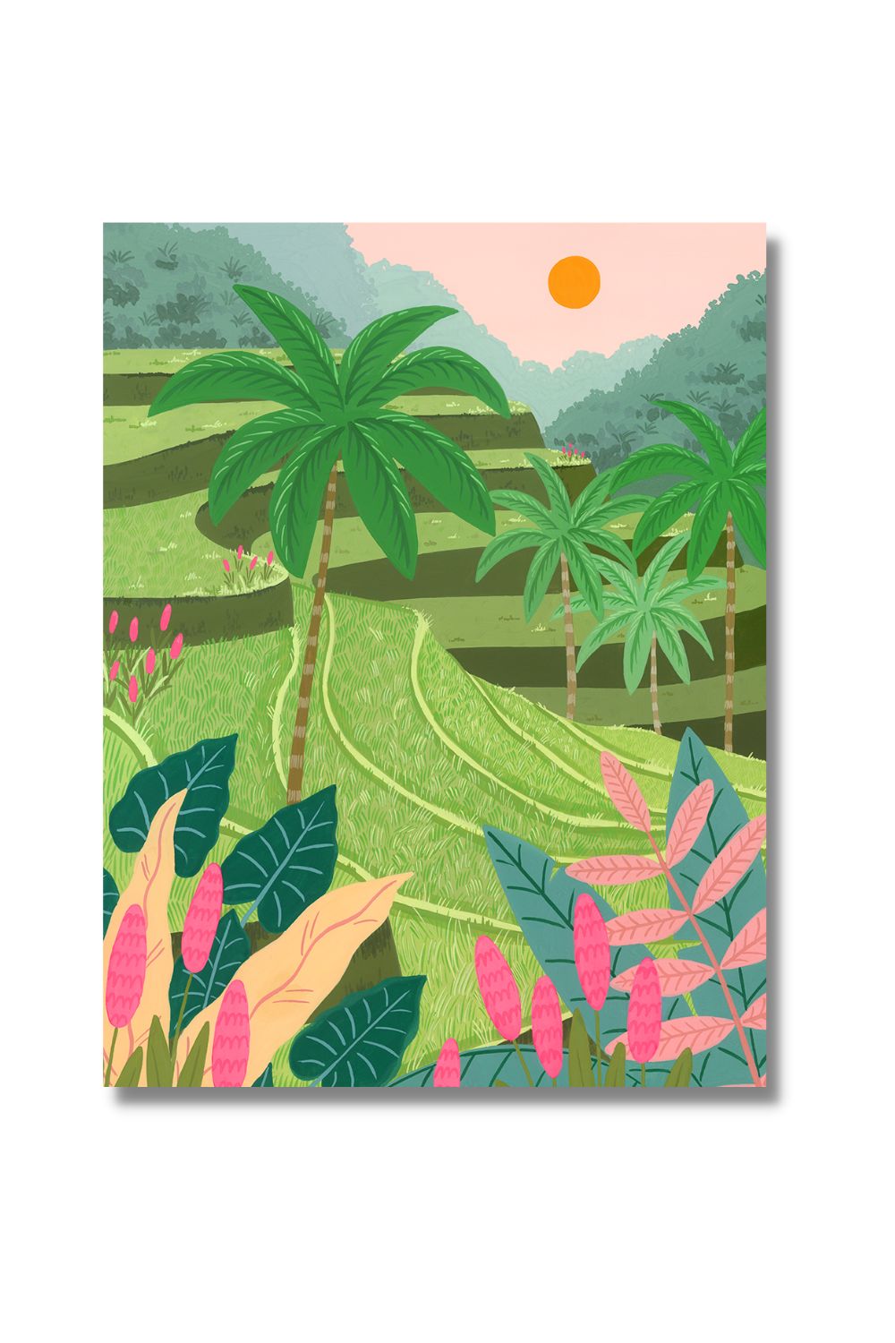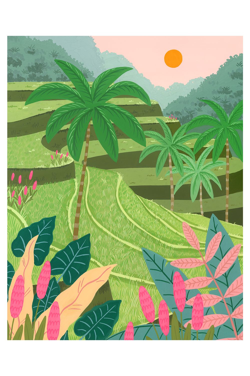 This gouache painting was inspired by a recent weekend trip to Ubud, Bali. We woke up early to catch the sunrise at the rice terrace and it did not disappoint. We sat down to wait for the sun to peak over the palm trees and through the morning until there was a sparkling glow of sunshine surrounding us.