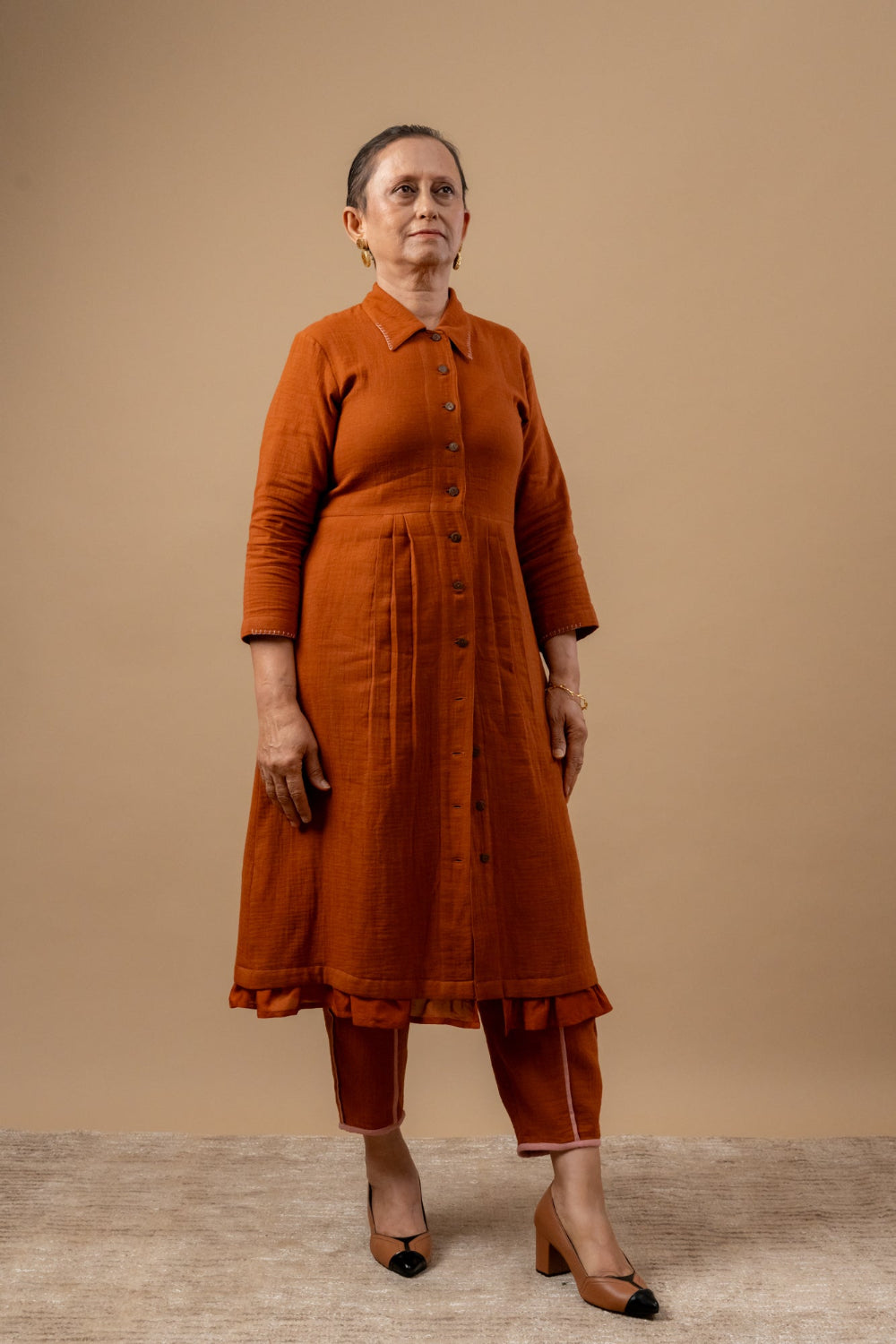Description: Asymmetrical long dress in organic cotton with contrast piping, adjustable belt and side pockets. Neck opening- key hole with button.