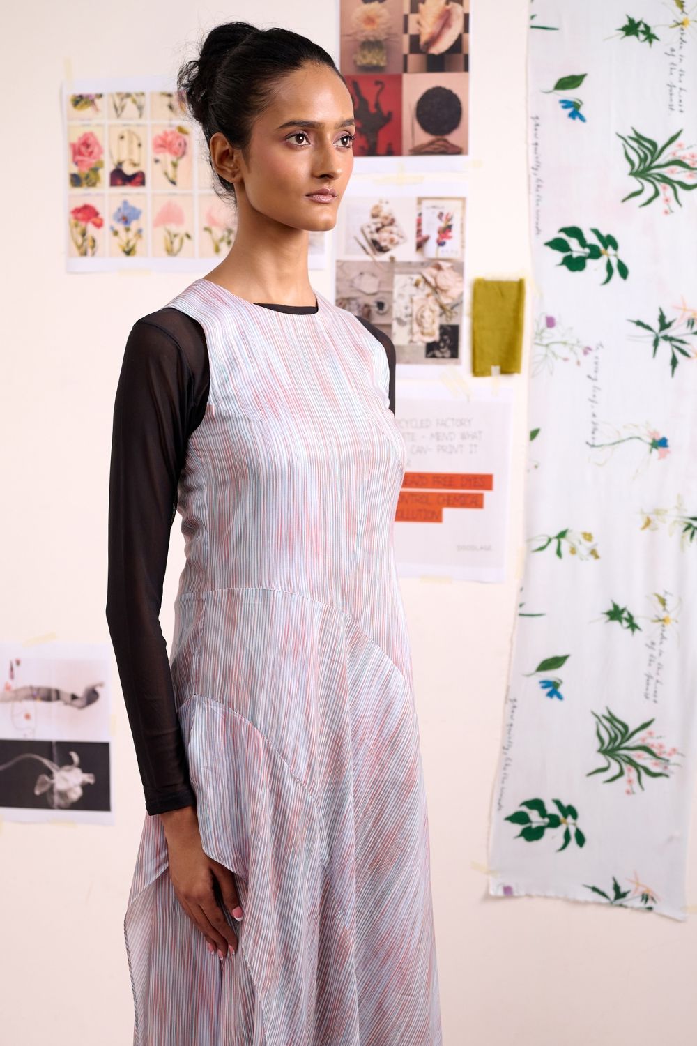 Product Details: Effortless and contemporary, this dress is crafted in soft modal fabric with a subtle striped pattern. Designed with an asymmetrical hem and curly detailing, it adds movement and playful texture to the silhouette. A side slit enhances ease of wear, while the eyelet opening at the neckline adds a delicate, modern touch. Lightweight and breathable, this dress is perfect for casual outings, brunches, or relaxed evening occasions.
