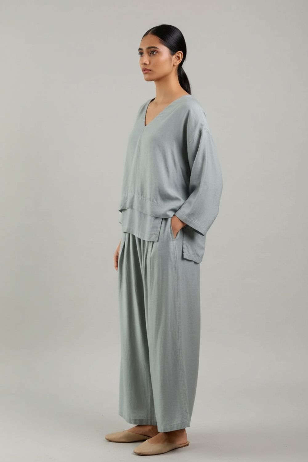 Description: A relaxed-fit co-ord set in luxurious Bemberg linen, featuring pleated pants with an adjustable drawstring waist and a flowy, layered top. Designed for effortless elegance, the grey-hued ensemble drapes beautifully, making it perfect for festive occasions or refined everyday wear.