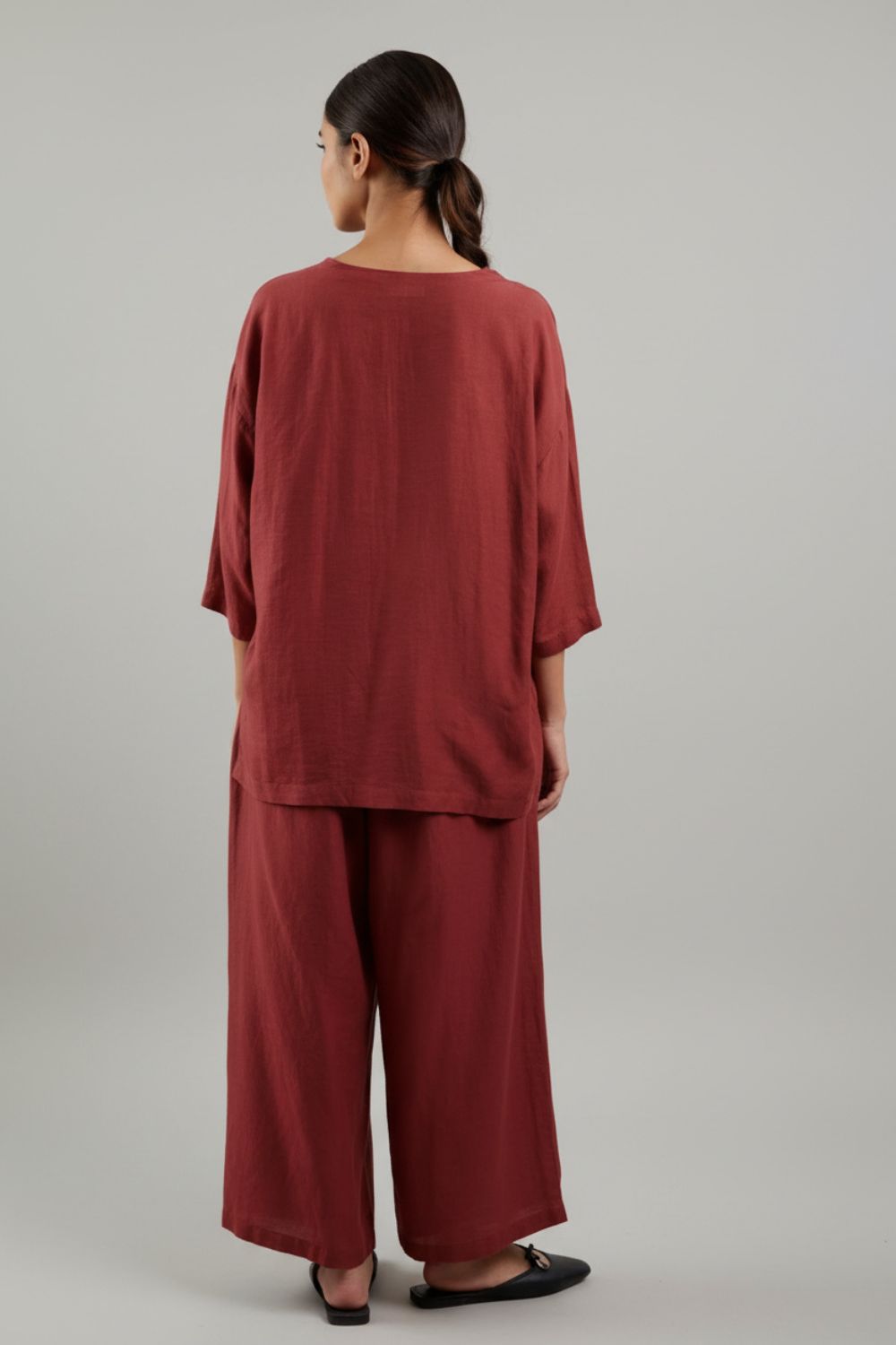 Description: A relaxed-fit co-ord set in luxurious Bemberg fabrics, featuring pleated pants with an adjustable drawstring waist and a flowy, layered top. Designed for effortless elegance, the maroon-hued ensemble drapes beautifully, making it perfect for festive occasions or refined everyday wear.