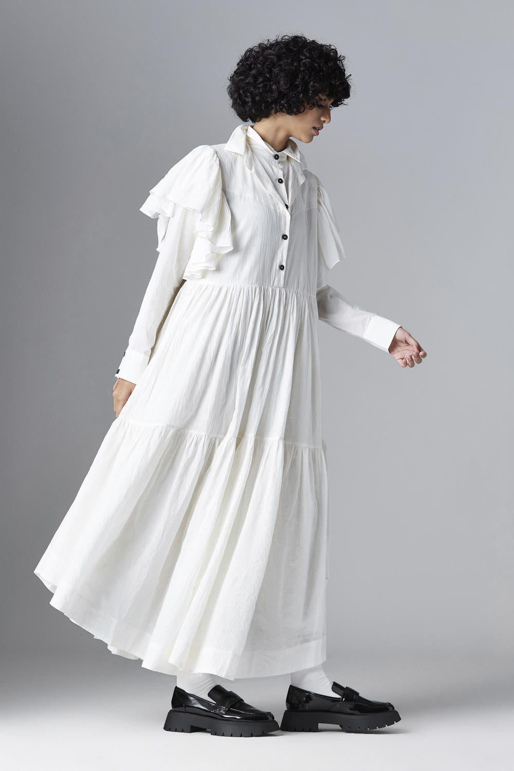 LONG TIERED FRILL DRESS WITH DOUBLE SHIRT COLLAR, HALF BUTTON DOWN PLACKET AND NARROW FULL SLEEVES.