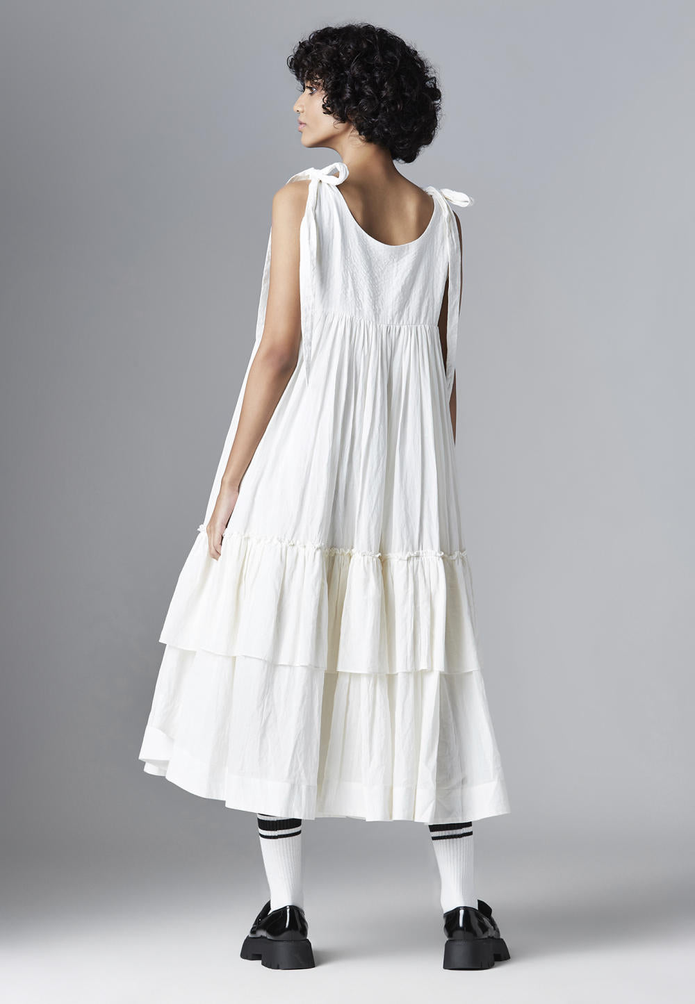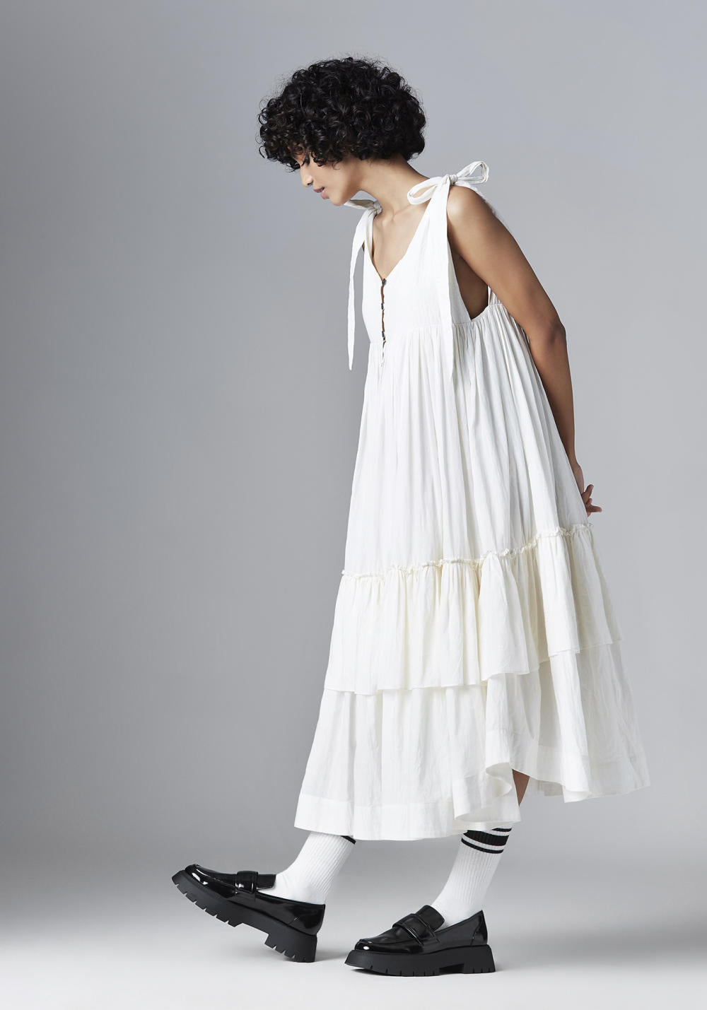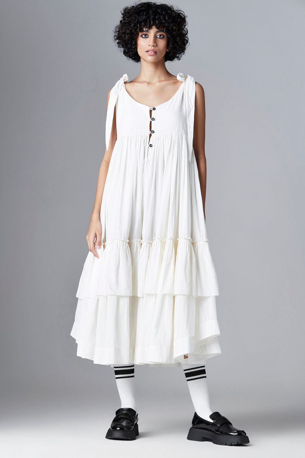 SHOULDER TIE UP FRILL DRESS WITH HALF FRONT LOOP BUTTON OPENING, U SHAPED HEM AND LINING