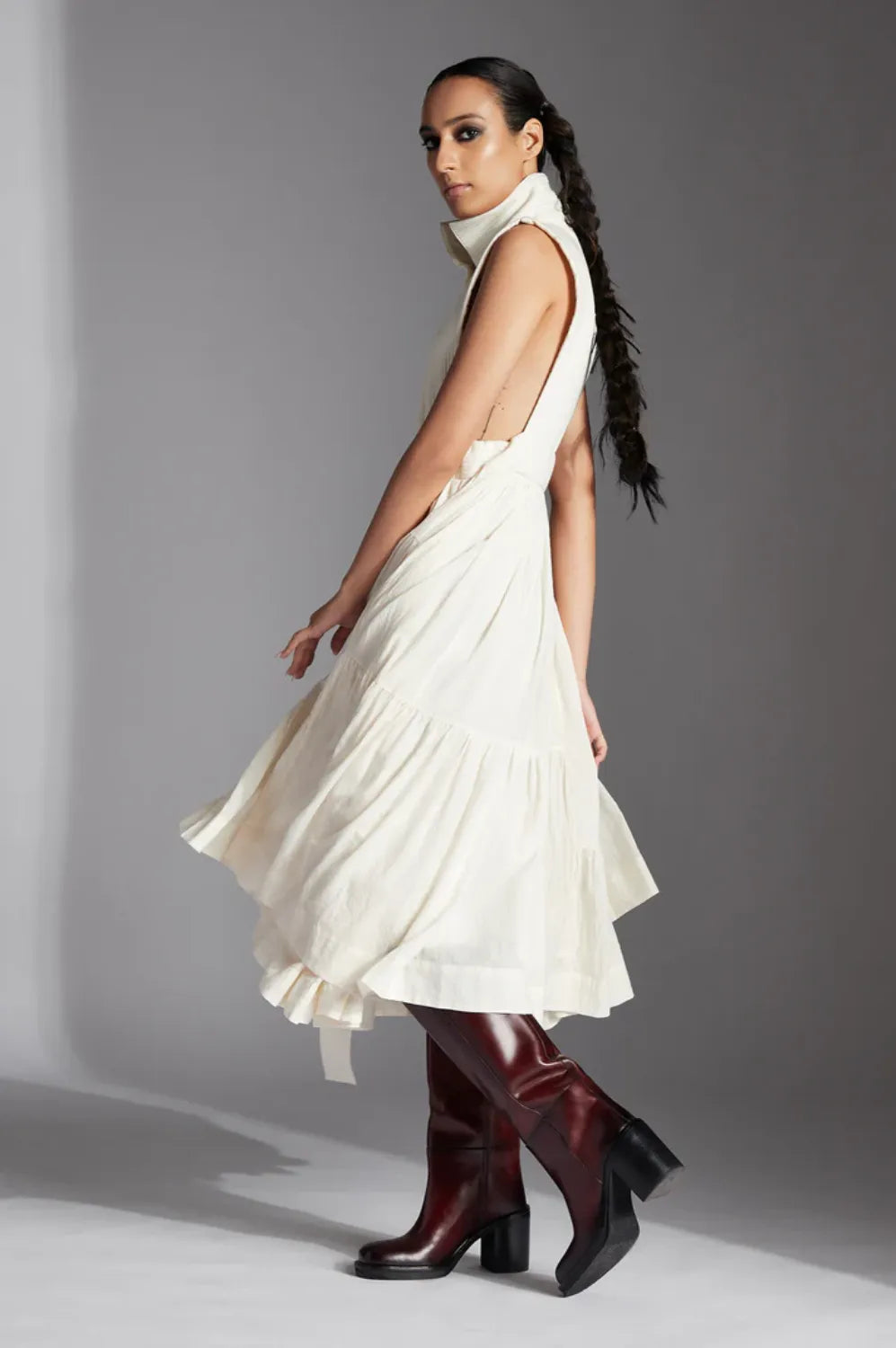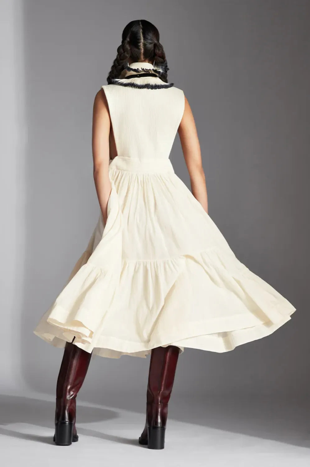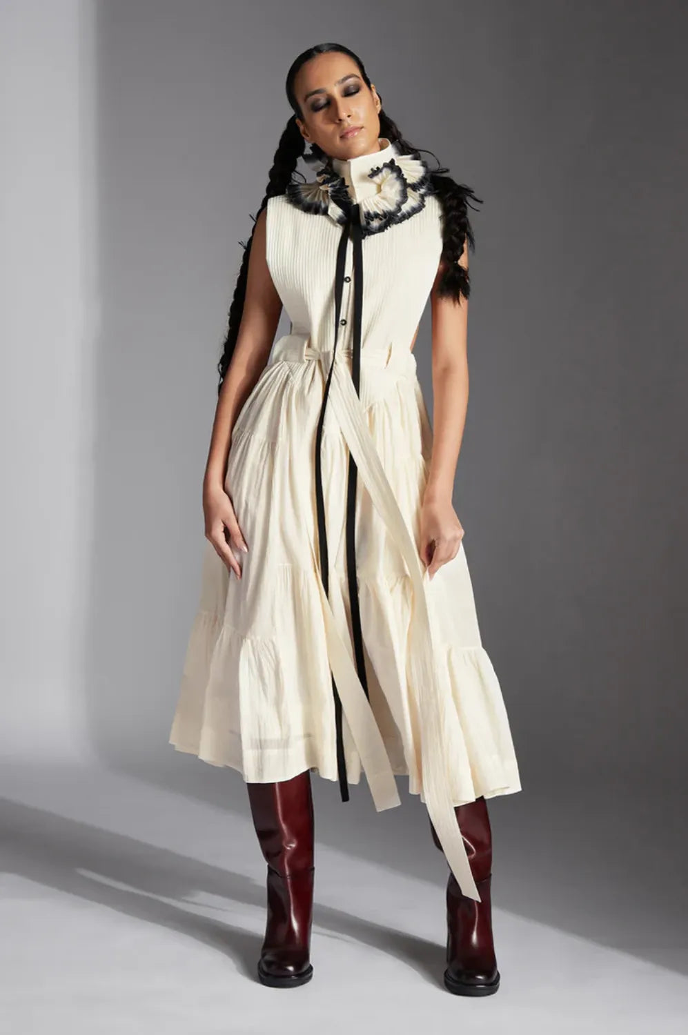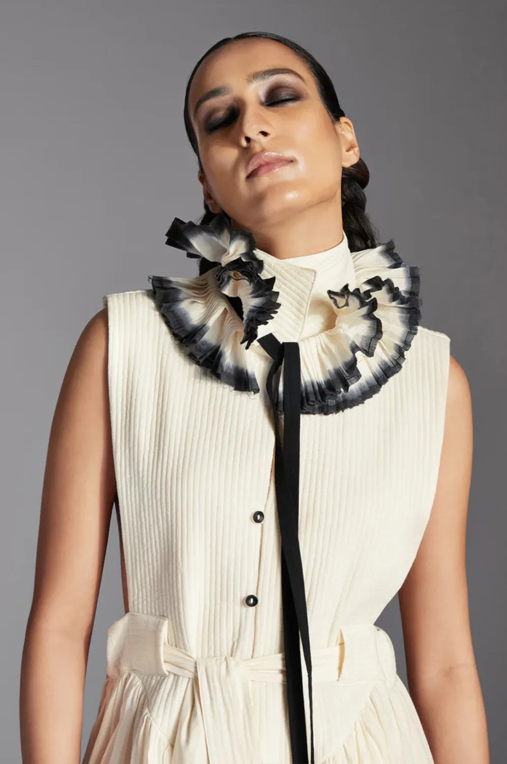 The Mirae dress exhibits a pointed quilted jacket top with an adjustable waist belt. Additionally, it features straight panelled frills and loop and button on the front with a detachable pleateed frill collar.