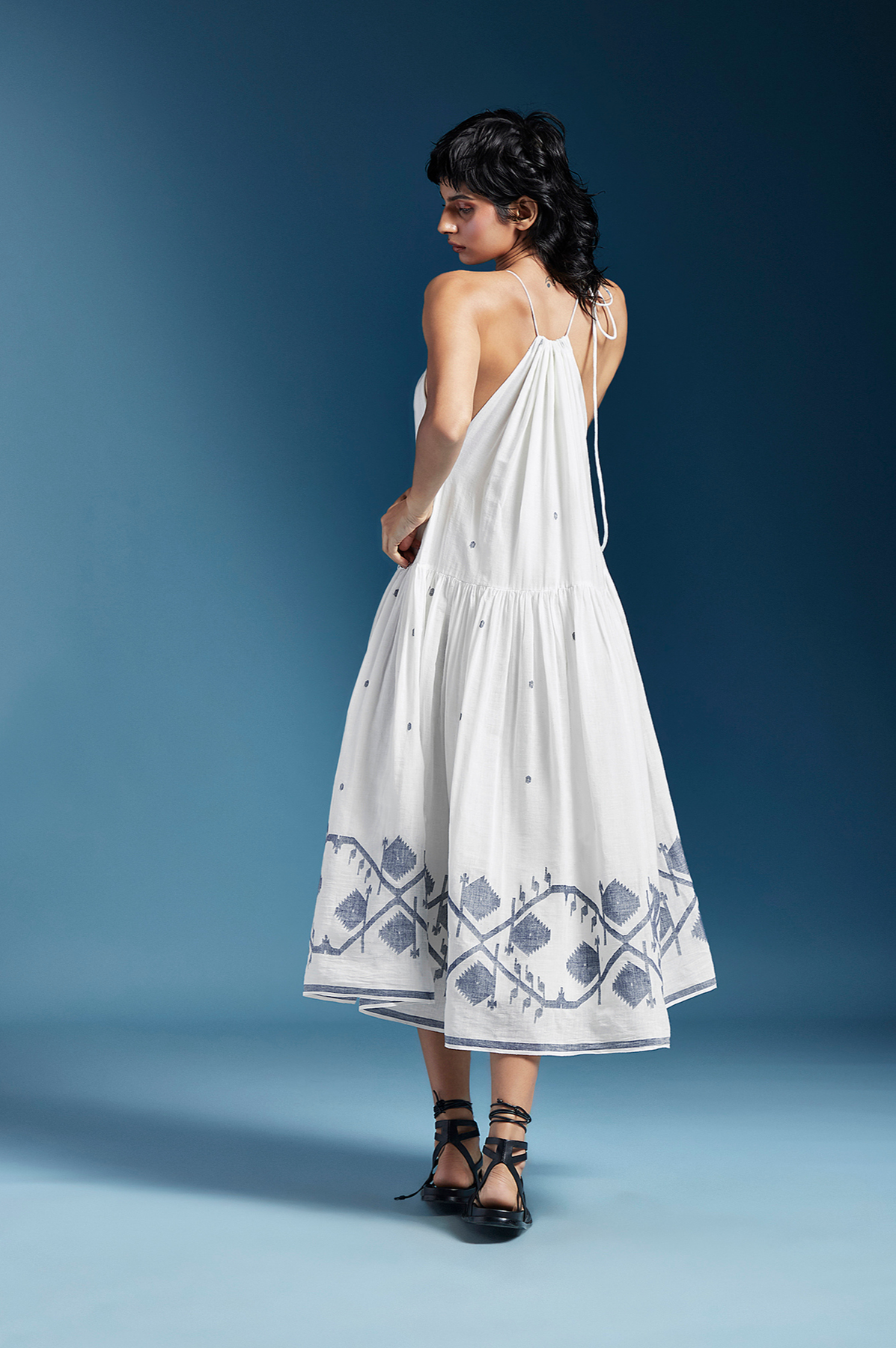 MIDI FLARED DRESS WITH ADJUSTABLE DRAWSTRING NECK AND LINING