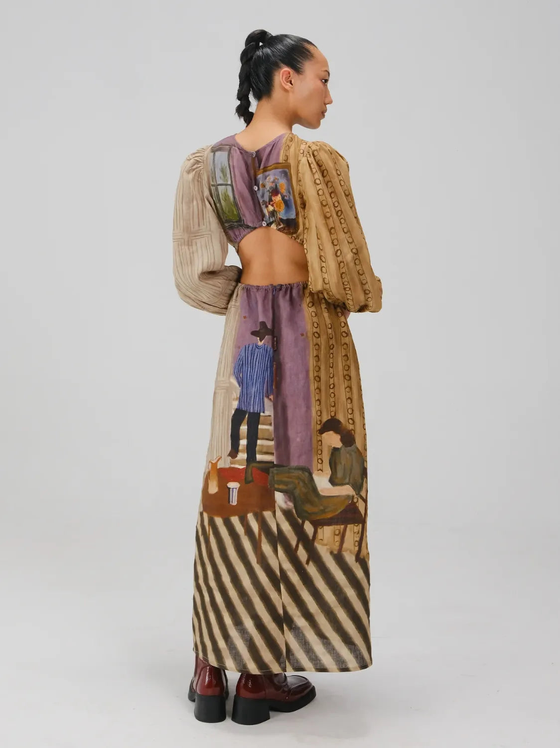 An elongated take on our signature style, crafted from pure linen with a backless design, flared skirt, and gathered sleeves. Its relaxed fit and waist cuts create a breezy, flattering silhouette with effortless charm.