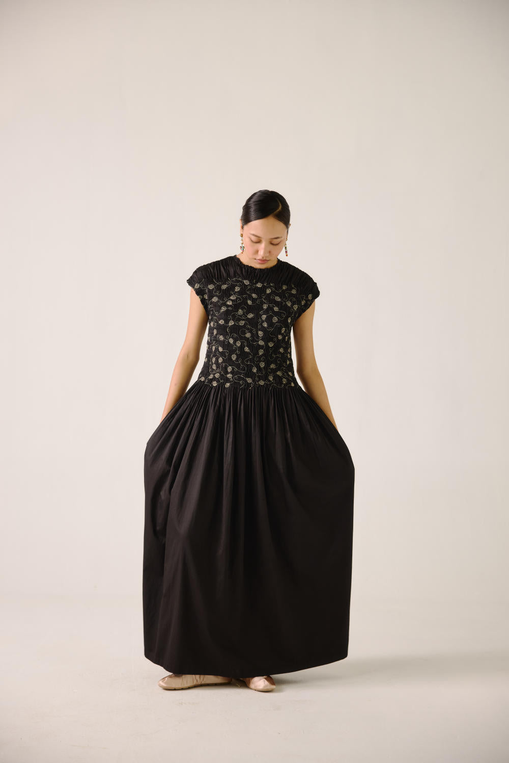 The July dress is made from cotton satin fabric in a black anaar embroidery print. The July dress features a smocked yoke, cap sleeves and a very flattering flair. Fabric : Cotton