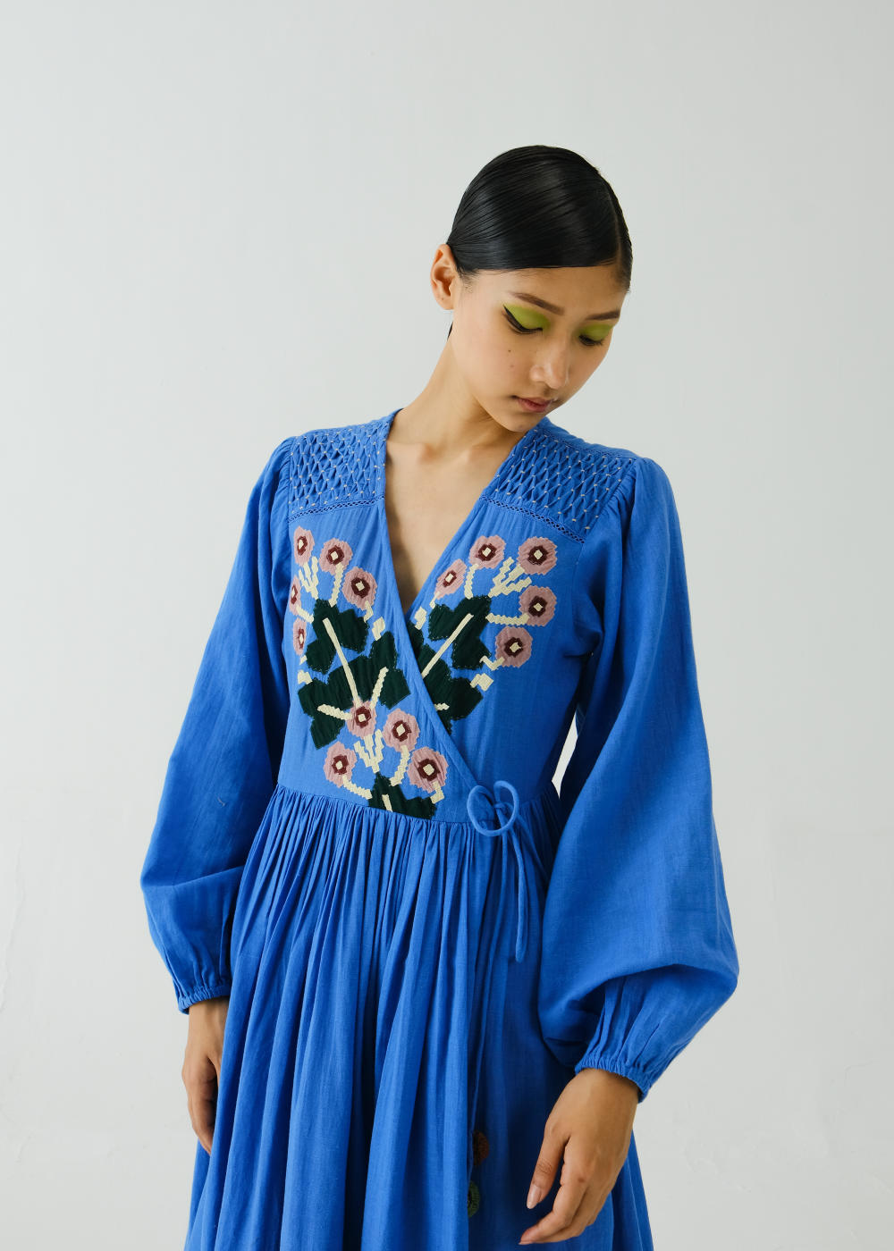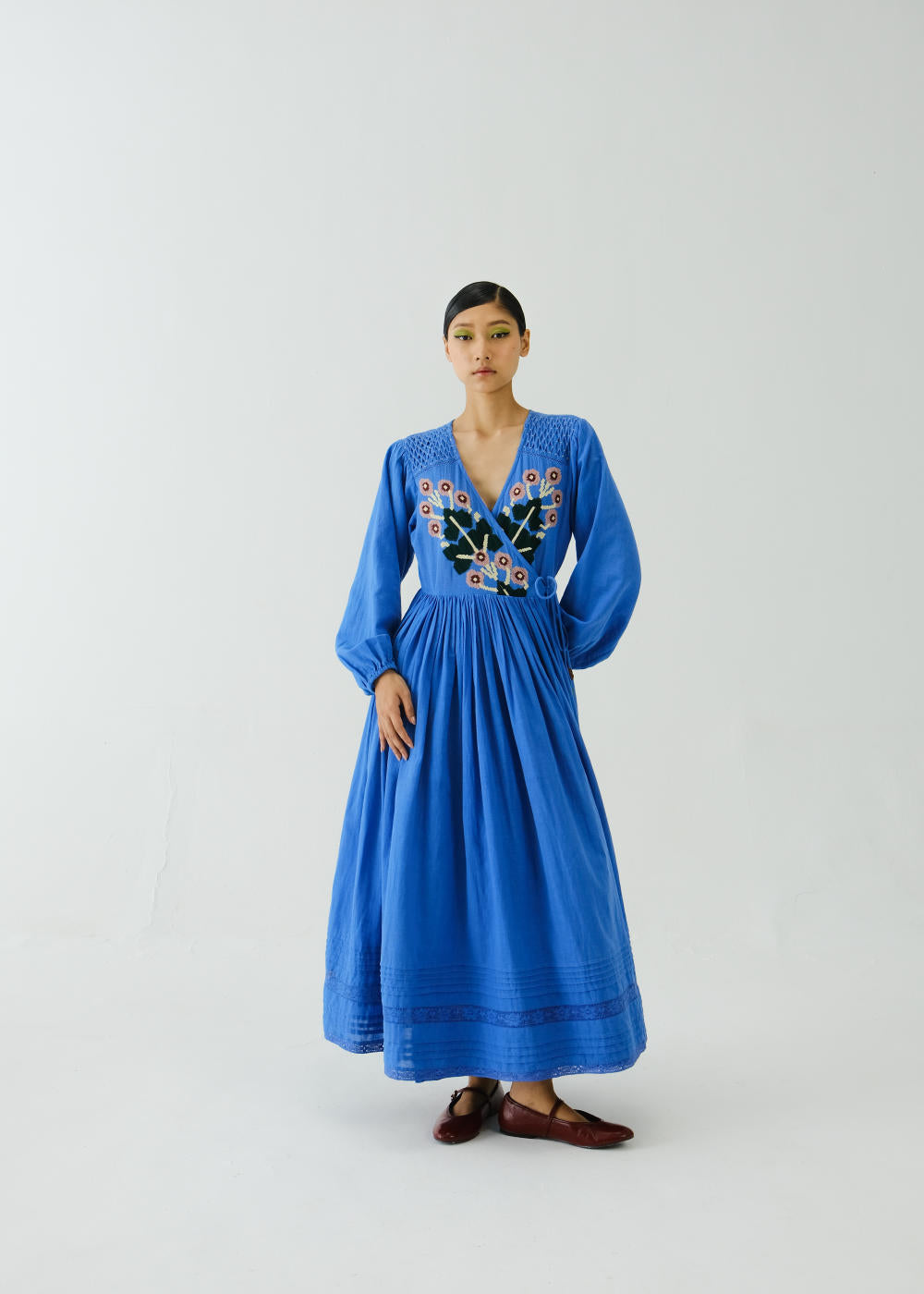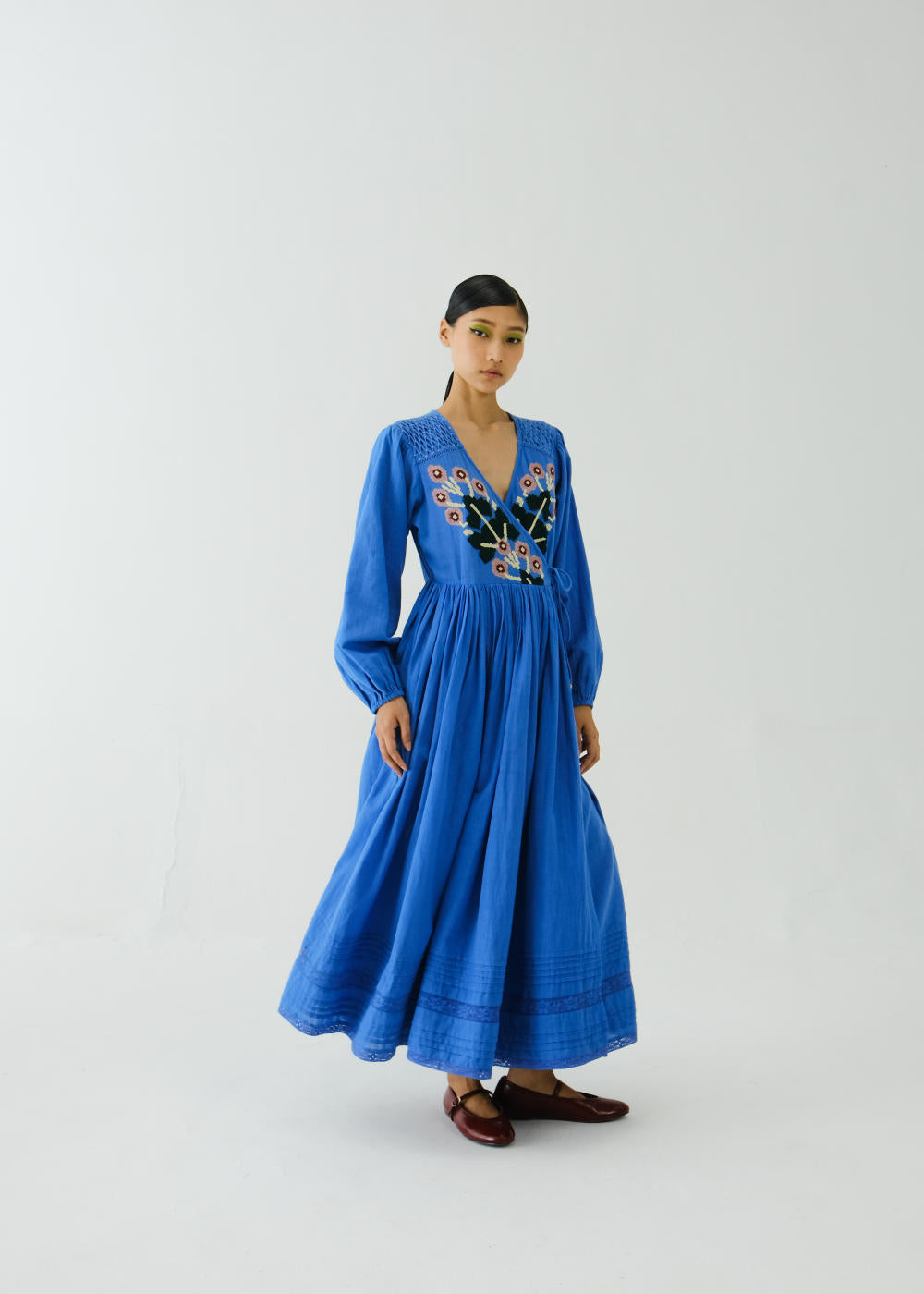 The Poem dress is made from cotton in Electric Blue Pixel Applique on the front. It features a tie-up detail on the front yoke, lace inserts, pintucks along the flair and gathers around the waist.