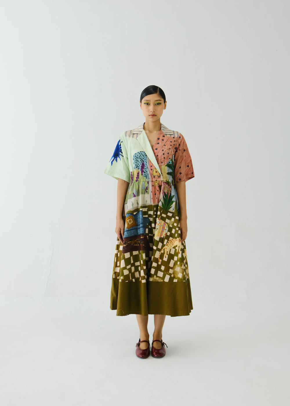 This stylish dress featuring notched lapels, elasticated waist and color blocked design element, with separate color blocked panel at the bottom around legs is made in cotton Satin fabric. This dress is a must-have statement piece for your wardrobe.