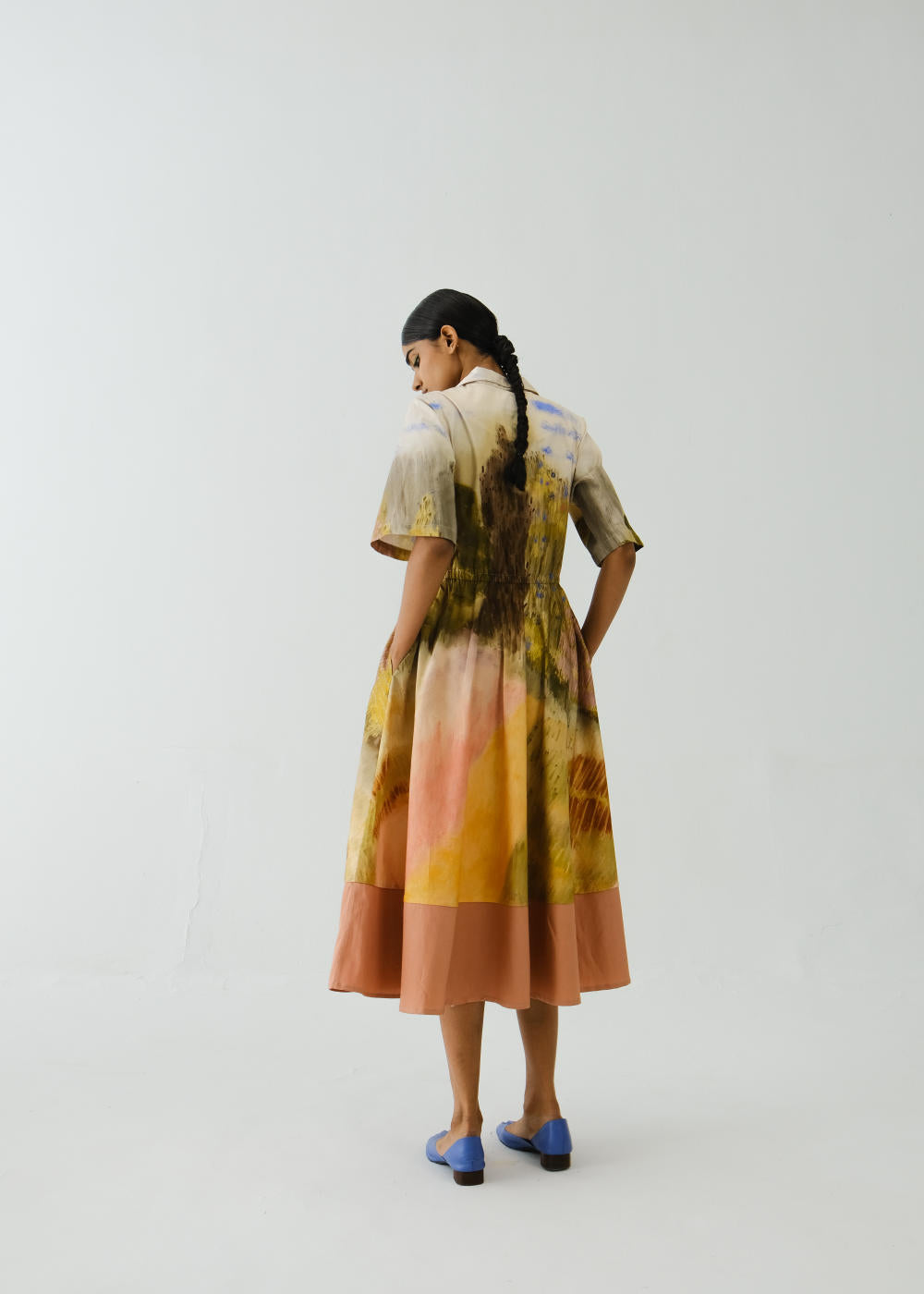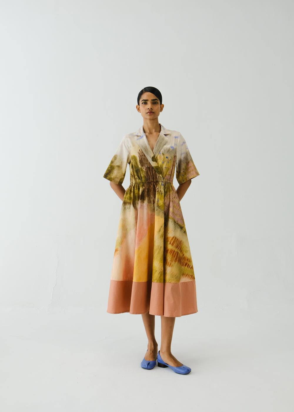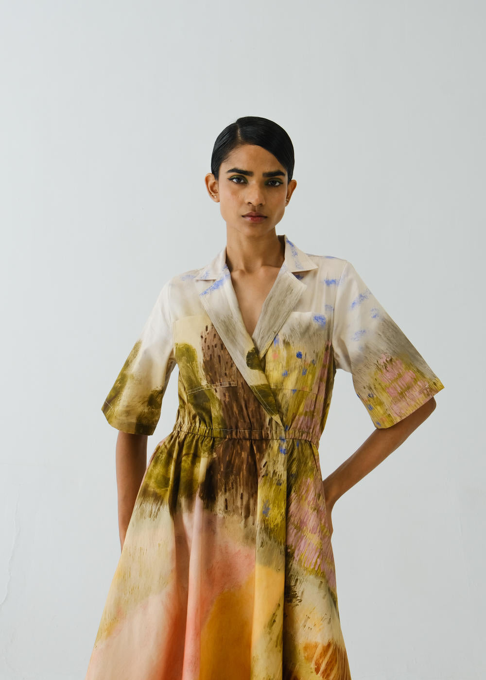 This stylish dress featuring notched lapels, elasticated waist and color blocked design element, with separate color blocked panel at the bottom around legs is made in cotton Satin fabric. This dress is a must-have statement piece for your wardrobe.
