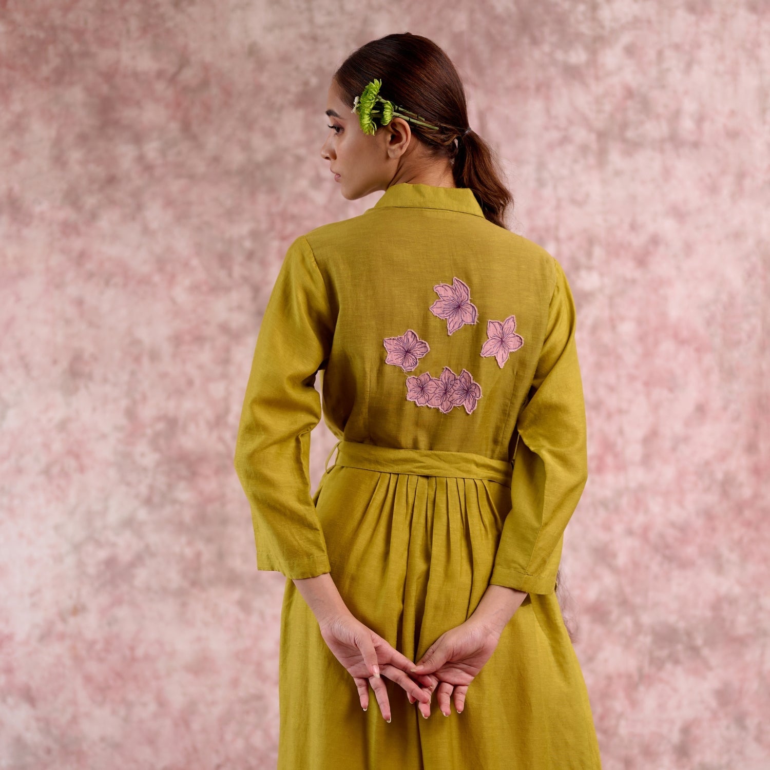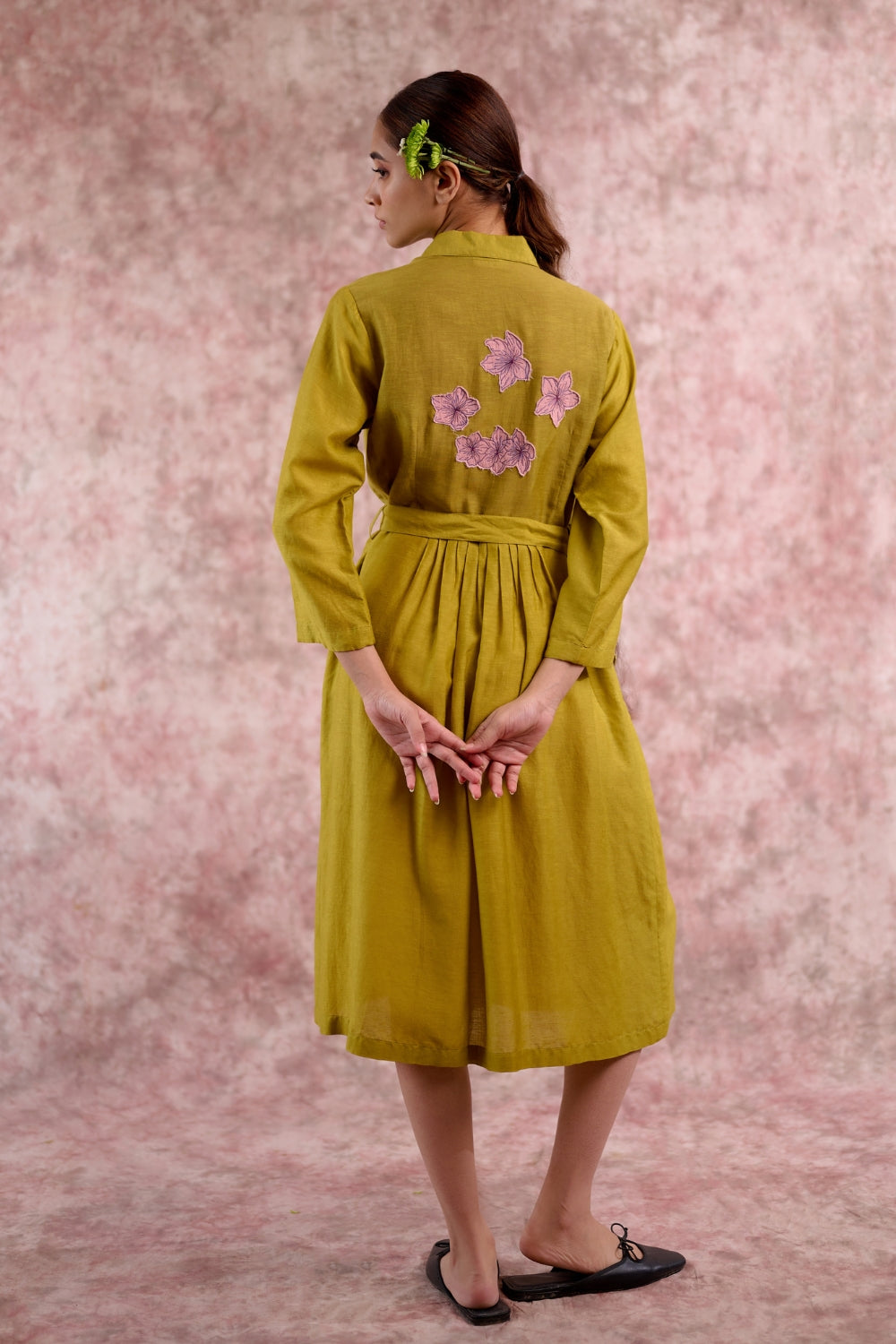 Comfortable shirt dress featuring a full front opening, a one-piece collar, back pleats, and side pockets. The dress includes a bottom frill and is enhanced bymachine embroidered flowers.