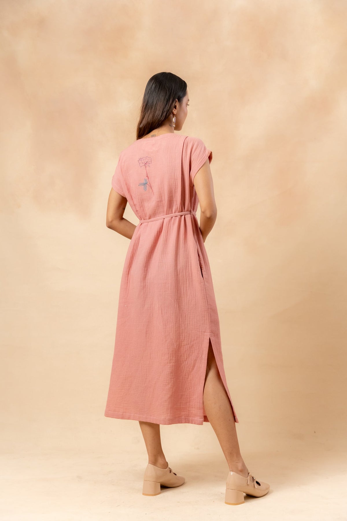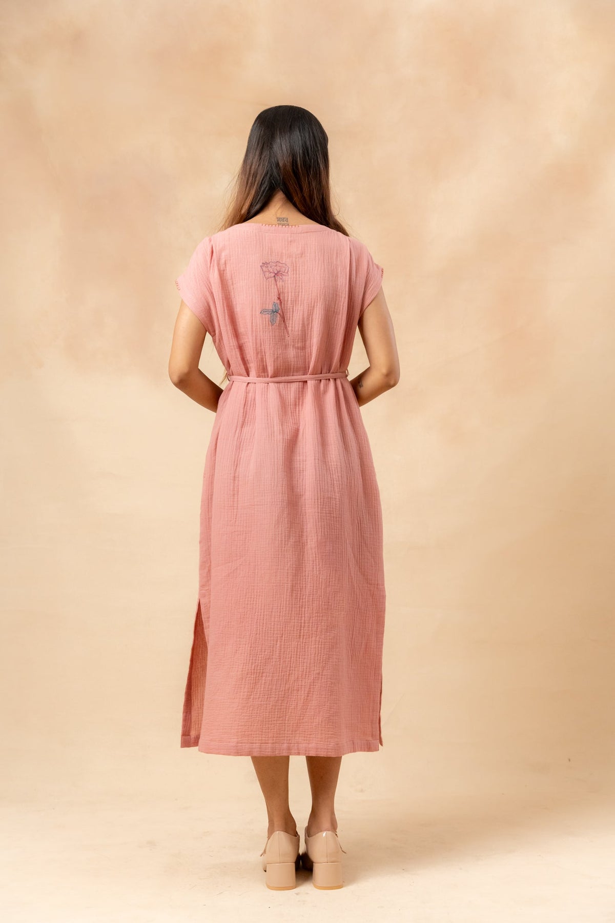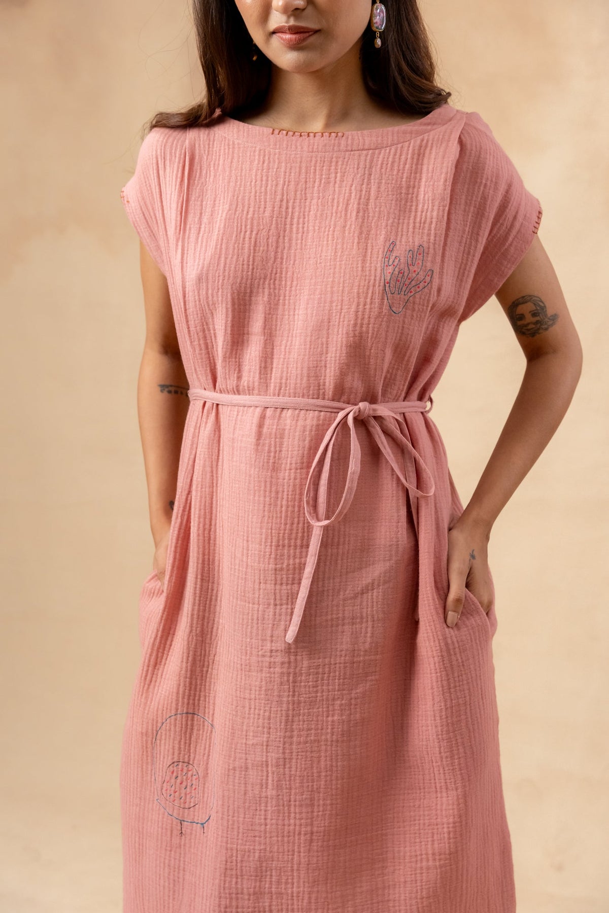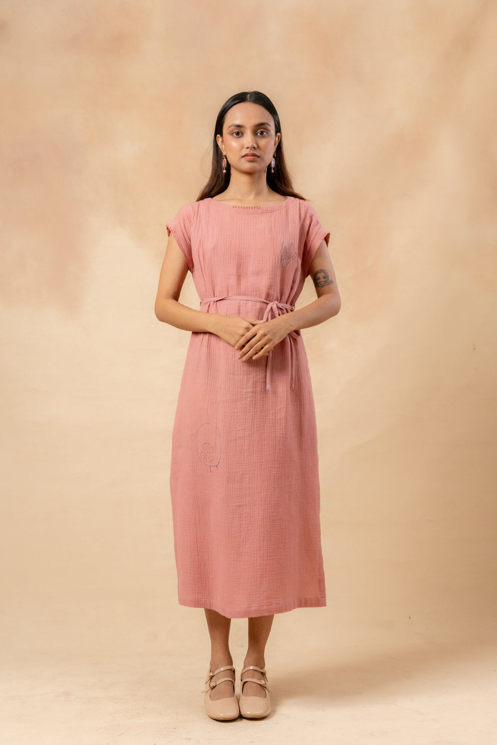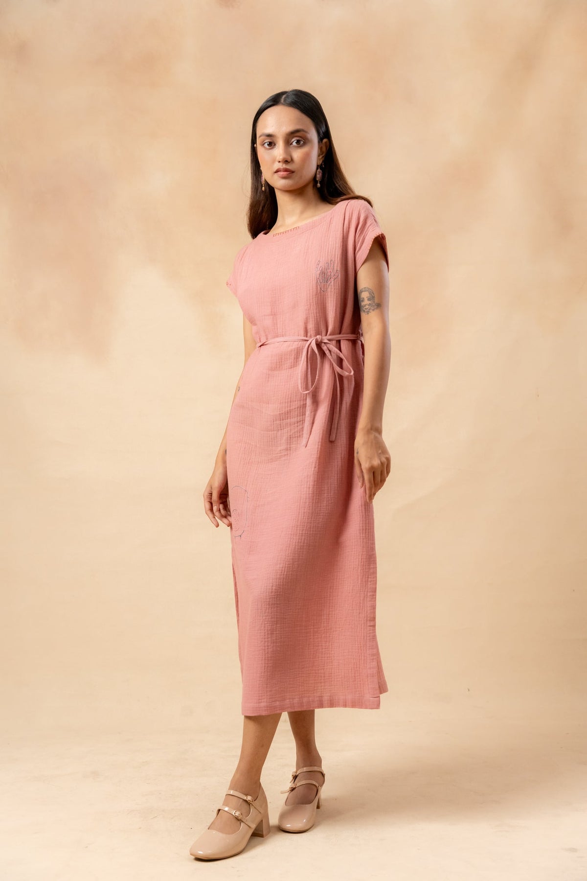 Description: Straight fit organic cotton dress, with belt, side pockets, doodle embroidery and side slit.