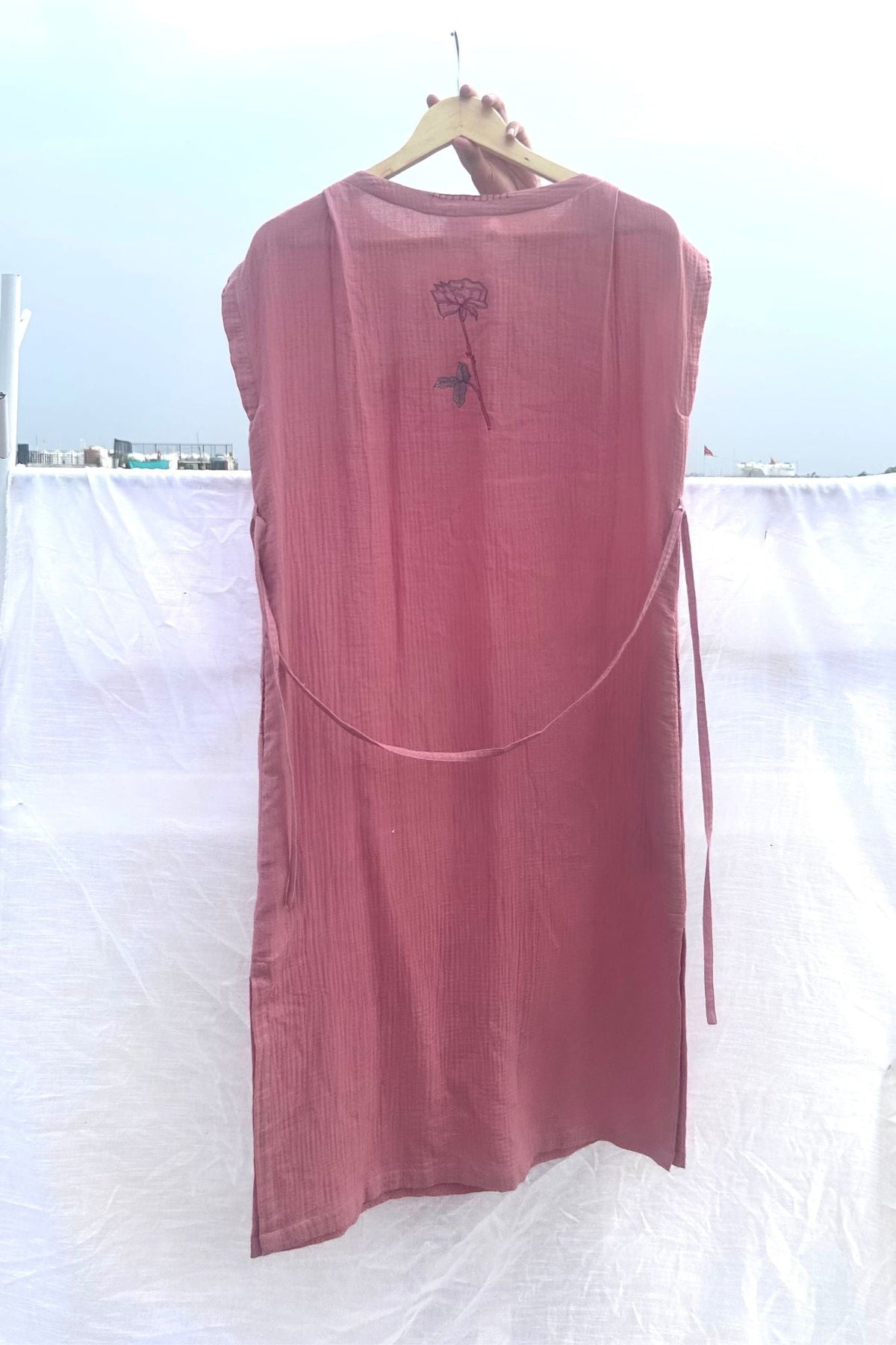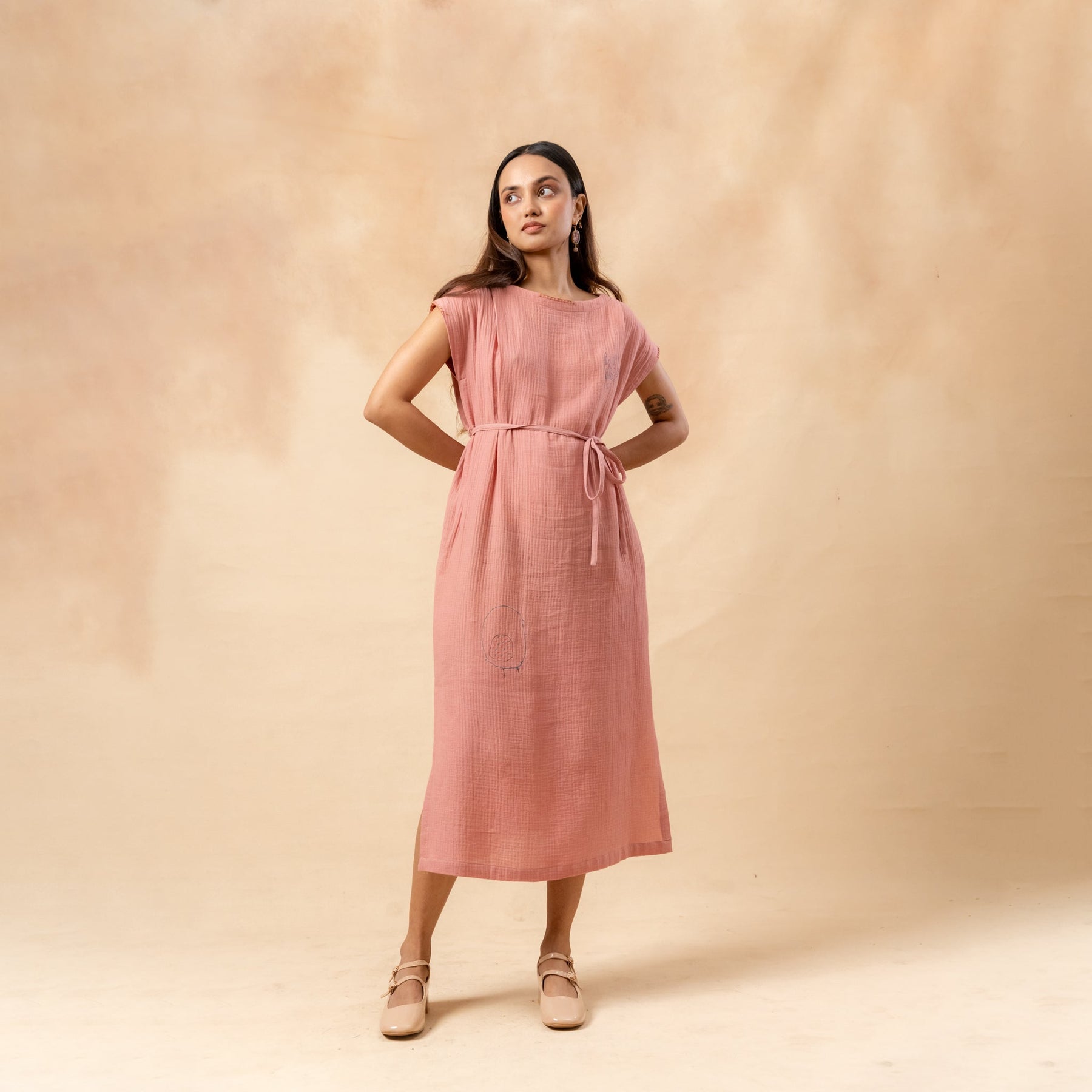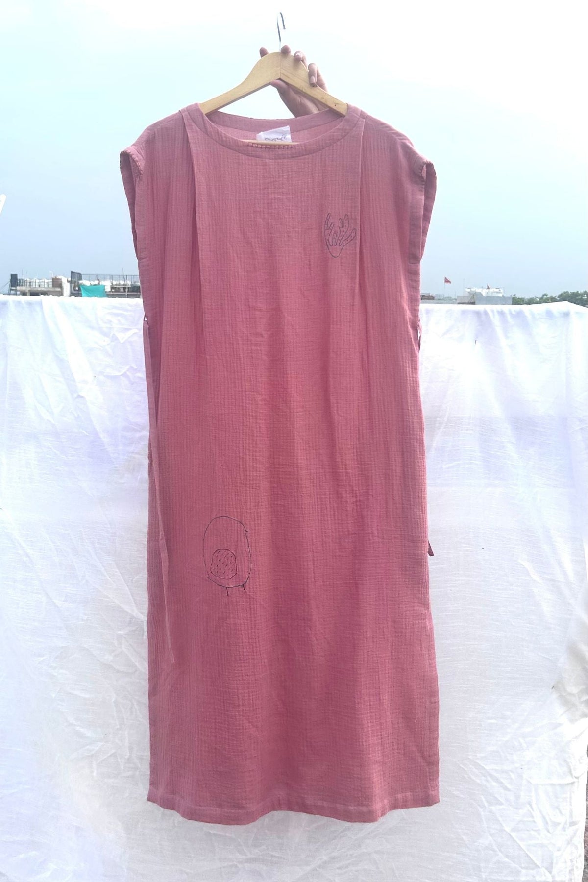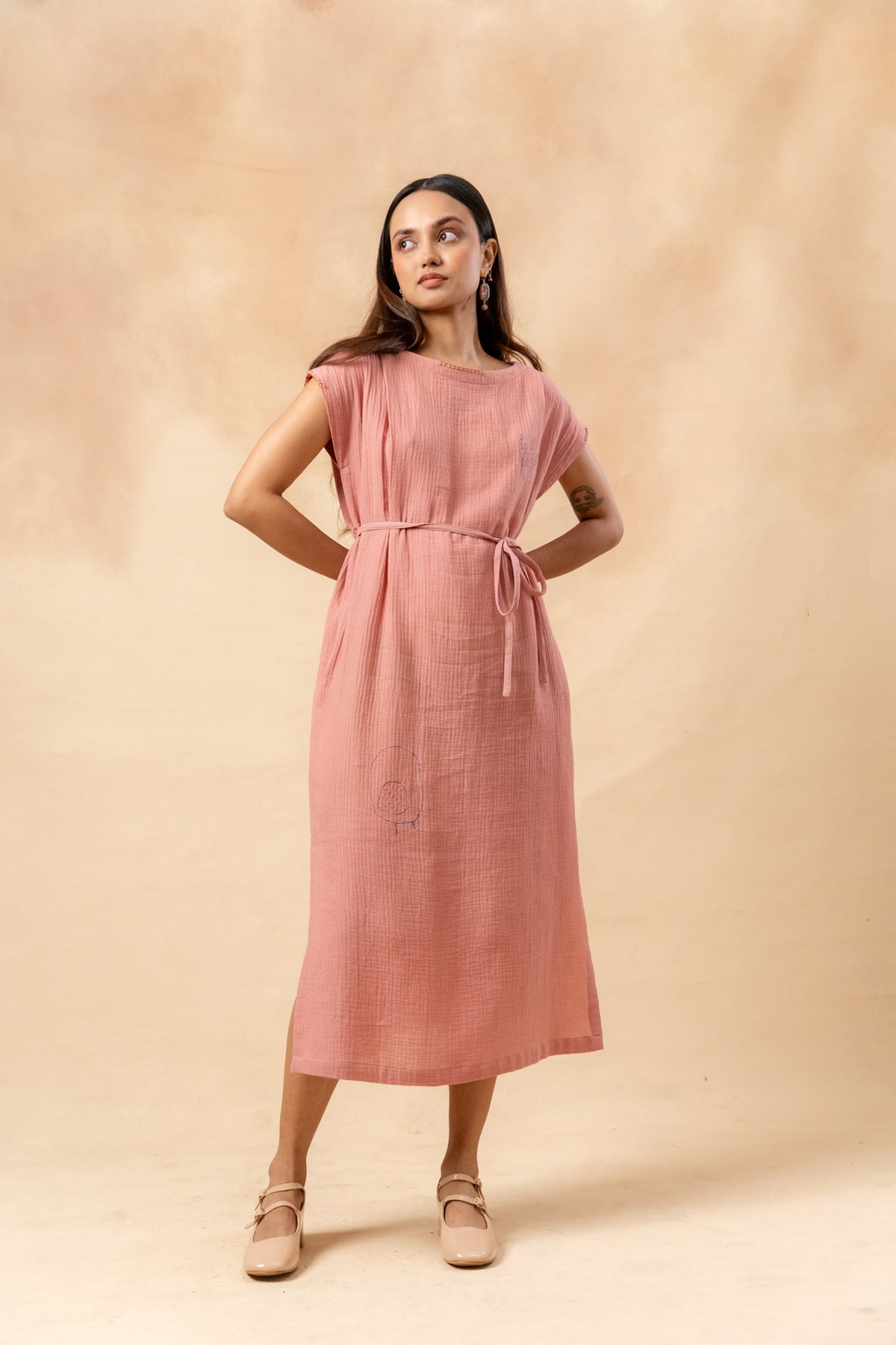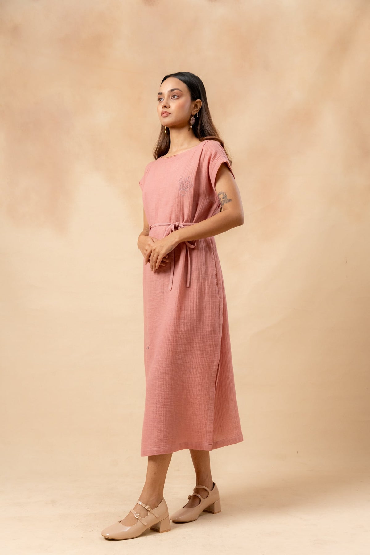 Description: Straight fit organic cotton dress, with belt, side pockets, doodle embroidery and side slit.