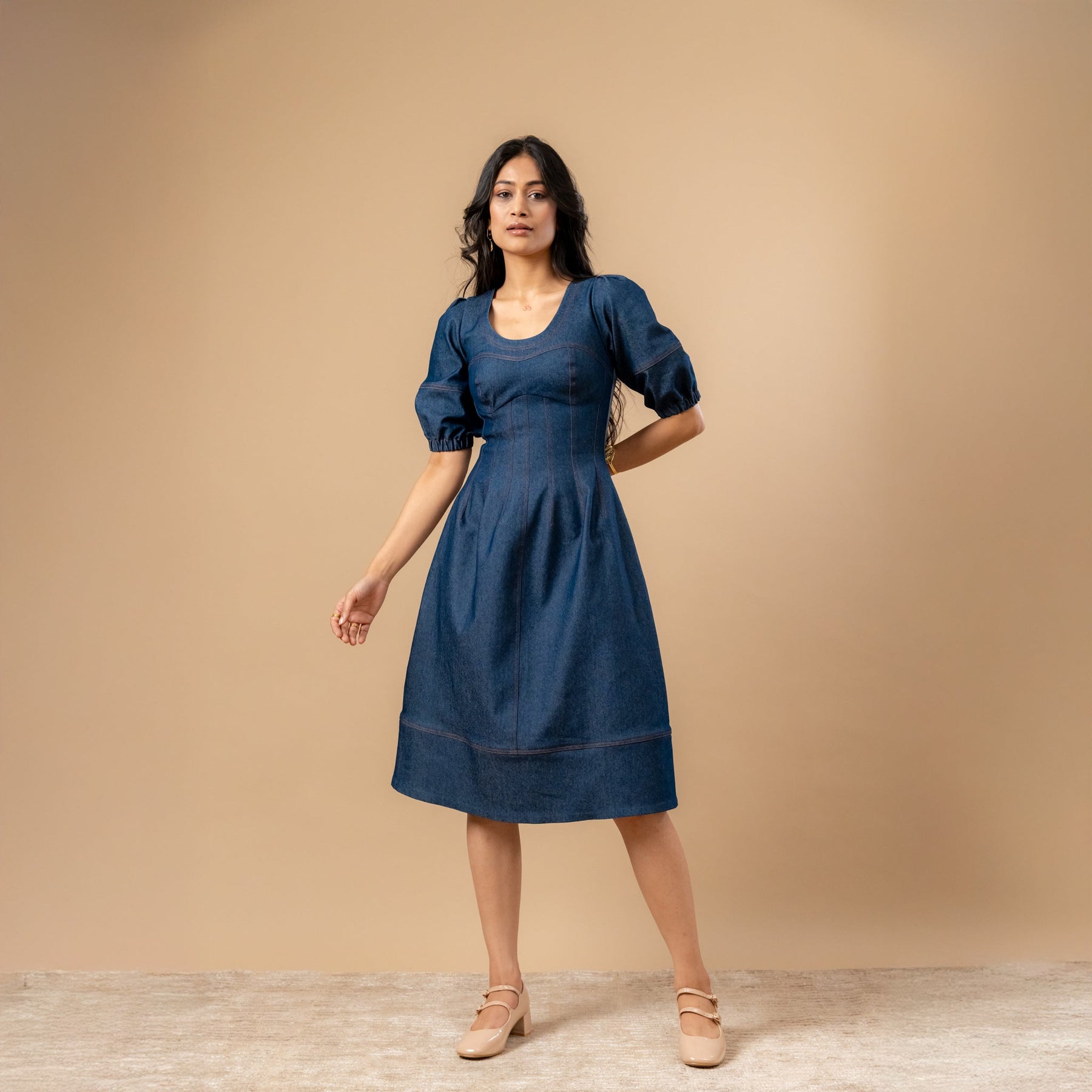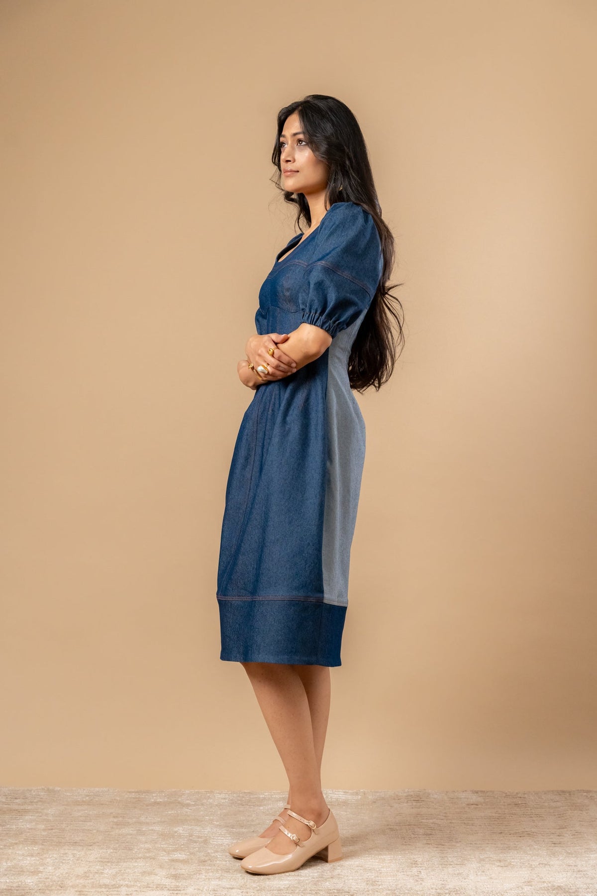 Description: Fitted bustier dress with elasticated sleeves made from denim waste
