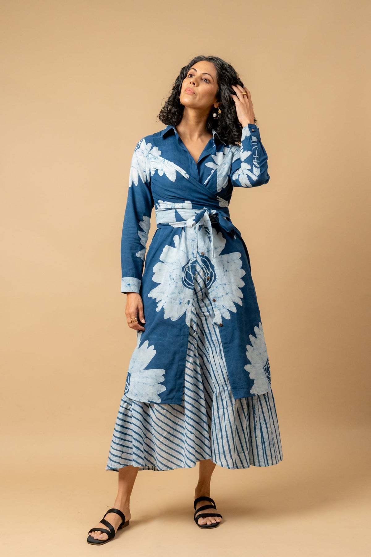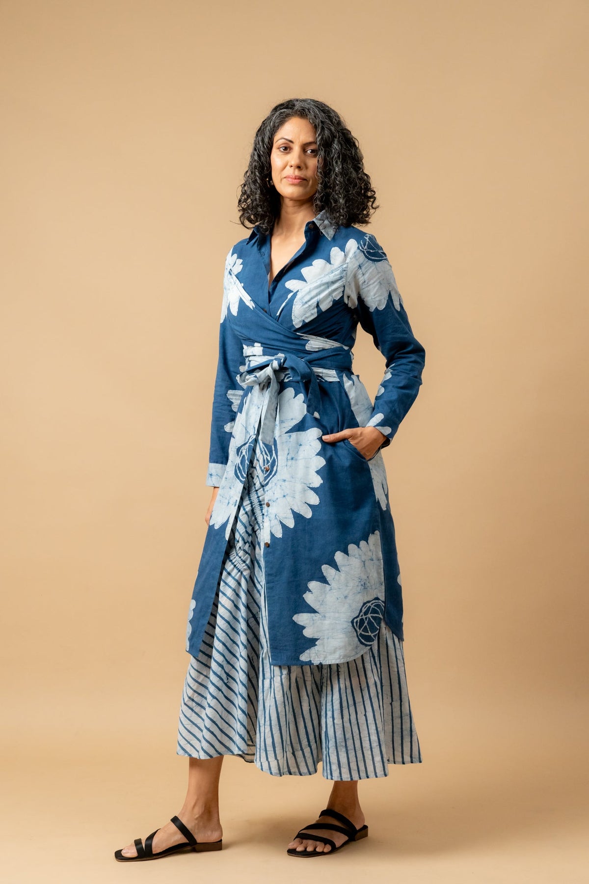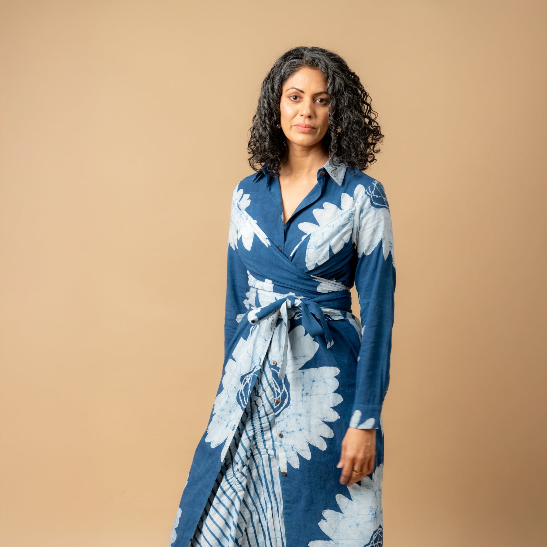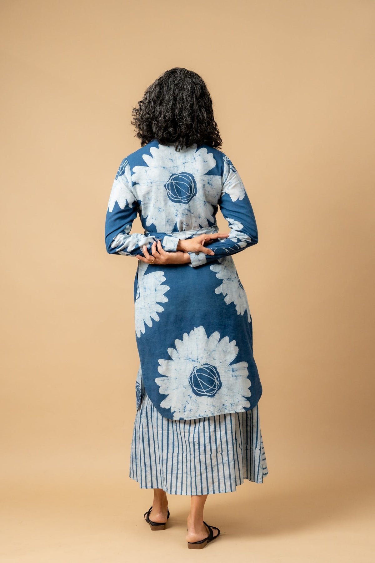 Description: Buttondown warp shirt dress with buttonhole stitch hand embroidery around around cuff and collar to uplift the piece. Hand painted batik fabric