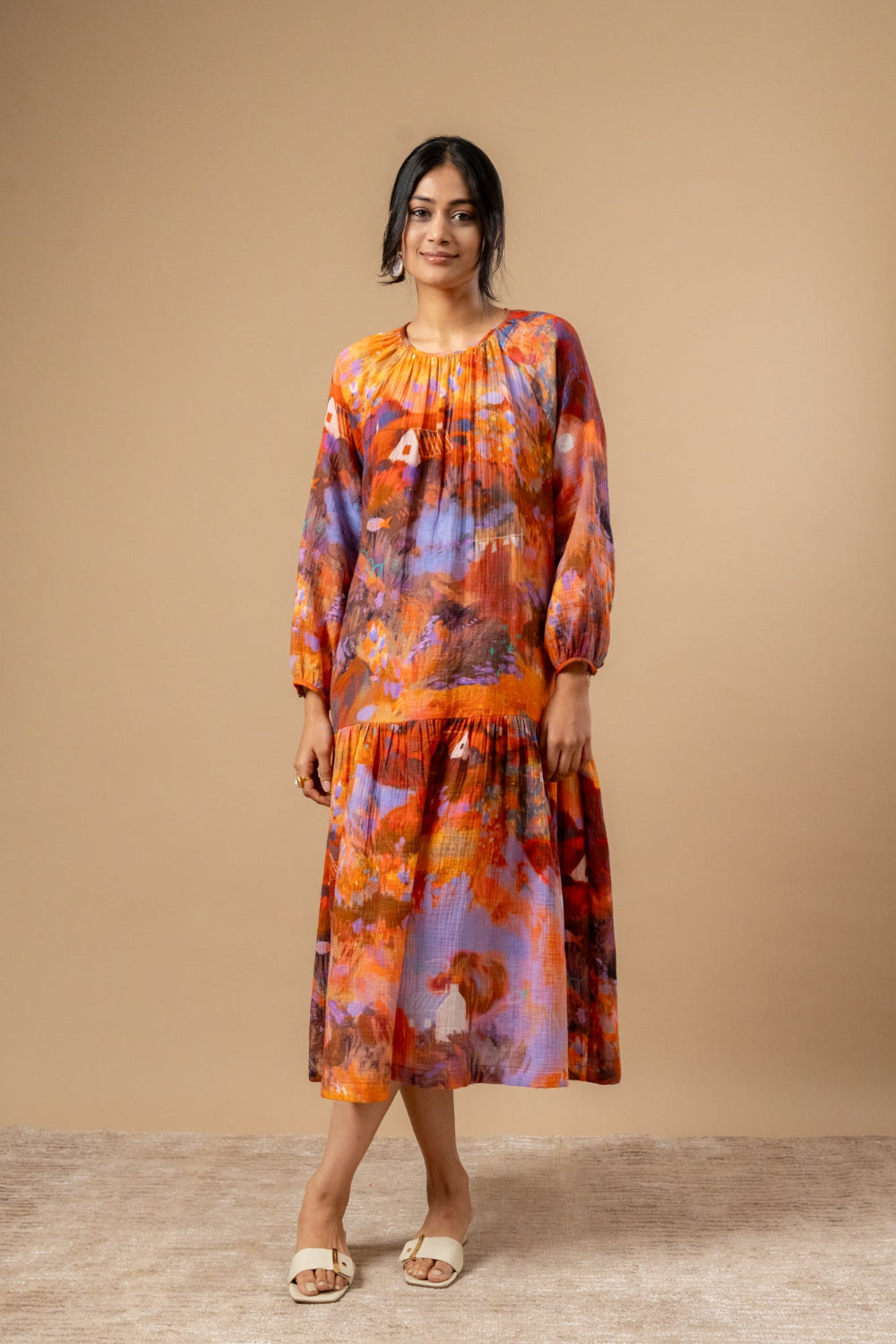 Description: Neck gathered, loose-fitted dress with hand-painted doodle print on organic cotton, dress comes with side pockets.