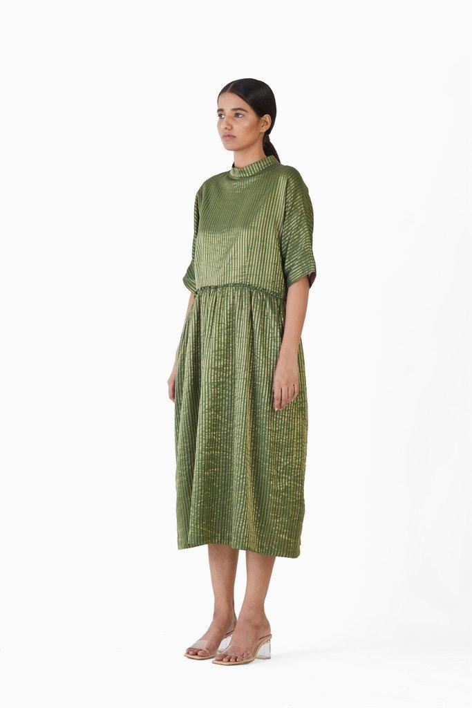 Handwoven in fine silk,cotton & zari , this gathered dress makes for luxurious