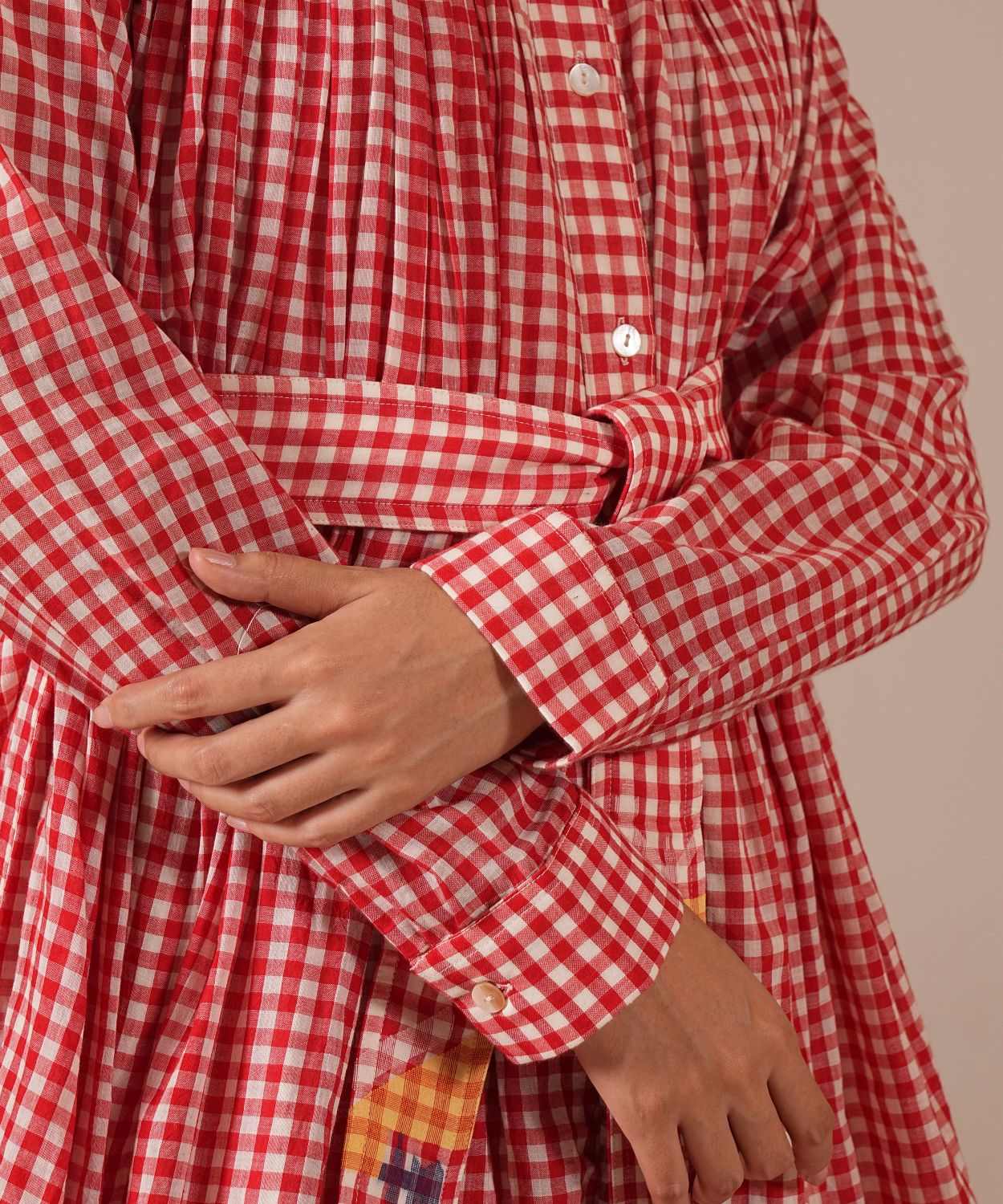 A minimalistic tiered shirt dress featuring high collar neck, front button fastening, full sleeves that comes with gentle pleats at the front and back which be styled in multiple ways. This dress also comes with a separate slip and a removable tie belt.