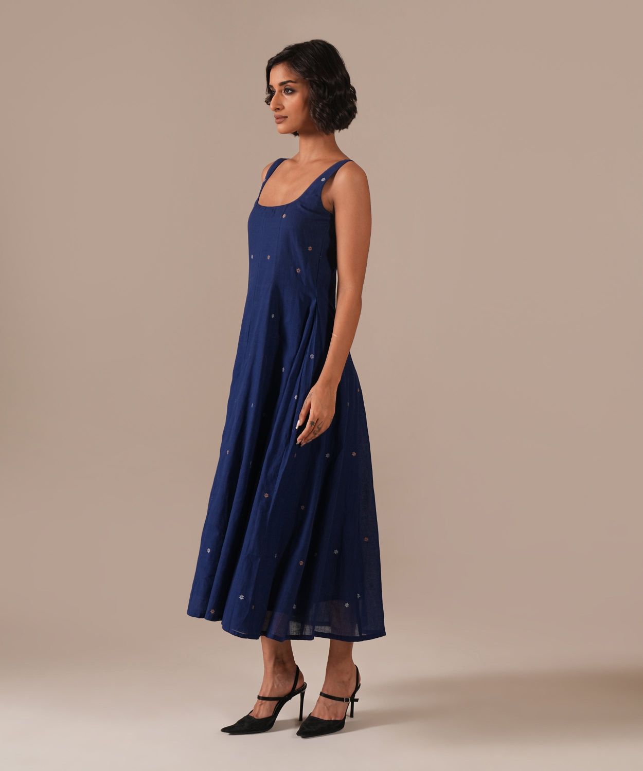 The jamdani fit-and-flare dress featuring a deep square neck, back zipper fastening, and kali/panel detailing is perfect for your summer. Handwoven by Indian artisans, the dress comes with side pockets.