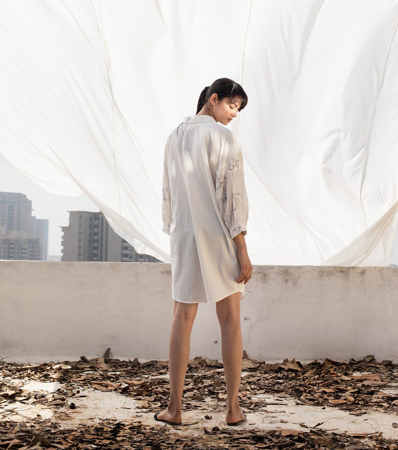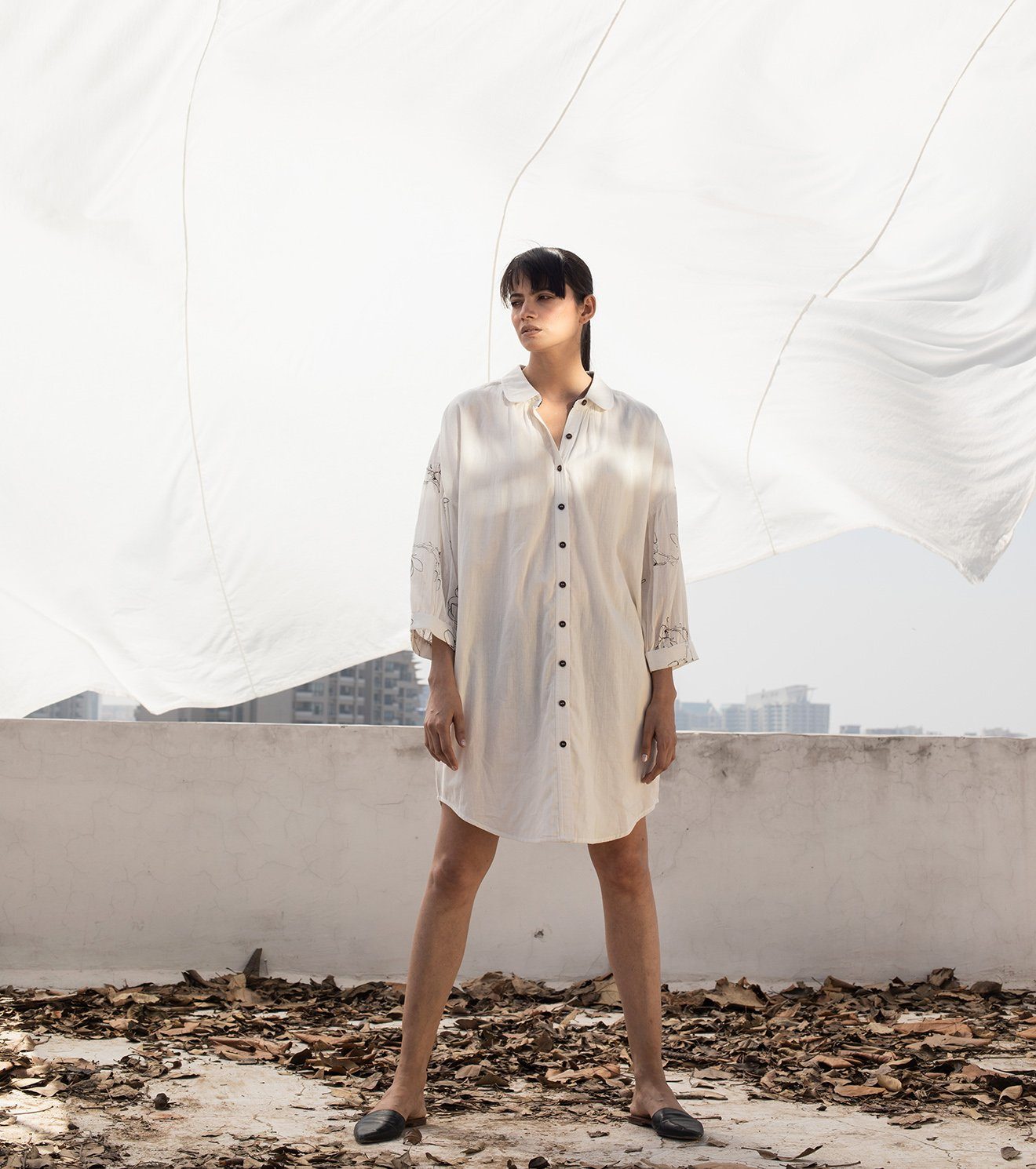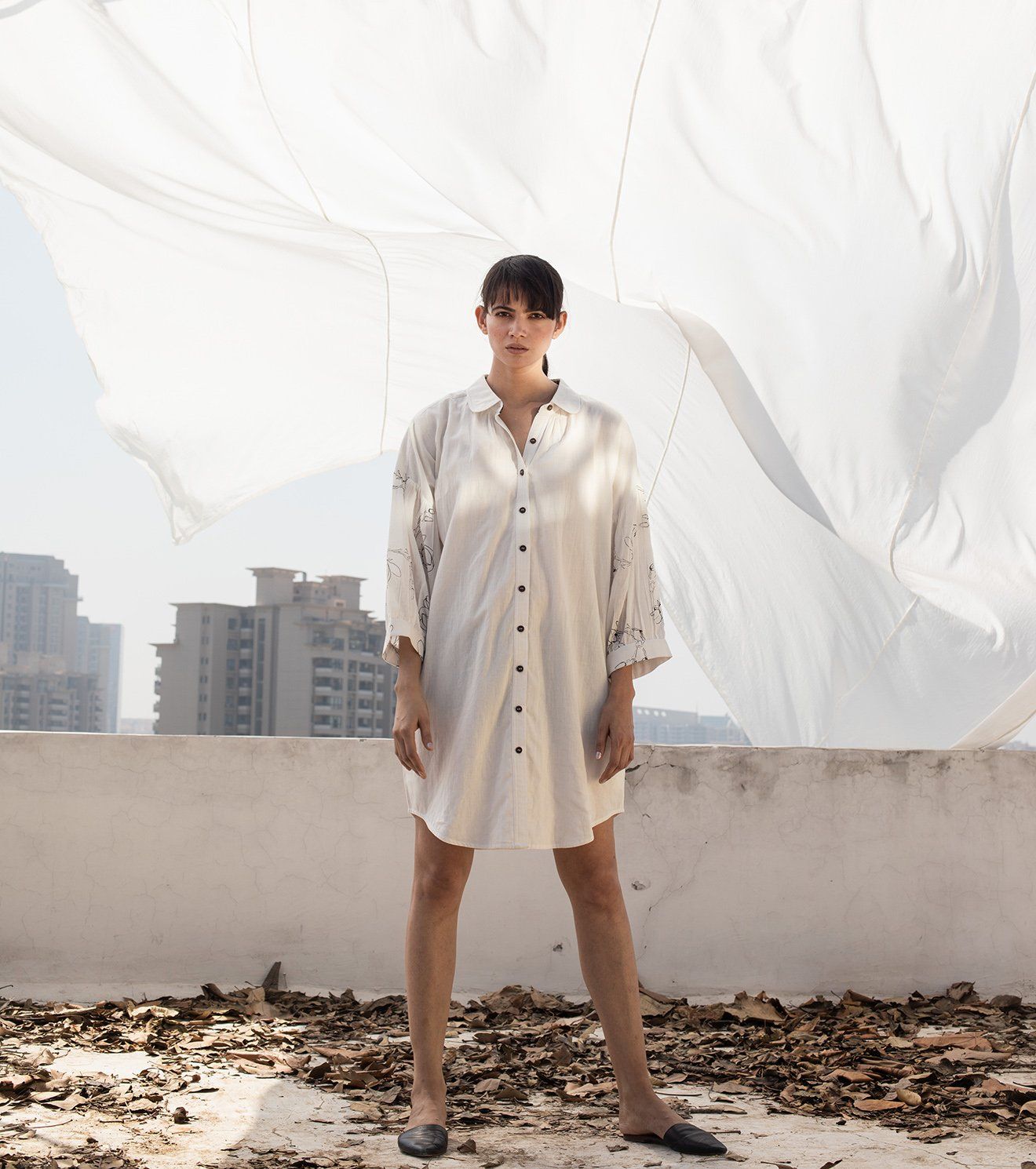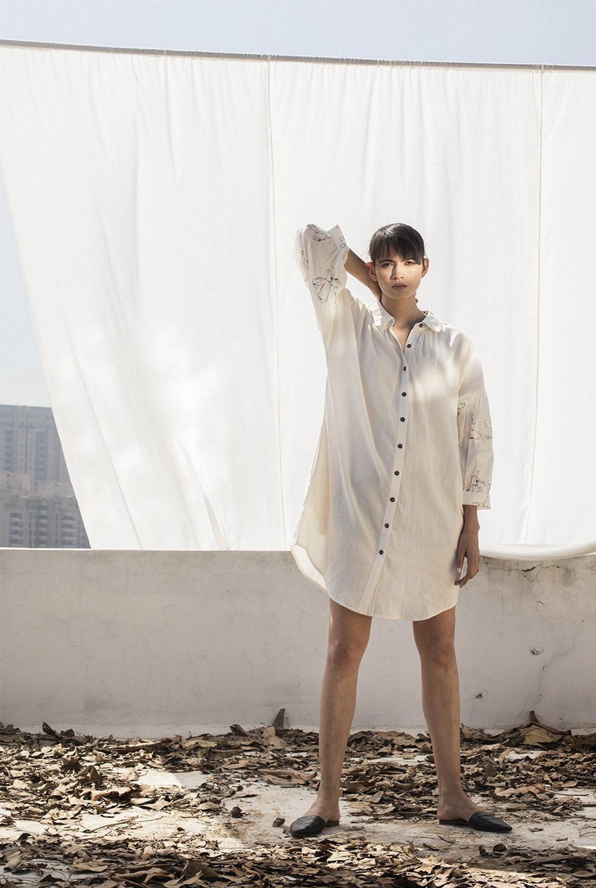 Ivory mulmul mini shirt dress with a regular collar, button-down placket, drop shoulder and three fourth sleeves with screen printed florals.