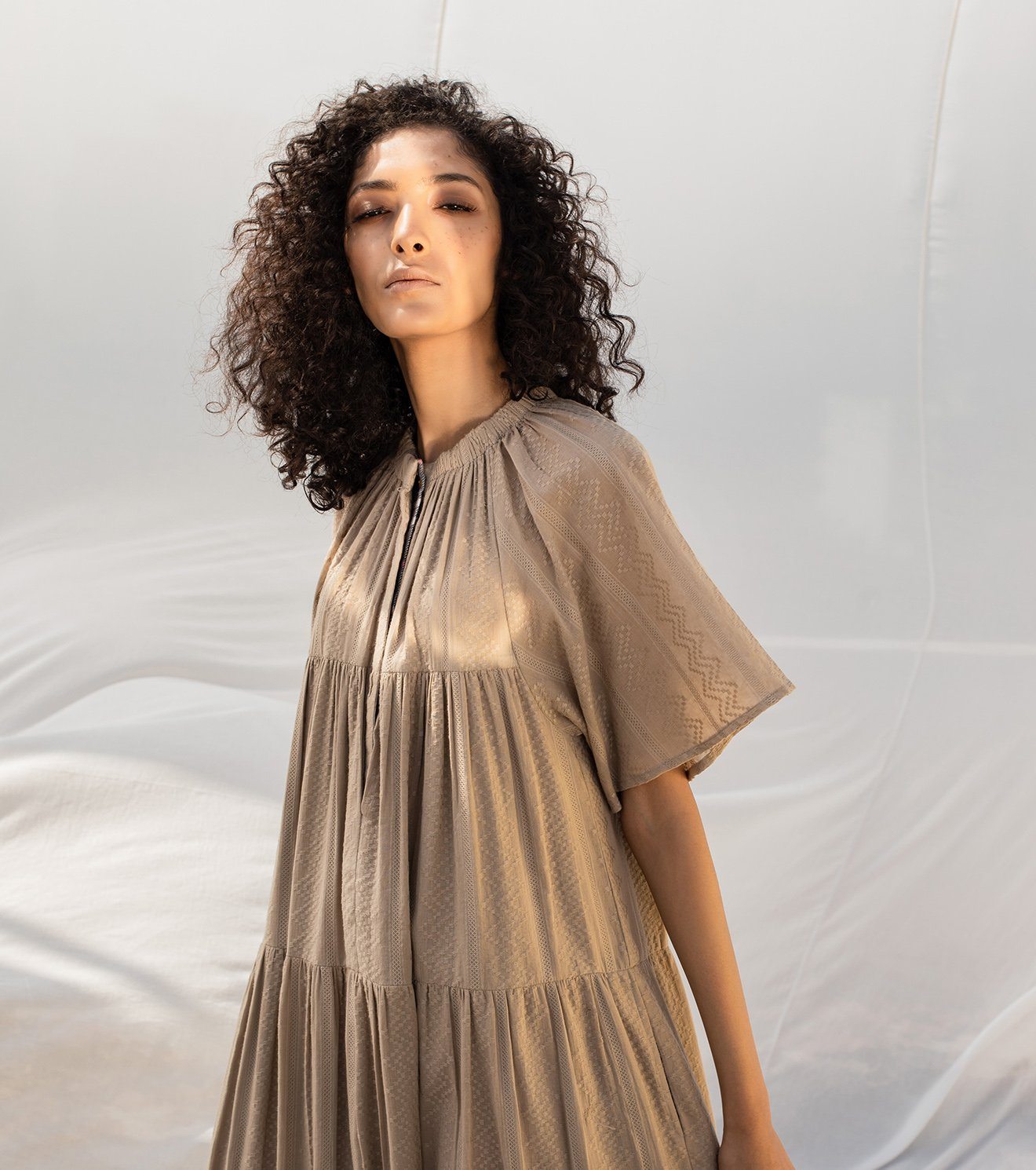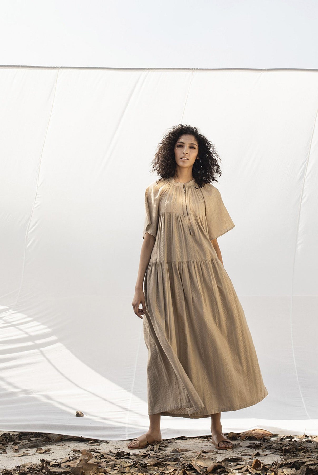 Beige self-embroidered cotton tiered tent maxi dress with gathers on the neckline, an invisible placket and kimono sleeves.