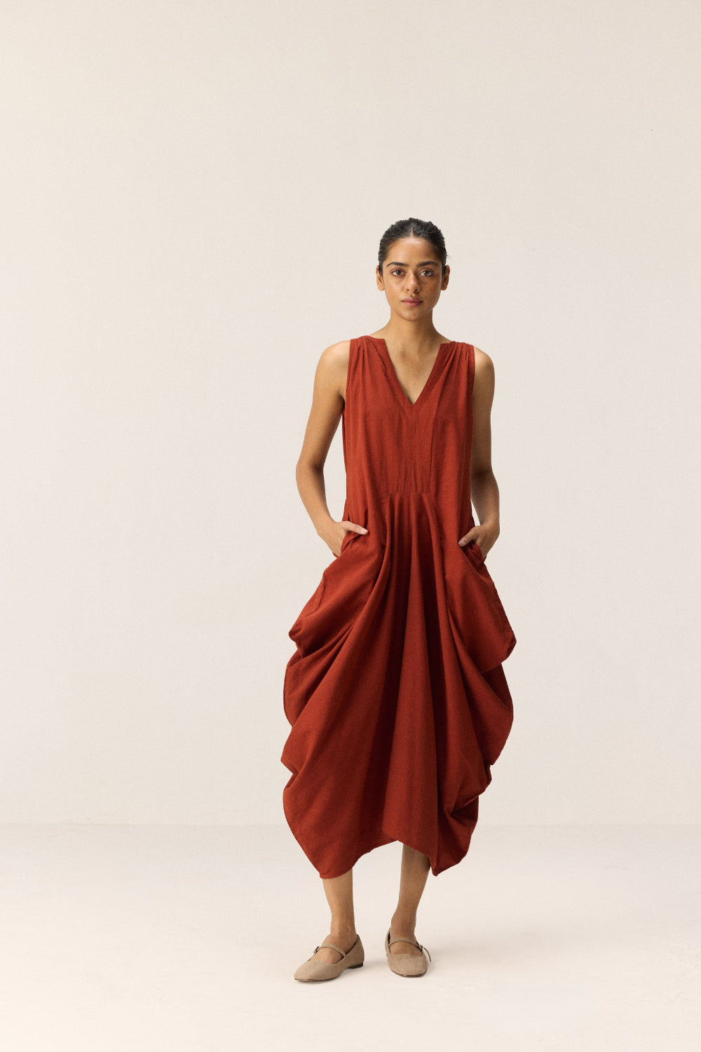 Crafted in soft, breathable cotton mul, this cowl dress drapes effortlessly in a rich brick red hue. Lightweight yet structured, it moves with ease and brings quiet sophistication to everyday dressing.