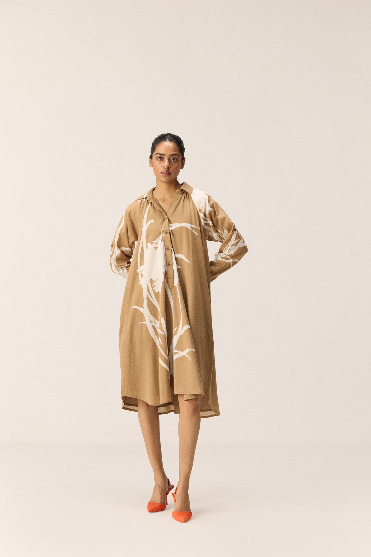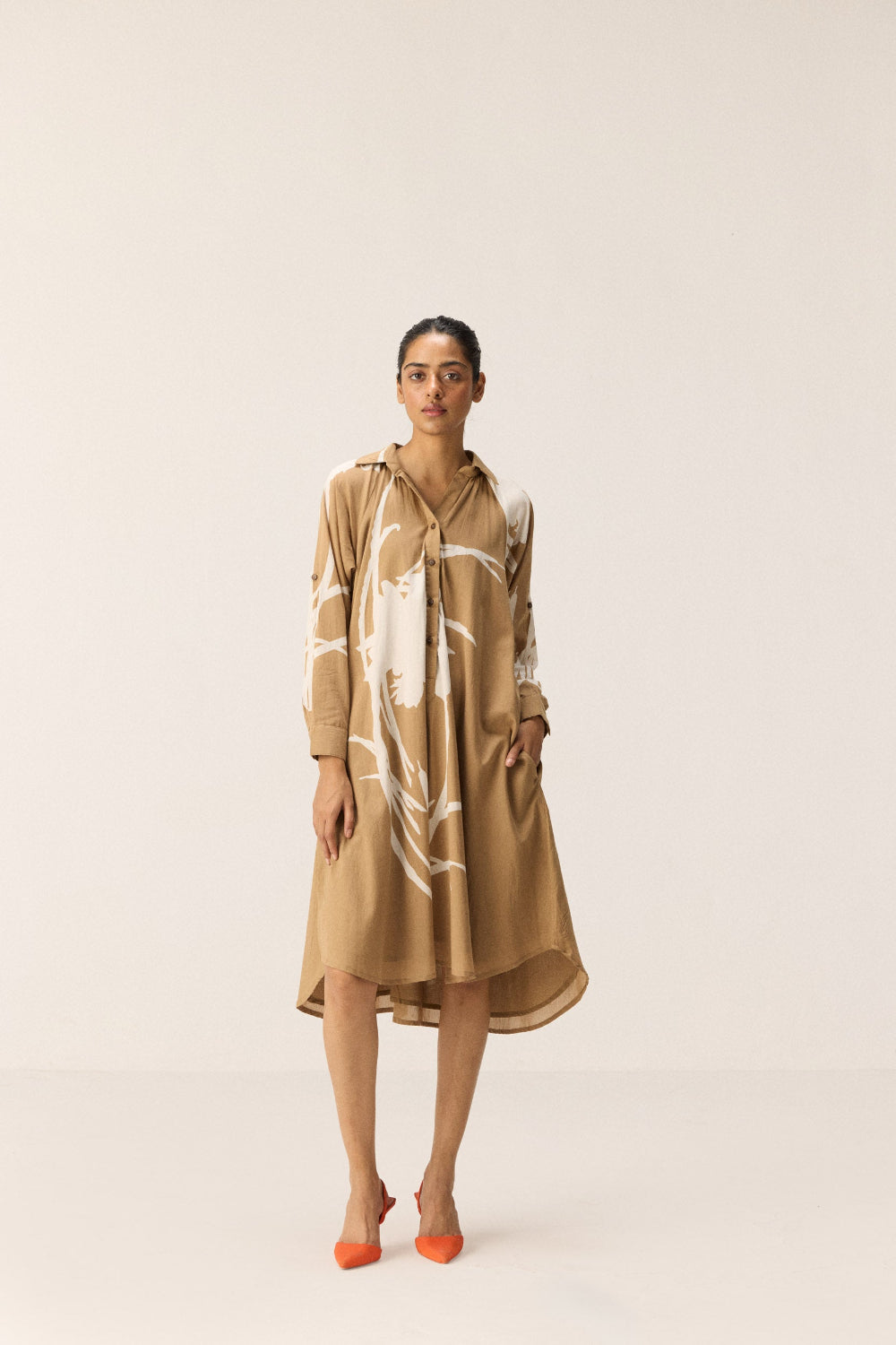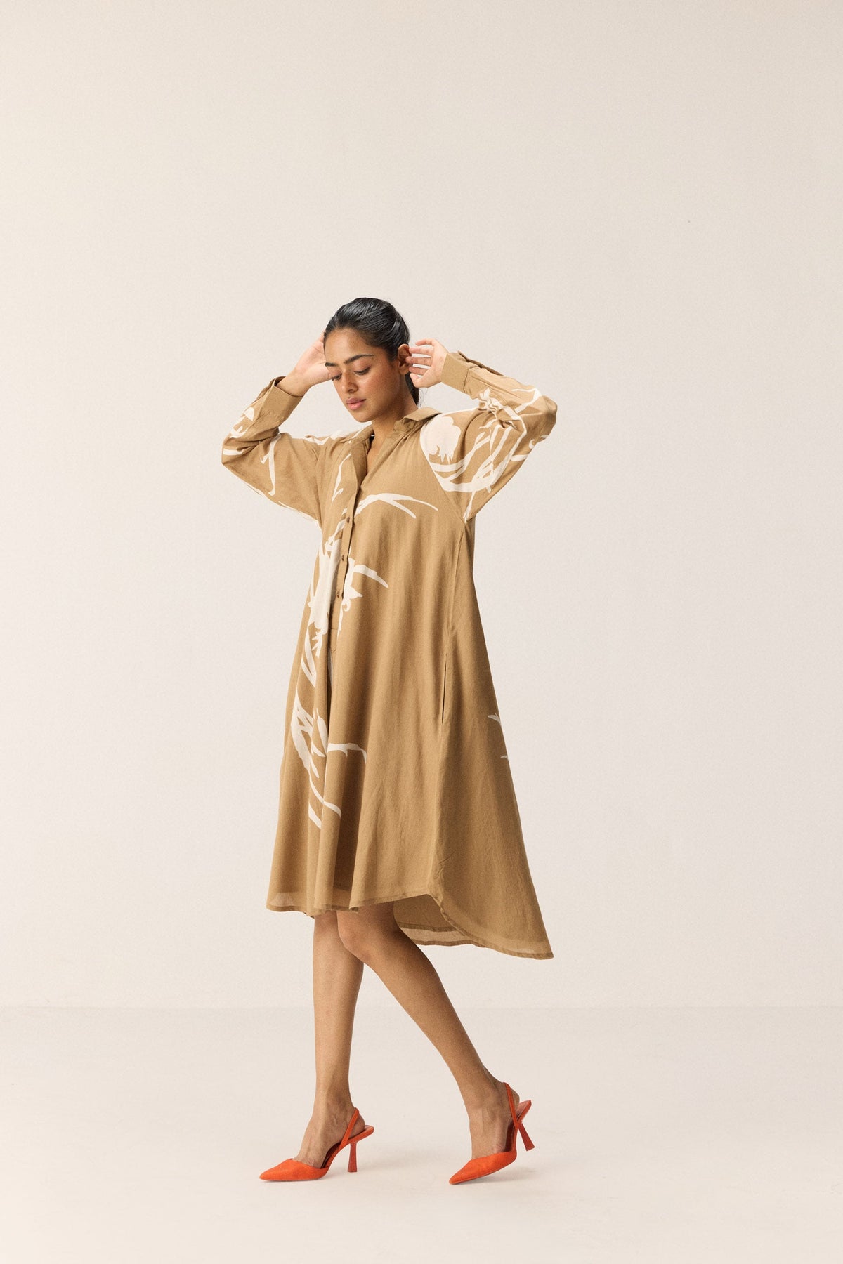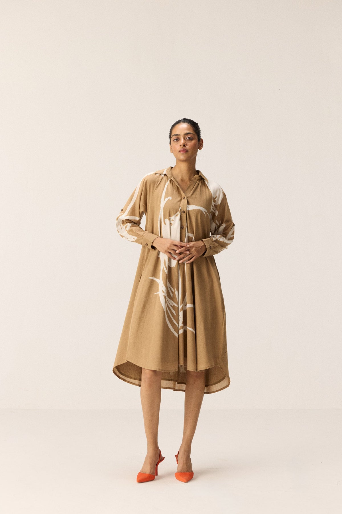 A versatile camel brown shirt dress featuring an abstract white print on the front. With classic collars and practical pockets, it’s designed for effortless style and comfort—perfect for relaxed day outings.