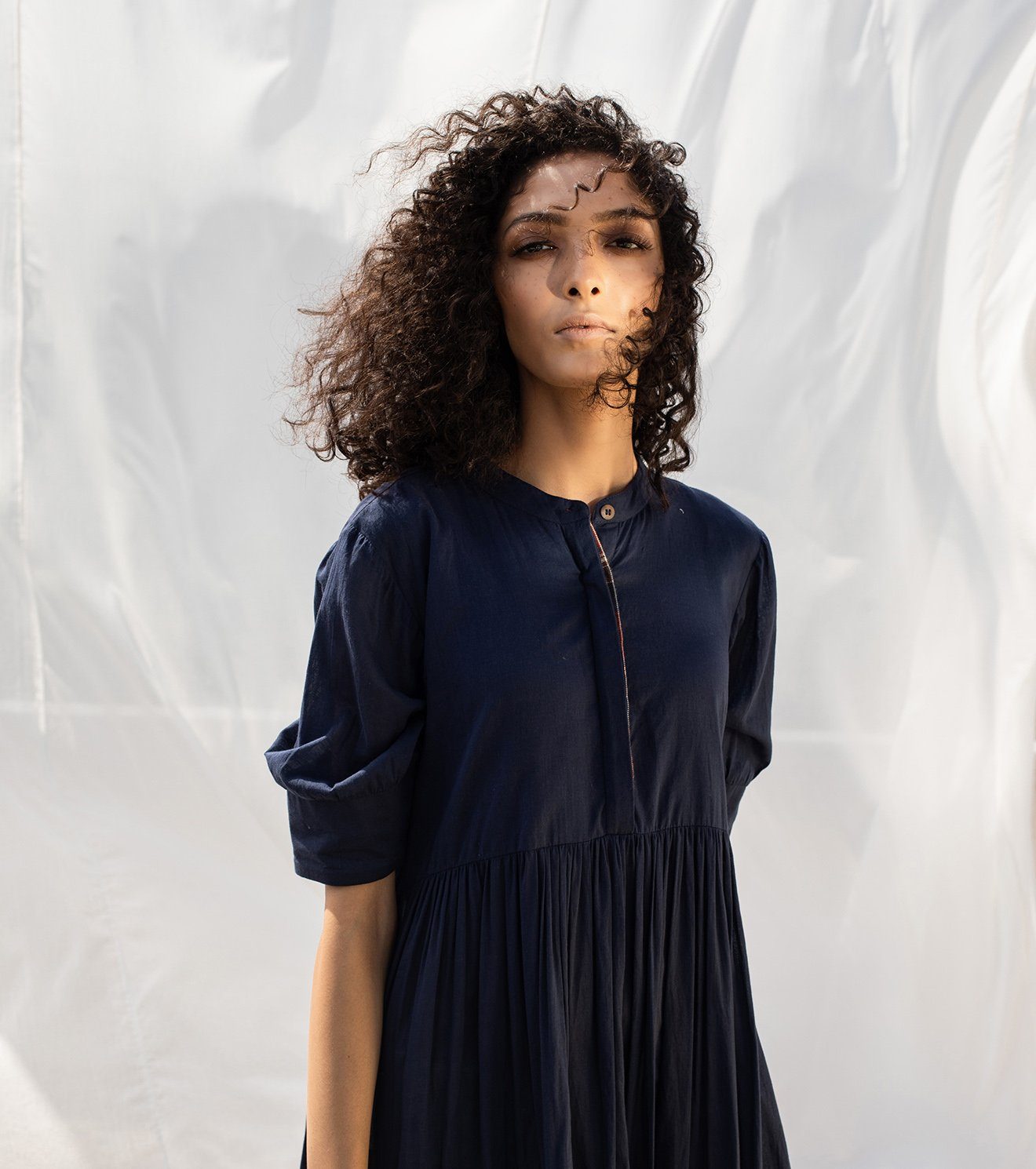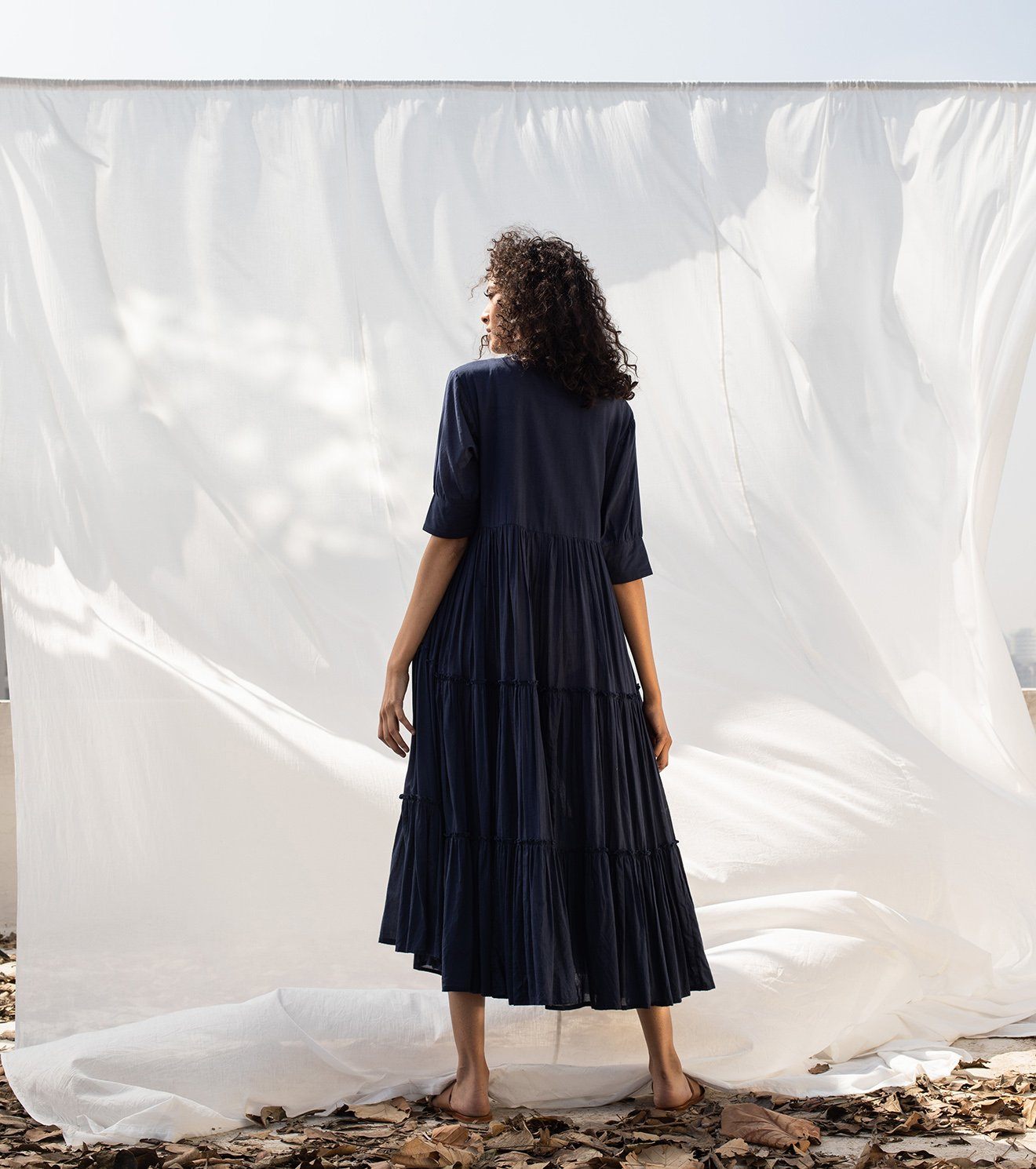 Navy mulmul tiered midi with a mandarin collar, invisible placket and three-fourth sleeves.