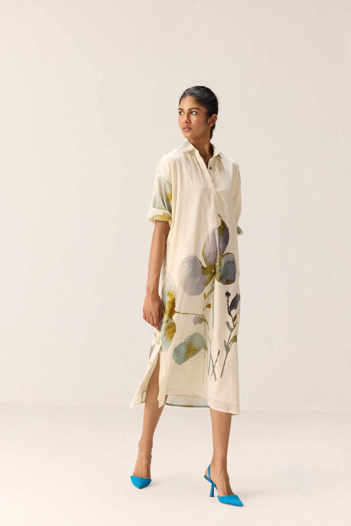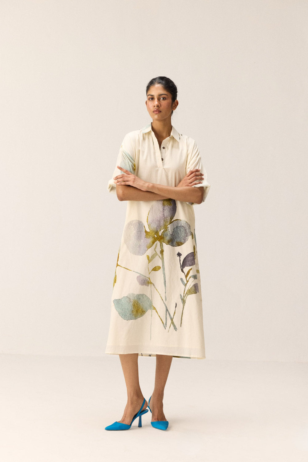 An elegant off-white dress crafted in soft cotton mul, featuring a structured collar and three-button placket on the front. Hand-painted floral motifs add a subtle charm to the bodice, bringing a touch of artistry to this everyday silhouette.