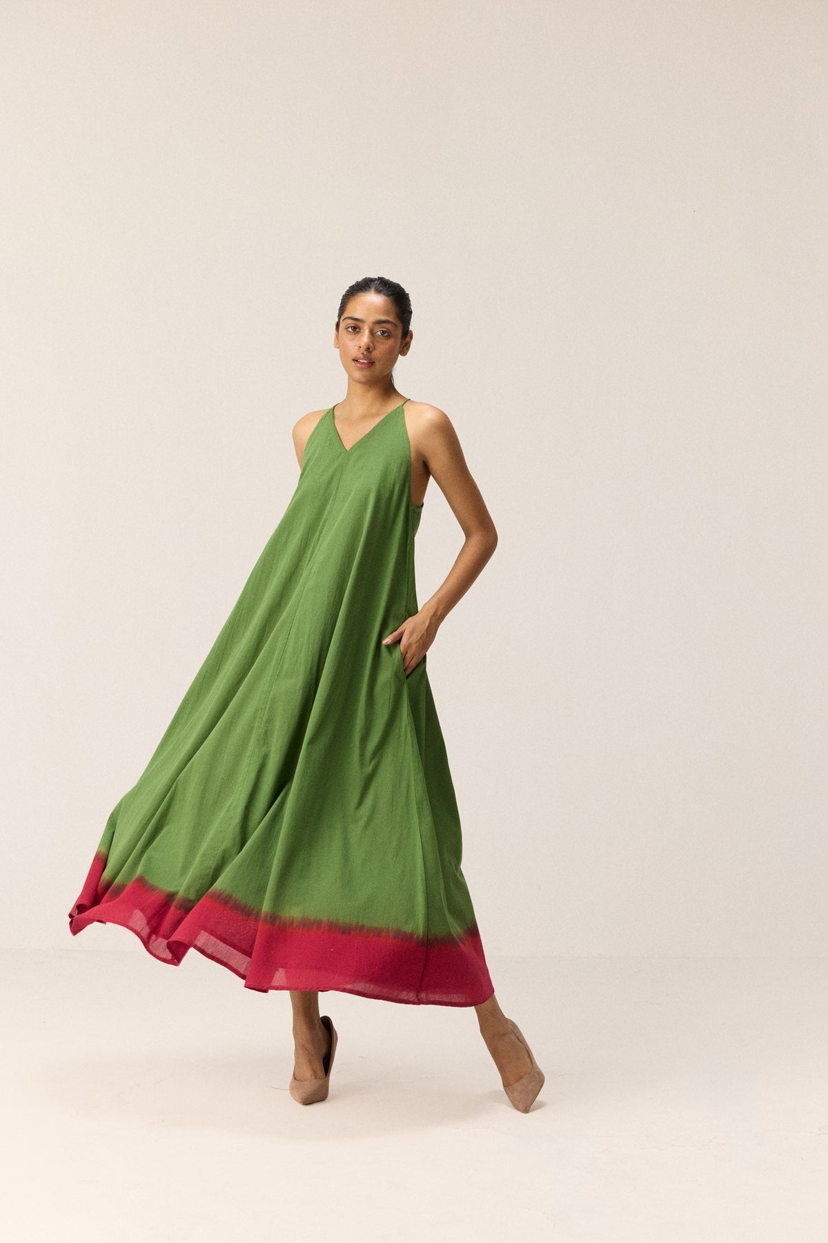 A flowy strappy gown crafted in soft cotton mul, featuring a unique dip-dyed effect that fades from fresh green to soft pink. The cross-back design adds elegance, while side seam pockets offer functionality without compromising the silhouette.